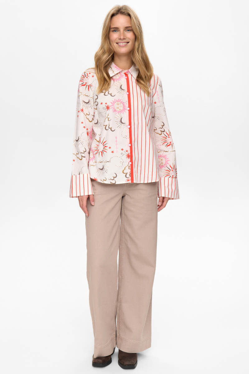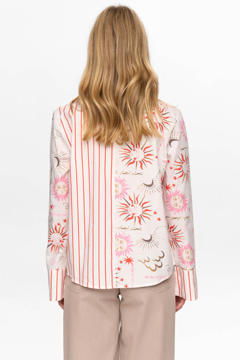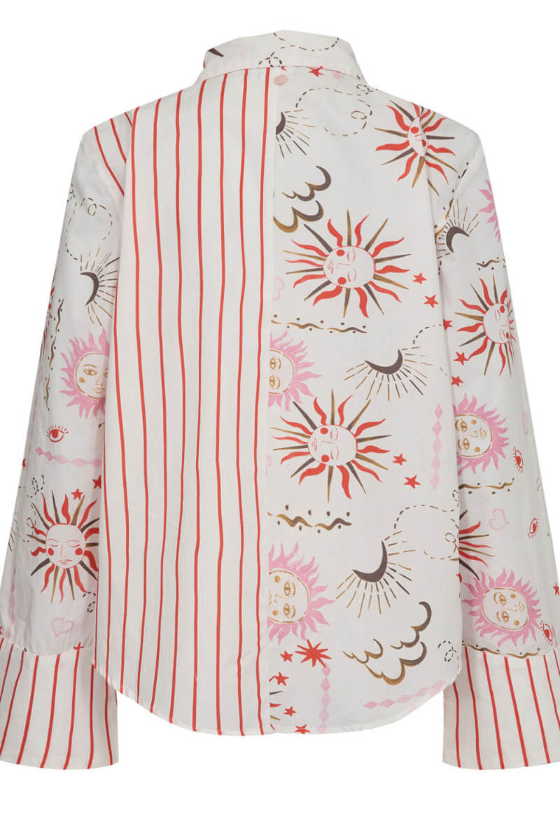 En unik och lekfull vit skjorta med en spännande mix av mönster. Ena sidan är randig medan den andra är vackert mönstrad. Den dekorativa kragen och de vida ärmarna adderar en elegant och modern känsla. Perfekt att bära till enkla jeans eller skräddade byxor för en balanserad look.