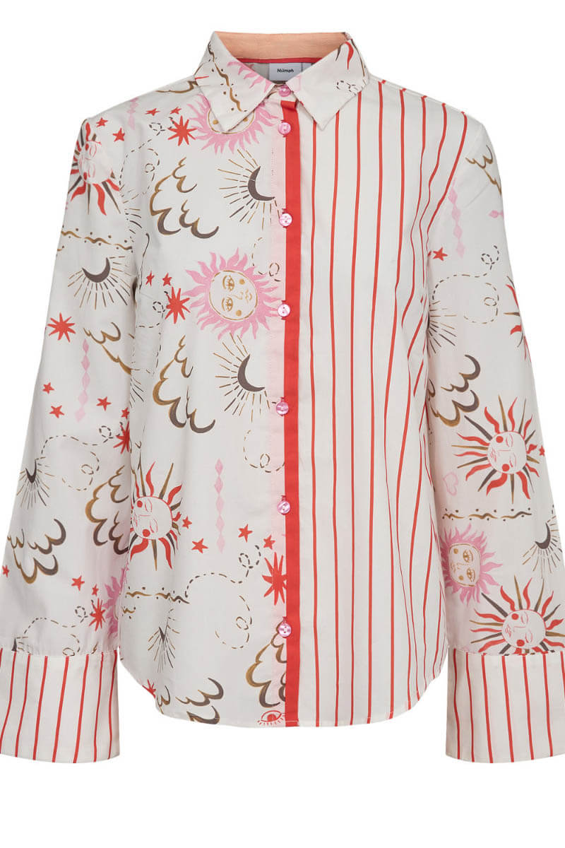 Vit skjorta med mixat mönster, mönstrad krage och vida ärmar från Nümph.- Normal i storlek, lös passform