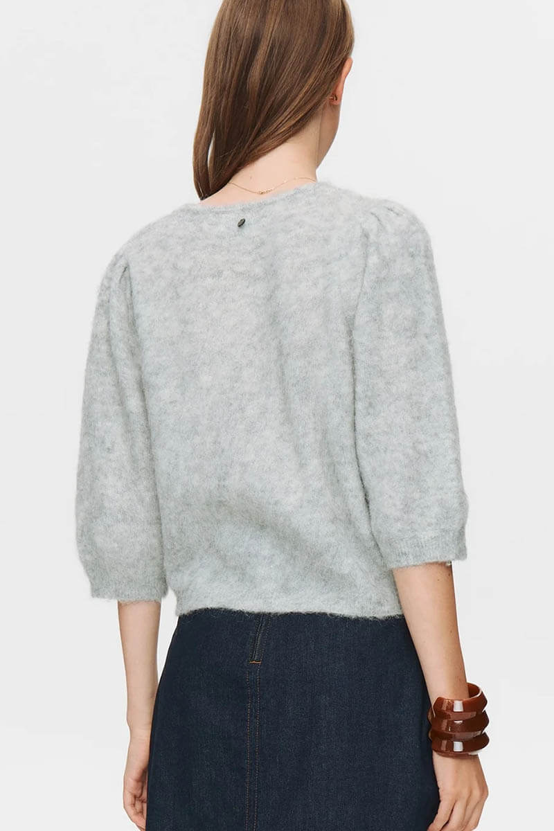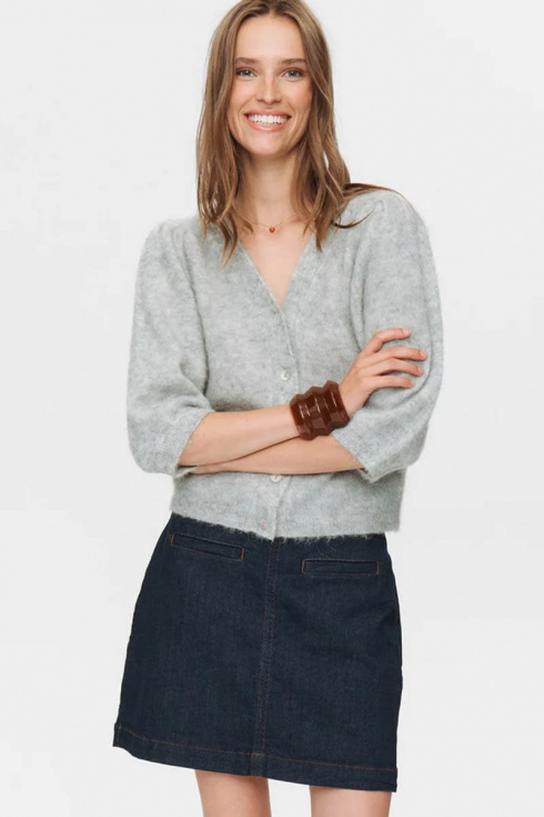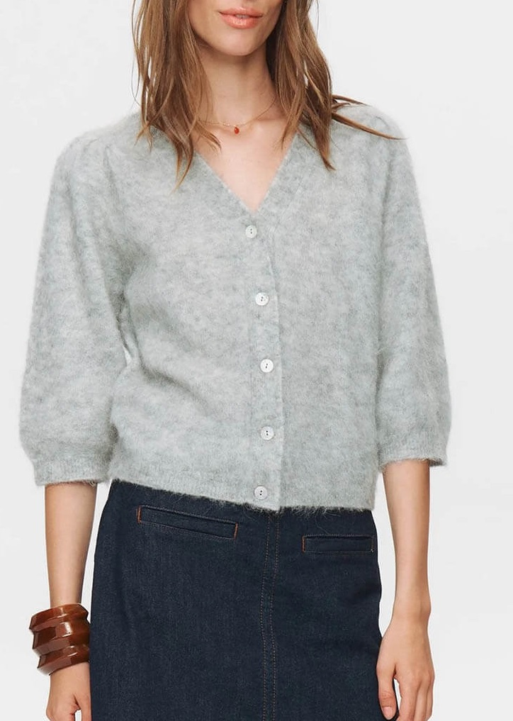 En klassiker, den grå koftan här i en mer feminin modell.En mjuk härlig kofta du har som den är eller utanpå en blus.