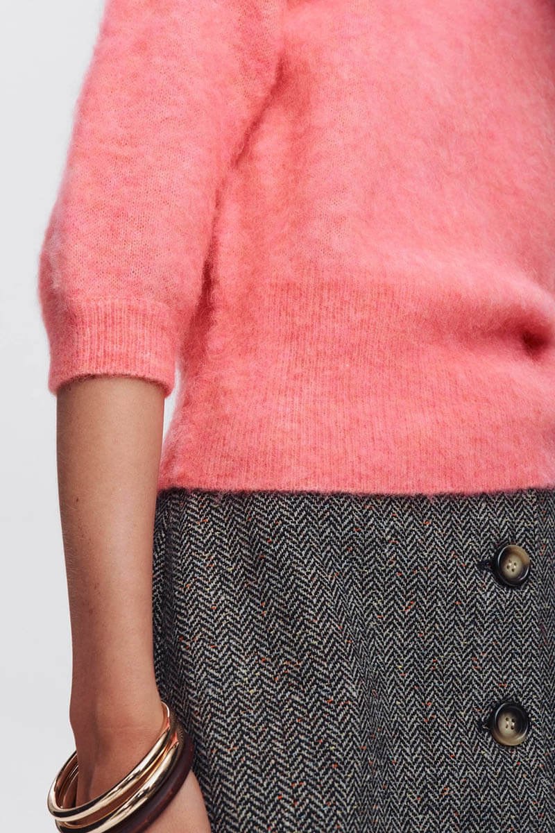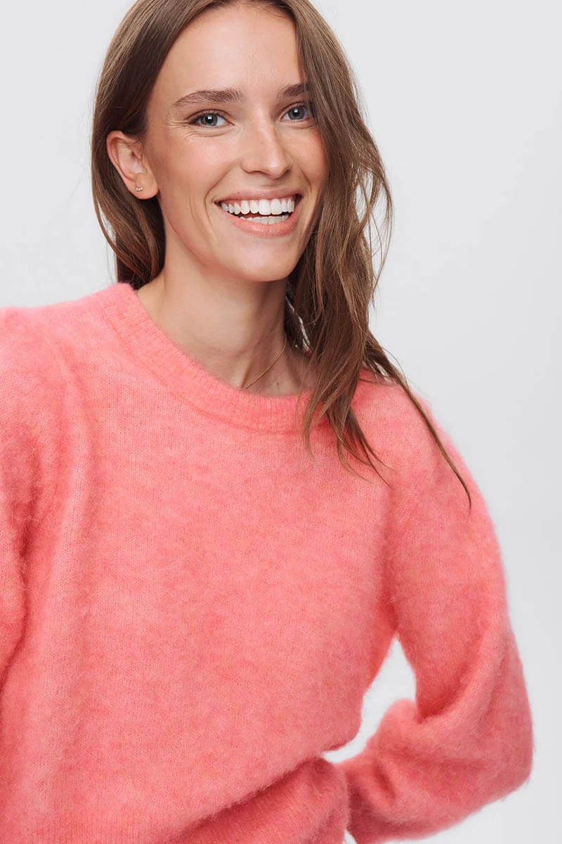 Stickad tröja i färgen Pink Lemonade som kombinerar mjuk komfort med modern elegans. Den borstade ytan ger en lyxig känsla och en avslappnat stilren look, perfekt både till vardags och kontor.