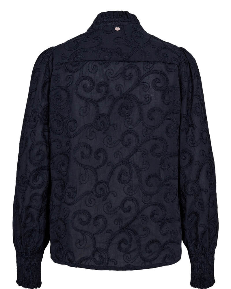 En blus med ett ton-i-ton broderat mönster som påminner om grenar. Blusen har en V-ringning med dekorativa knappar framtill och ärmar med mudd nedtil. Style med antingen kjol eller byxa, en perfekt vardagsblus.Blus i bomull med broderat mönster och V-ringning med knappar framtill.
