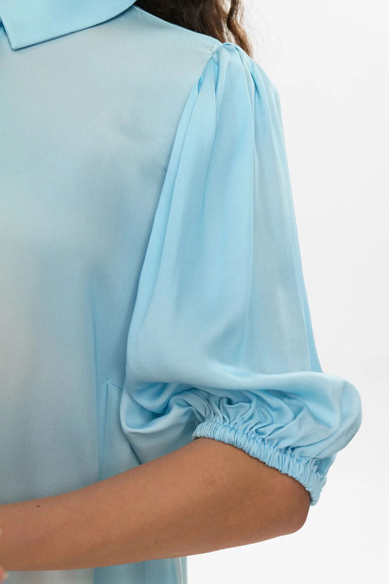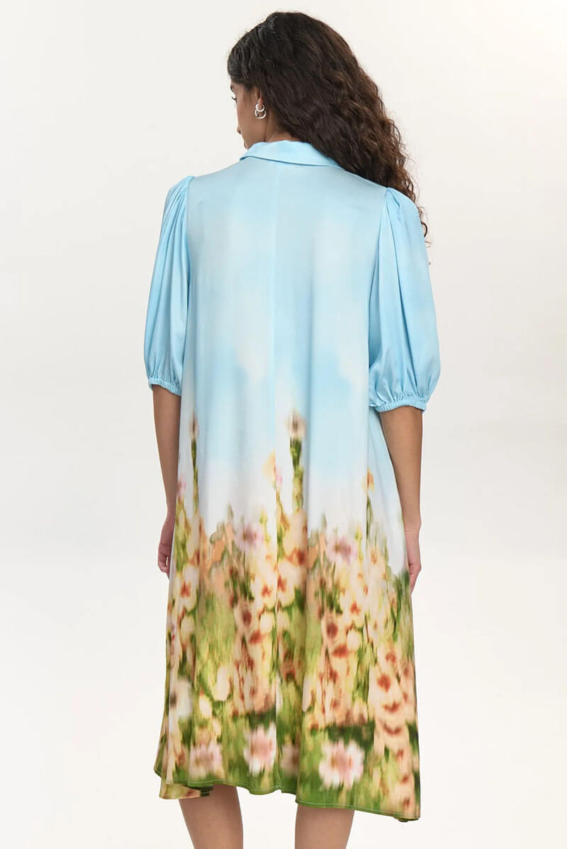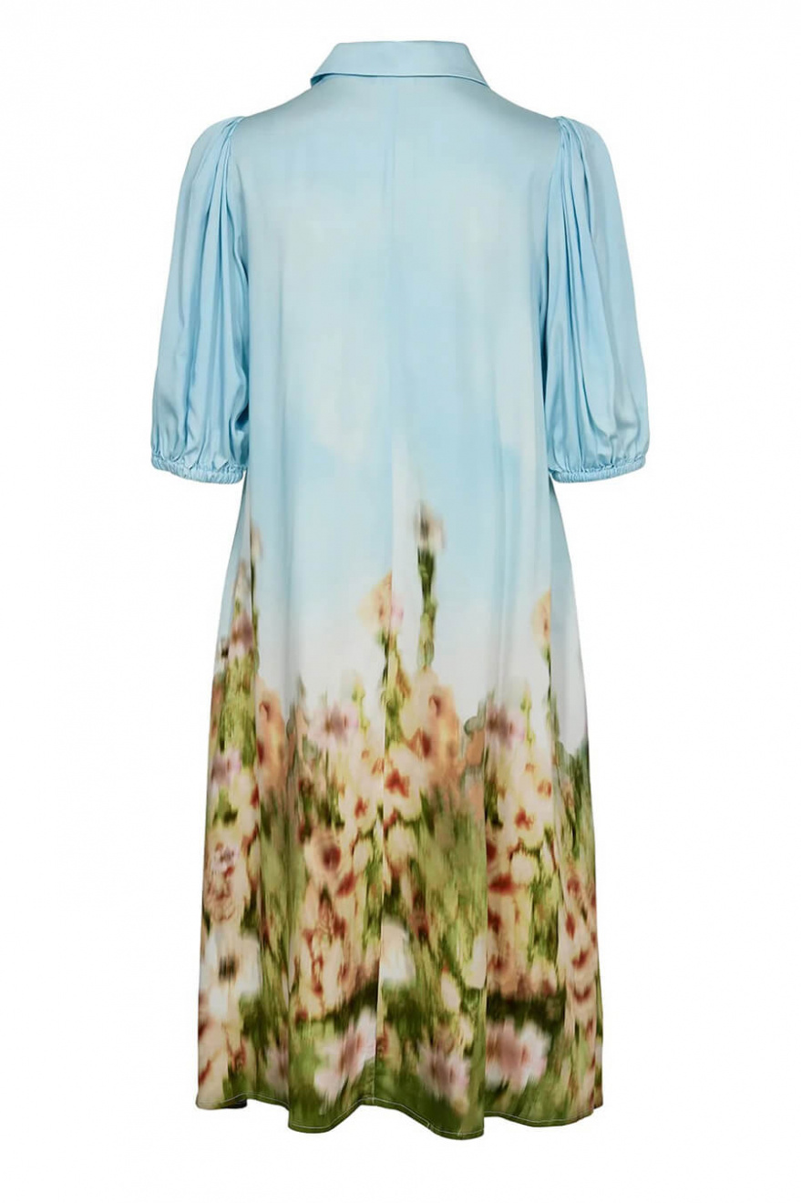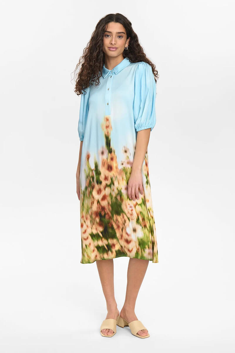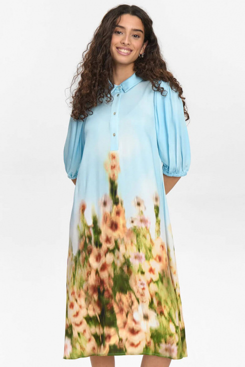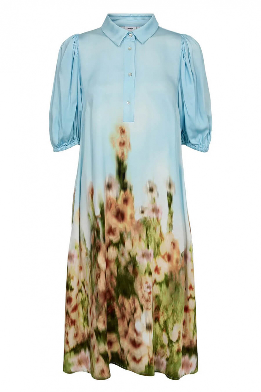 En drömmig klänning i mjuk viskos med blommönster och puffärmar. Den lediga passformen ger en avslappnad men elegant känsla. Perfekt för allt från sommarfester till citypromenader – en klänning som gör jobbet, oavsett tillfälle.Mönstrad klänning i viskos med krage, knappar fram, korta puffiga ärmar och lös passform från Nümph.