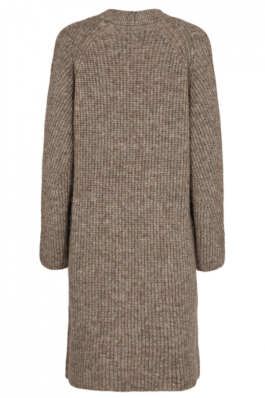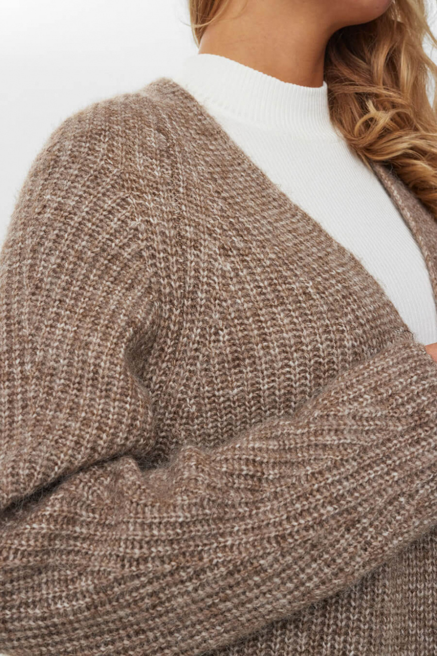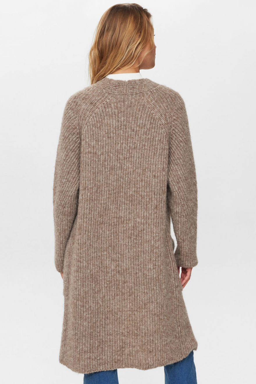 Denna mysiga, långärmade kofta är perfekt för lager-på-lager under kyligare dagar. Den ribbstickade designen ger både struktur och komfort, medan fickorna tillför funktionalitet. Ett mångsidigt plagg som smidigt kombineras med både jeans och klänningar!Stickad mjuk kofta i en öppen modell med fickor fram, ledig passform och raglanärmar från Nümph.