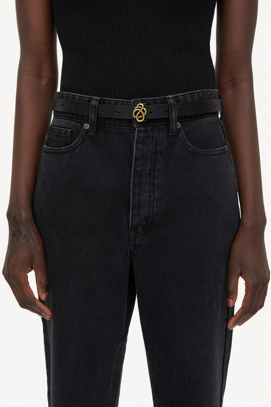 Justerbart bälte i slätt läder med polerat guldfärgat spänne från By Malene Birger.- Storlek: 1,8x110 cm