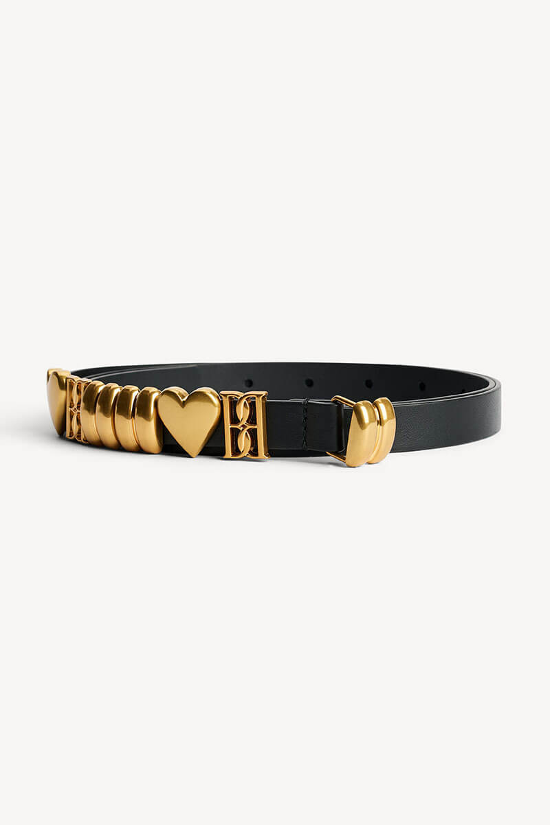 Ett exklusivt bälte i narvat läder som pryds av dekorativa monogram-emblem i guldton. En tidlös accessoar som lyfter både vardagslooken och festfina outfits, och som bara blir vackrare med åren.
