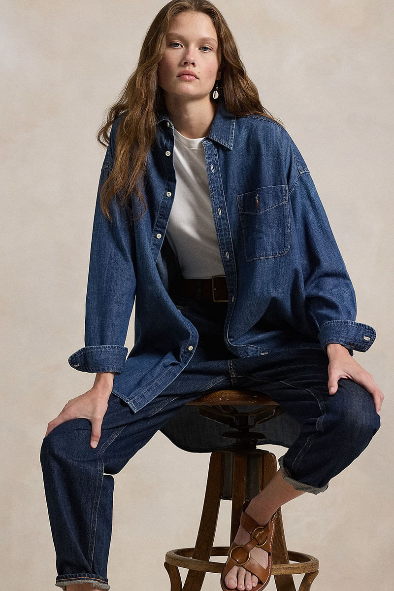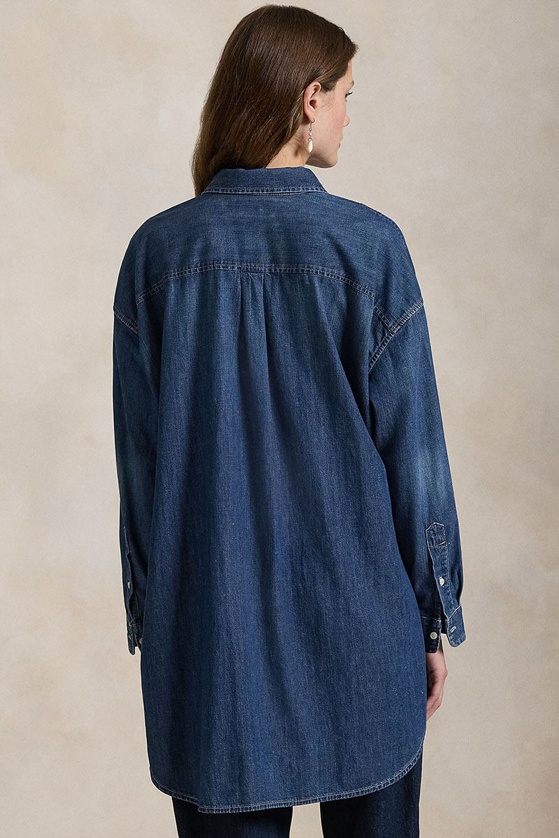 Den ultimata mörkblå jeansskjortan för en effortless stil. Med sin oversized passform och tidlösa denim skapar den en sofistikerad men avslappnad look. Perfekt att bära öppen över en t-shirt eller som den är.Jeansskjorta i bomull med överdimensionerad passform, fallande axelsömmar, bröstficka, längre fall bak och broderad logga från Polo Ralph Lauren.