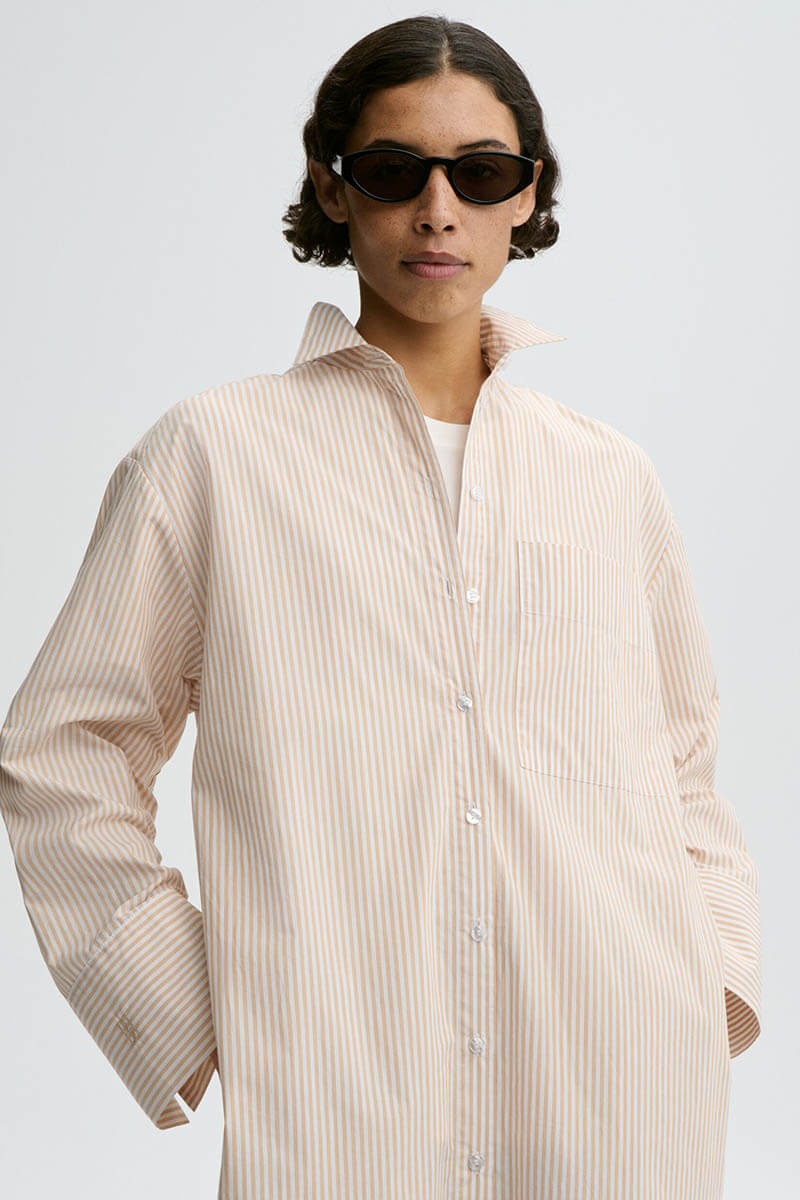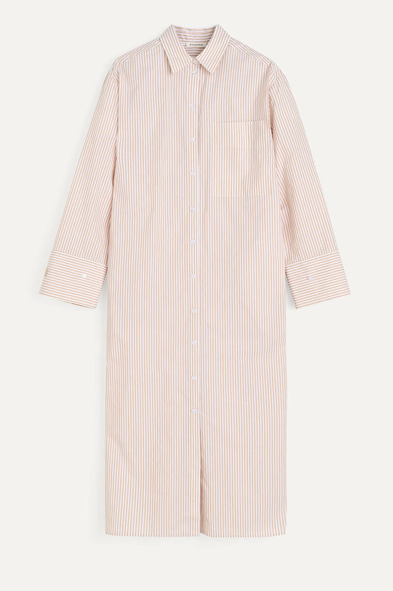 Tillverkad i krispig och luftig ekologisk bomull, kombinerar denna knälånga skjortklänning stil och komfort med praktiska detaljer: en frontficka, justerbara ärmslut, sidofickor och höga slitsar på sidorna.
