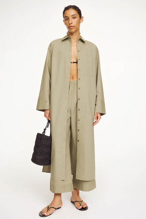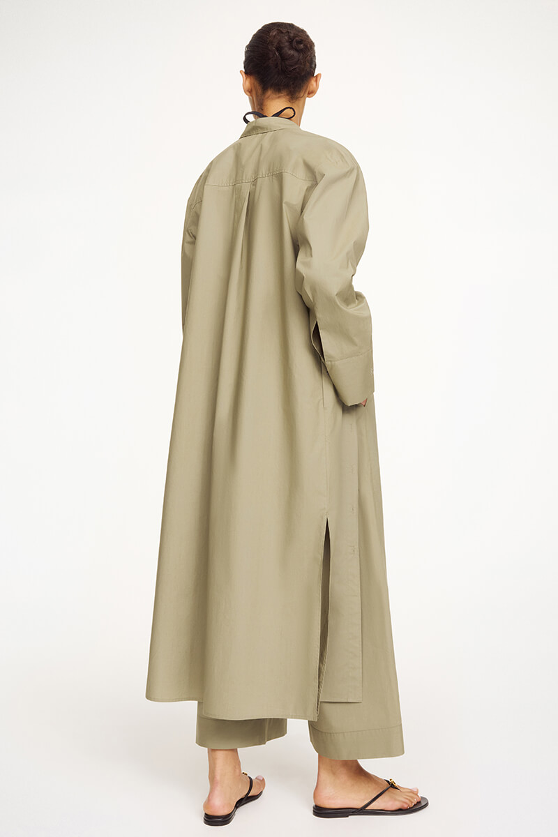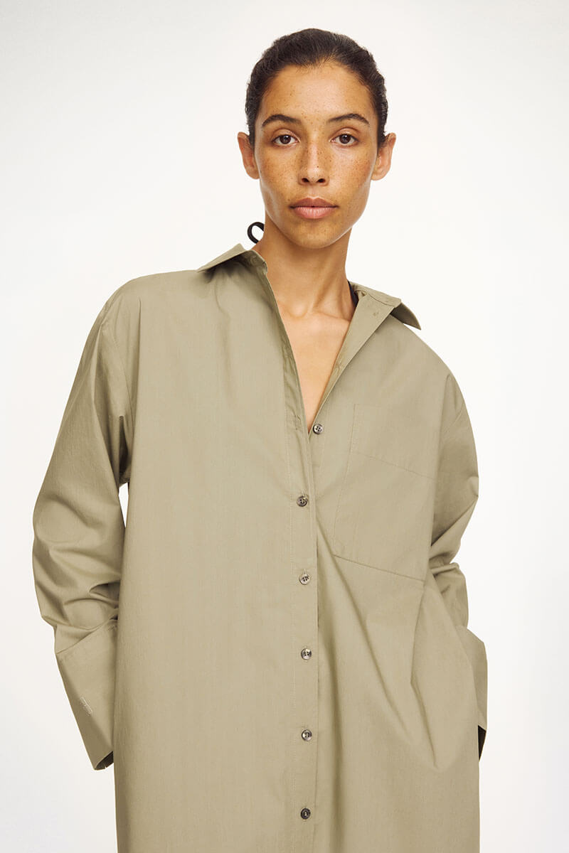Tillverkad i krispig och luftig ekologisk bomull, kombinerar denna knälånga skjortklänning stil och komfort med praktiska detaljer: en frontficka, justerbara ärmslut, sidofickor och höga slitsar på sidorna.