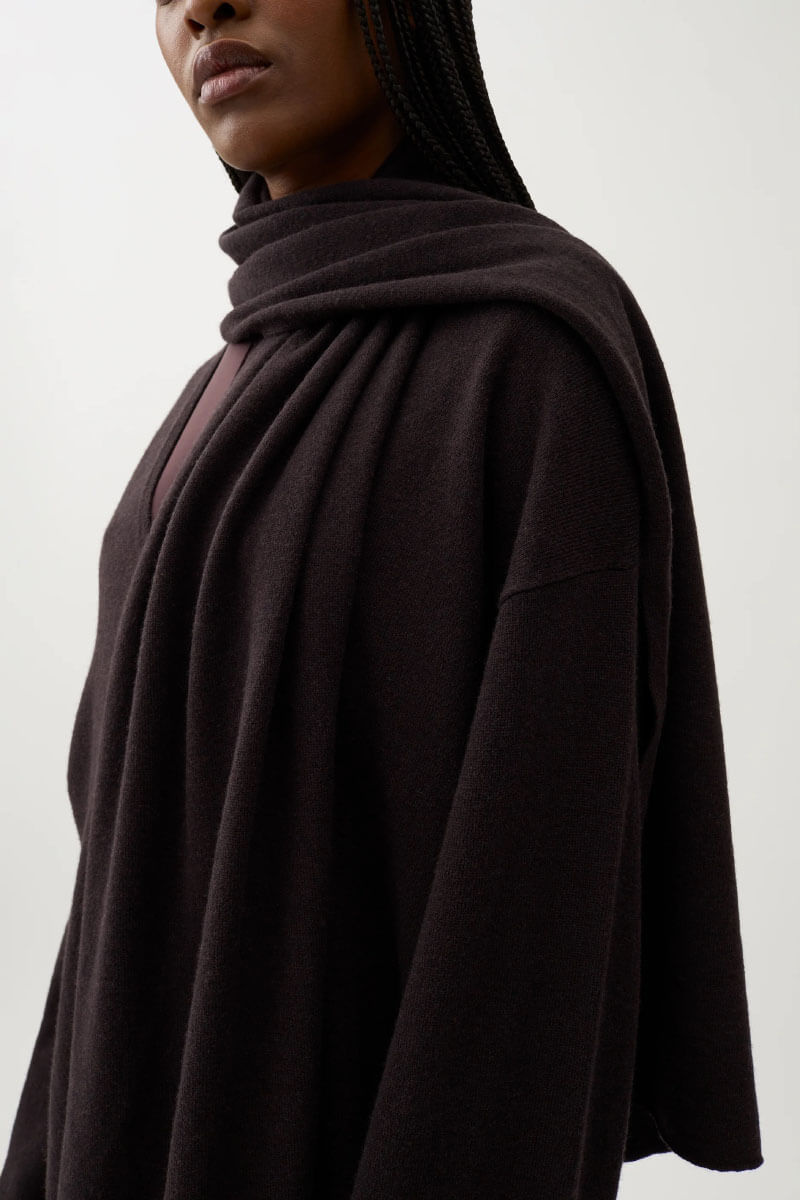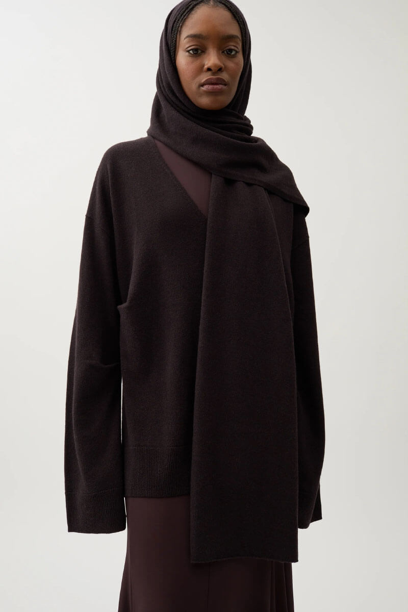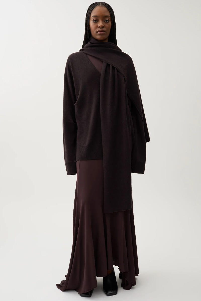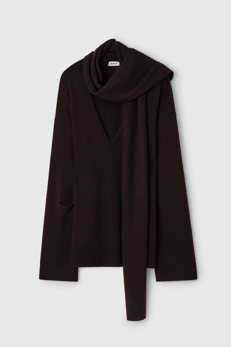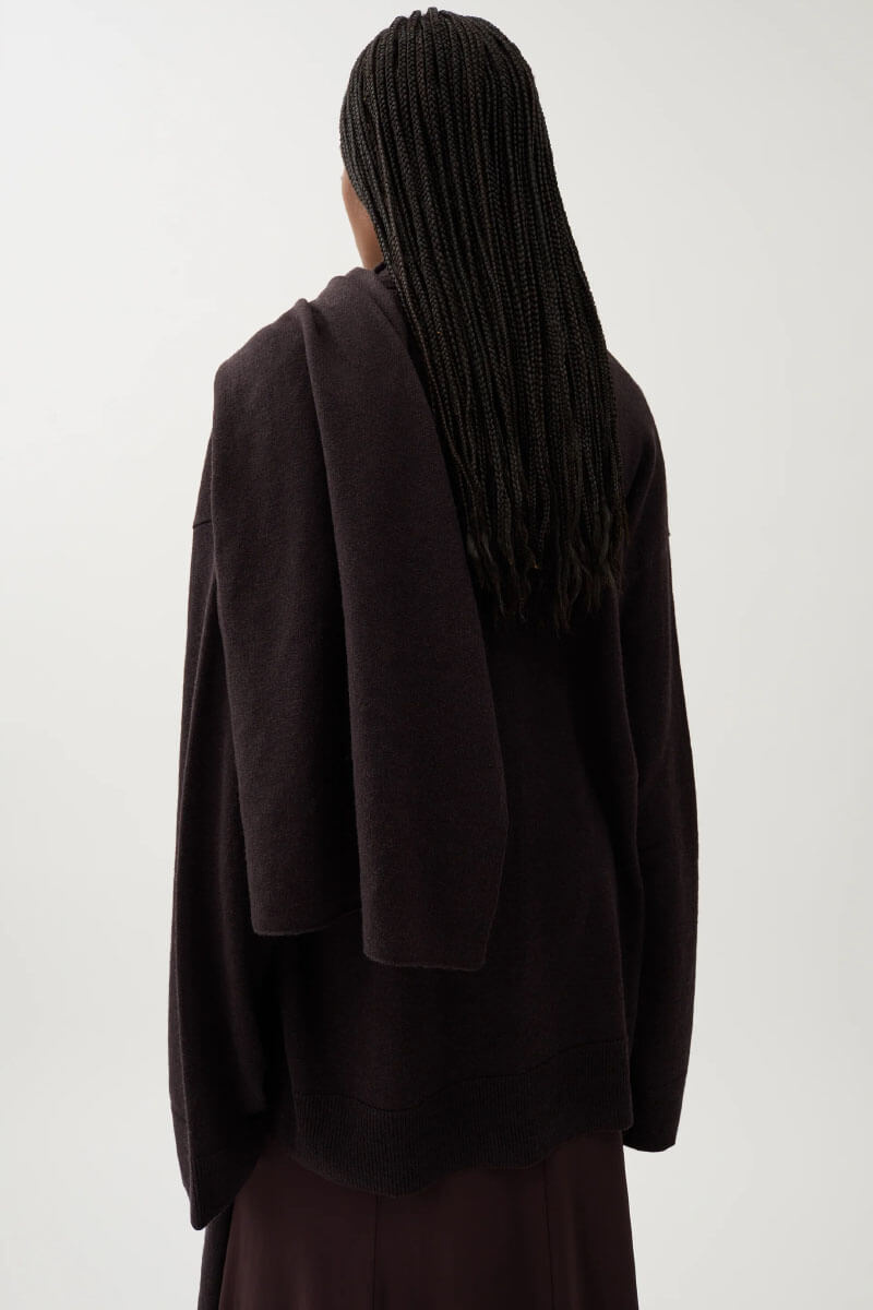 Mörkbrun tröja i mjuk merinoull med lös passform. Stilfull med fallande axelsömmar och matchande sjal för mångsidig styling. Kombinera med smala byxor och stövletter för en elegant, avslappnad och tidlös look.Stickad tröja i mjuk merinoull med lös passform, v-ringning, ribbstickade kanter, fallande axelsömmar och matchande sjal från Rodebjer.