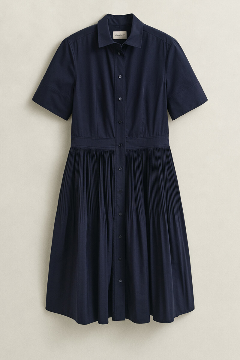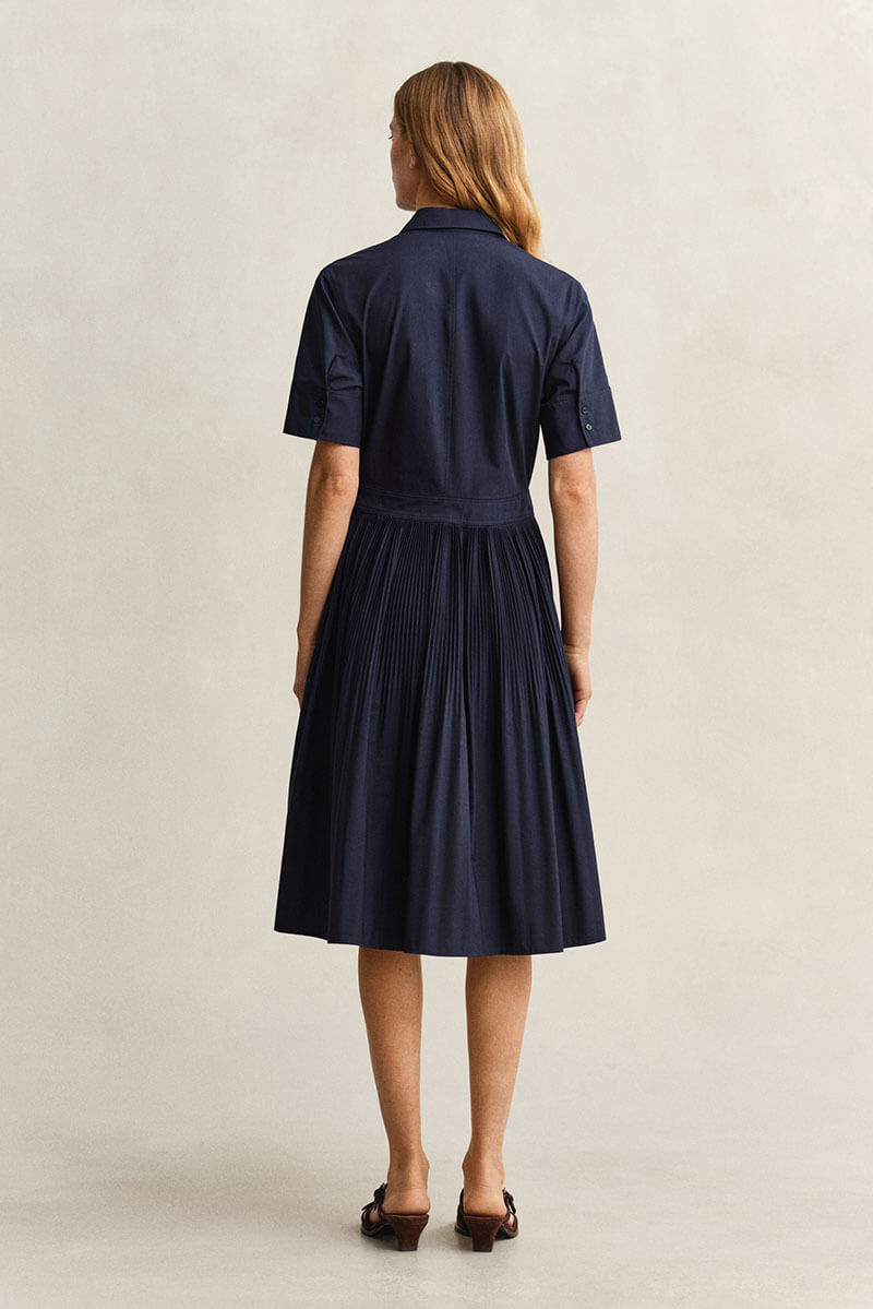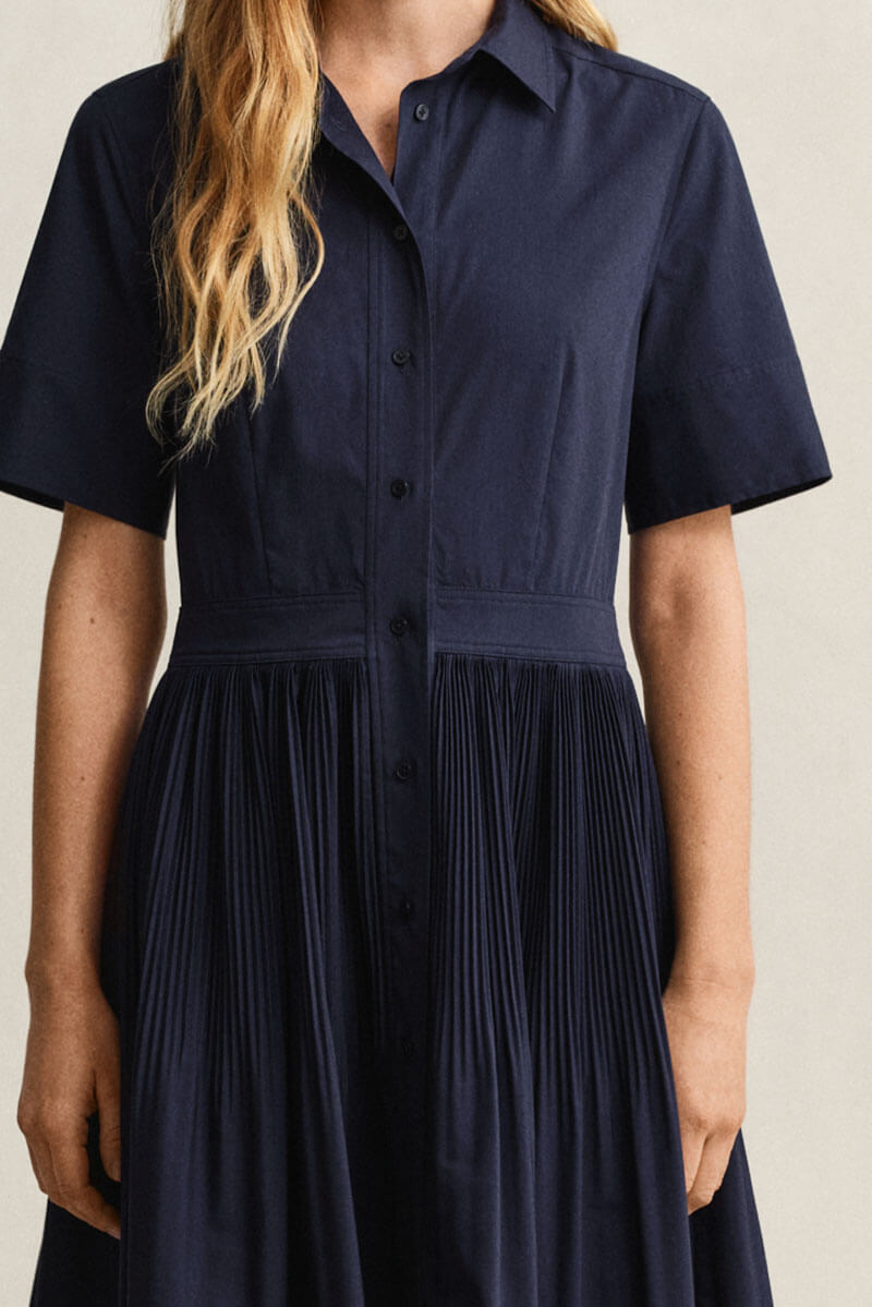 Modellen har en normal passform och en längd som går nedanför knät. Klänningen har en klassisk krage, korta ärmar och en knapplösning framtill med knappar av återvunnen polyester.