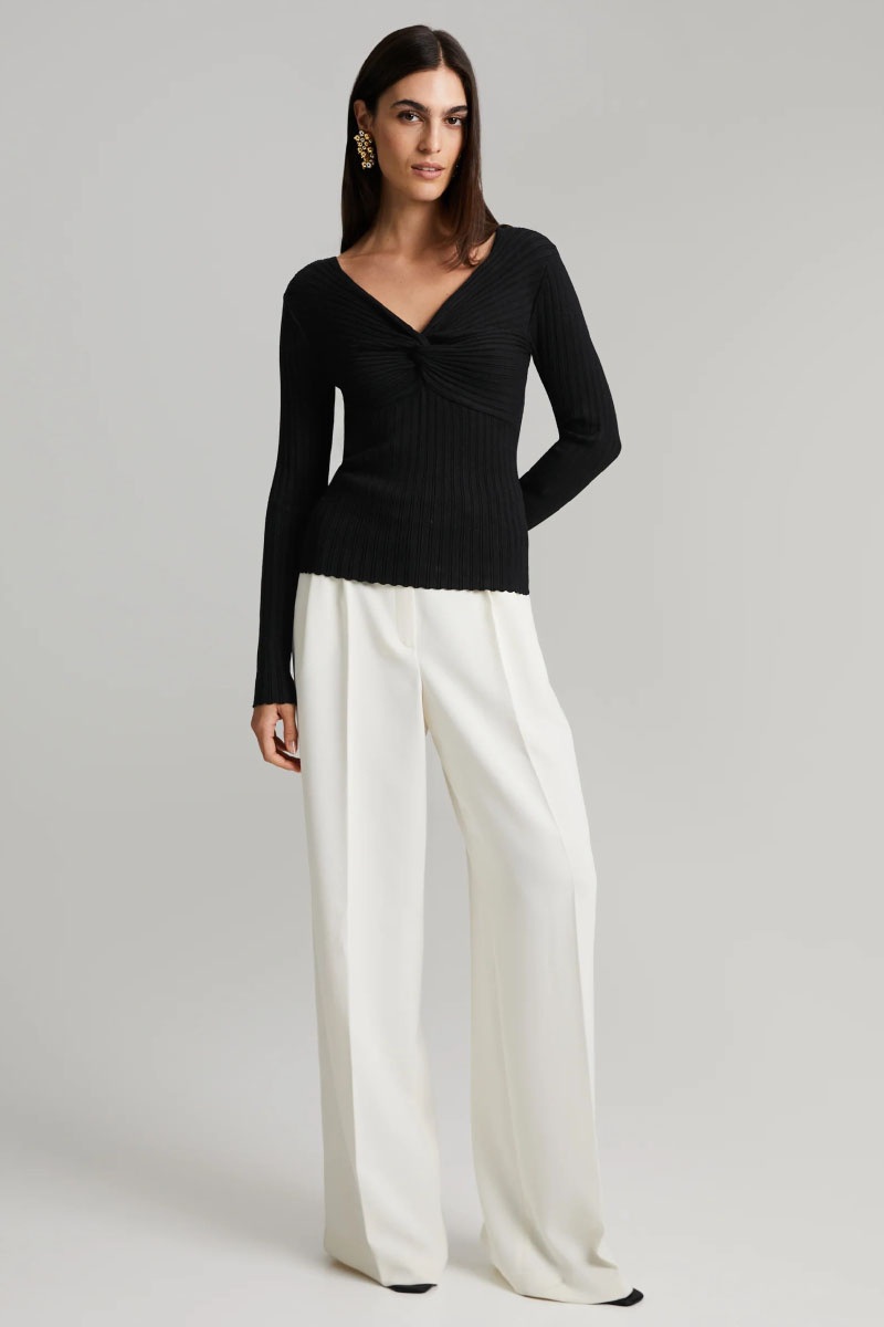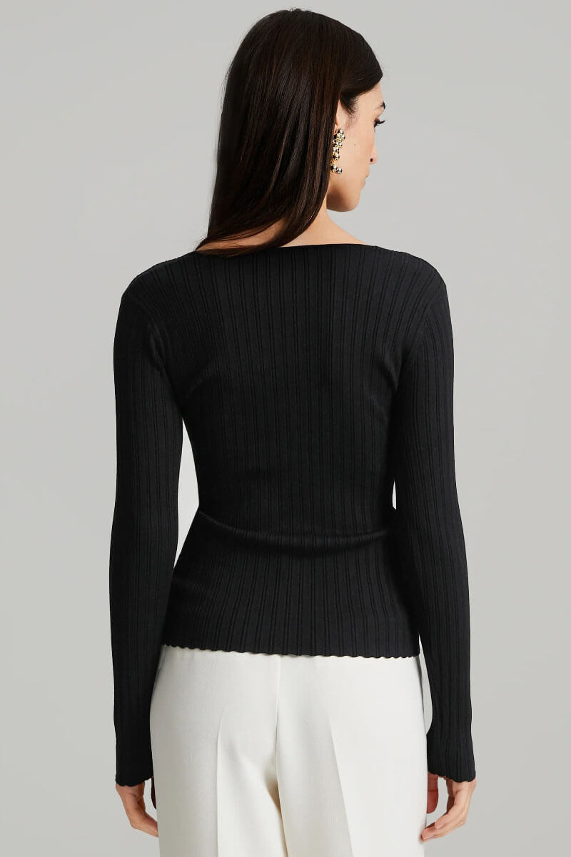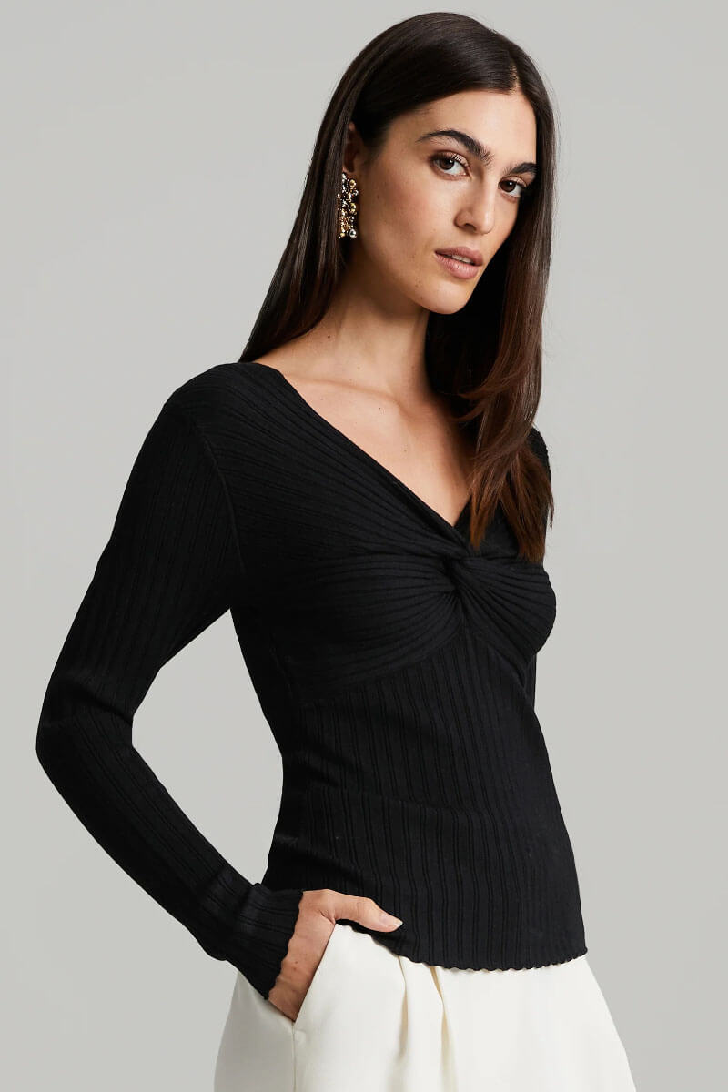 En feminin och elegant ribbad blus i stretchigt material med kroppsnära passform. Den dekorativa knuten under bysten skapar en smickrande silhuett och ger ett sofistikerat uttryck. Perfekt att bära både till vardags och till mer uppklädda tillfällen.Ribbad blus med knutdetalj och figurnära passform från Andiata.