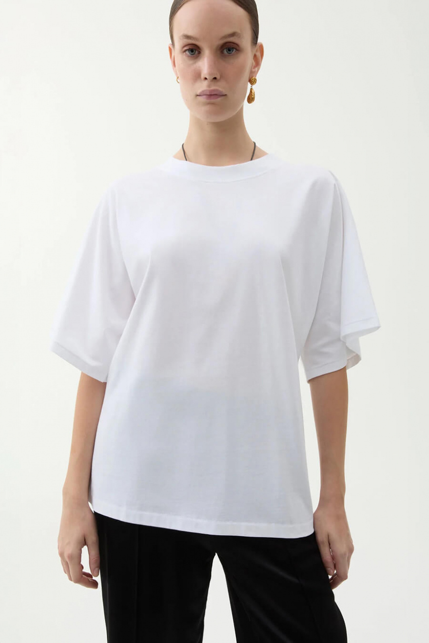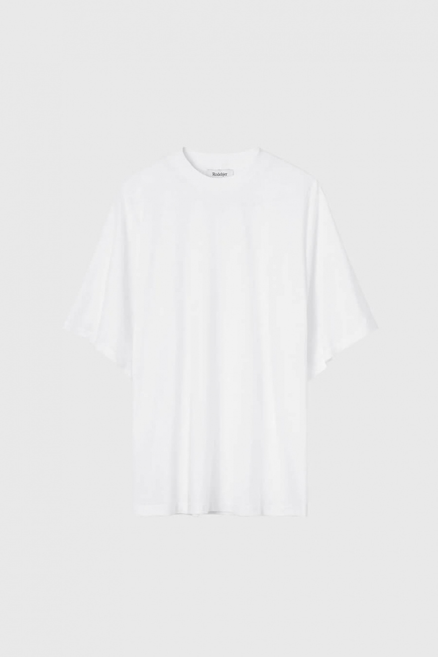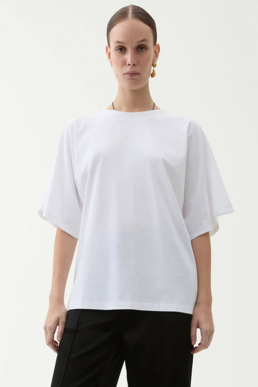 Denna minimalistiska vita topp är perfekt för en tidlös look. Stilren design möter komfort, idealisk för både vardag och fest. Ett måste i garderoben – matcha med skräddade byxor för en modern touch.Topp i ekologisk bomull med bred ribbstickad halsringning, vida korta ärmar och oversize fit från Rodebjer.
