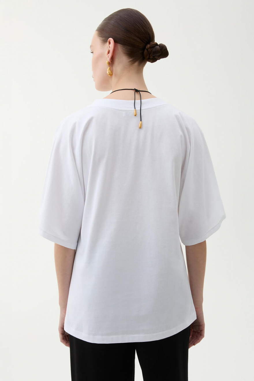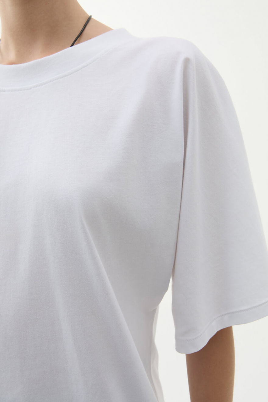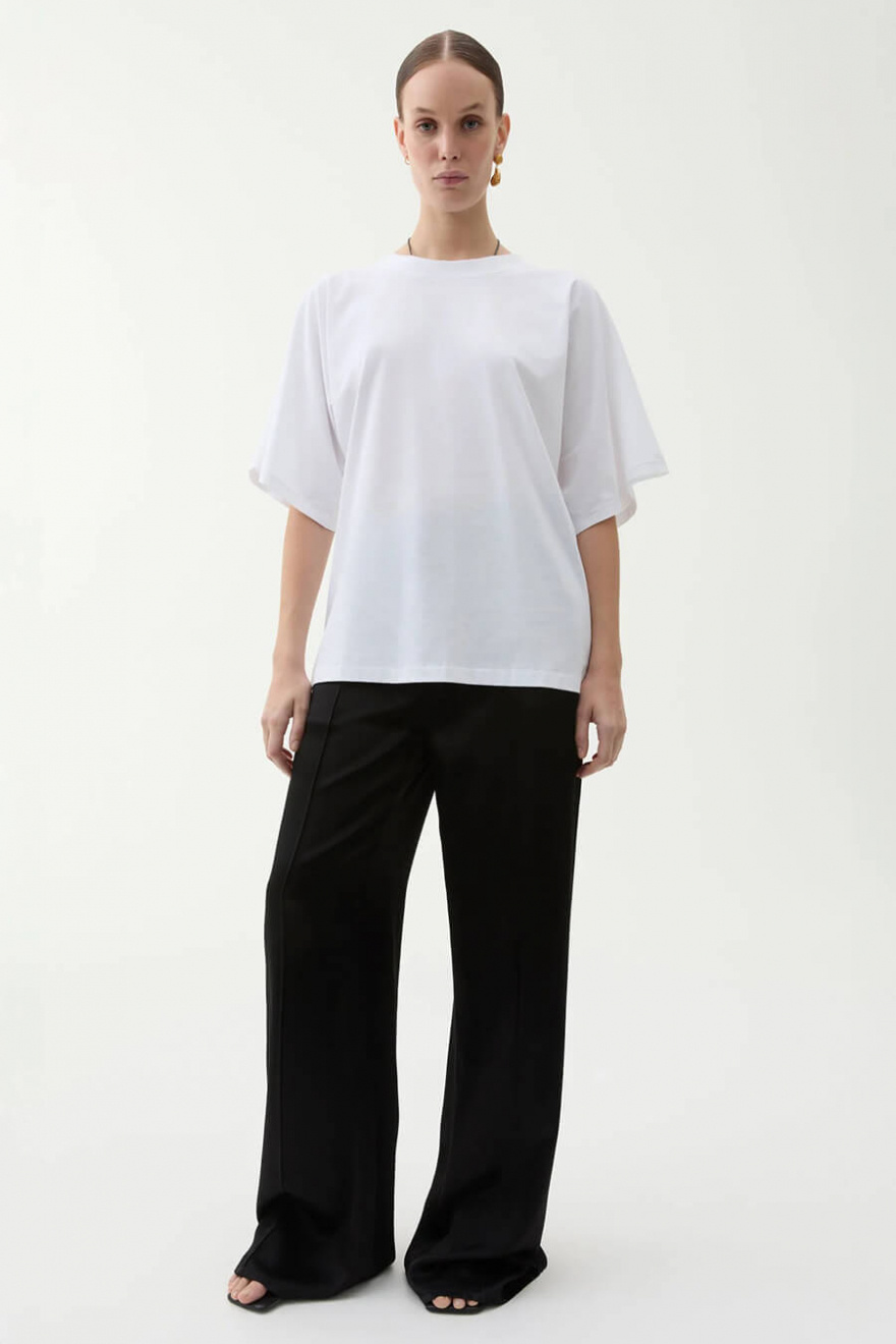 Denna minimalistiska vita topp är perfekt för en tidlös look. Stilren design möter komfort, idealisk för både vardag och fest. Ett måste i garderoben – matcha med skräddade byxor för en modern touch.Topp i ekologisk bomull med bred ribbstickad halsringning, vida korta ärmar och oversize fit från Rodebjer.