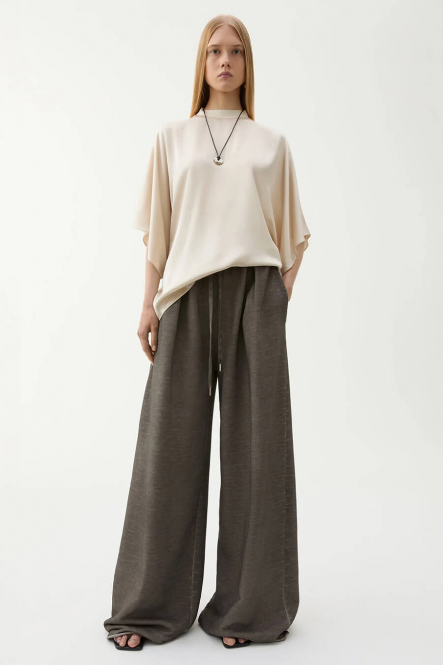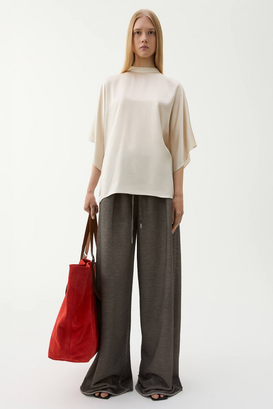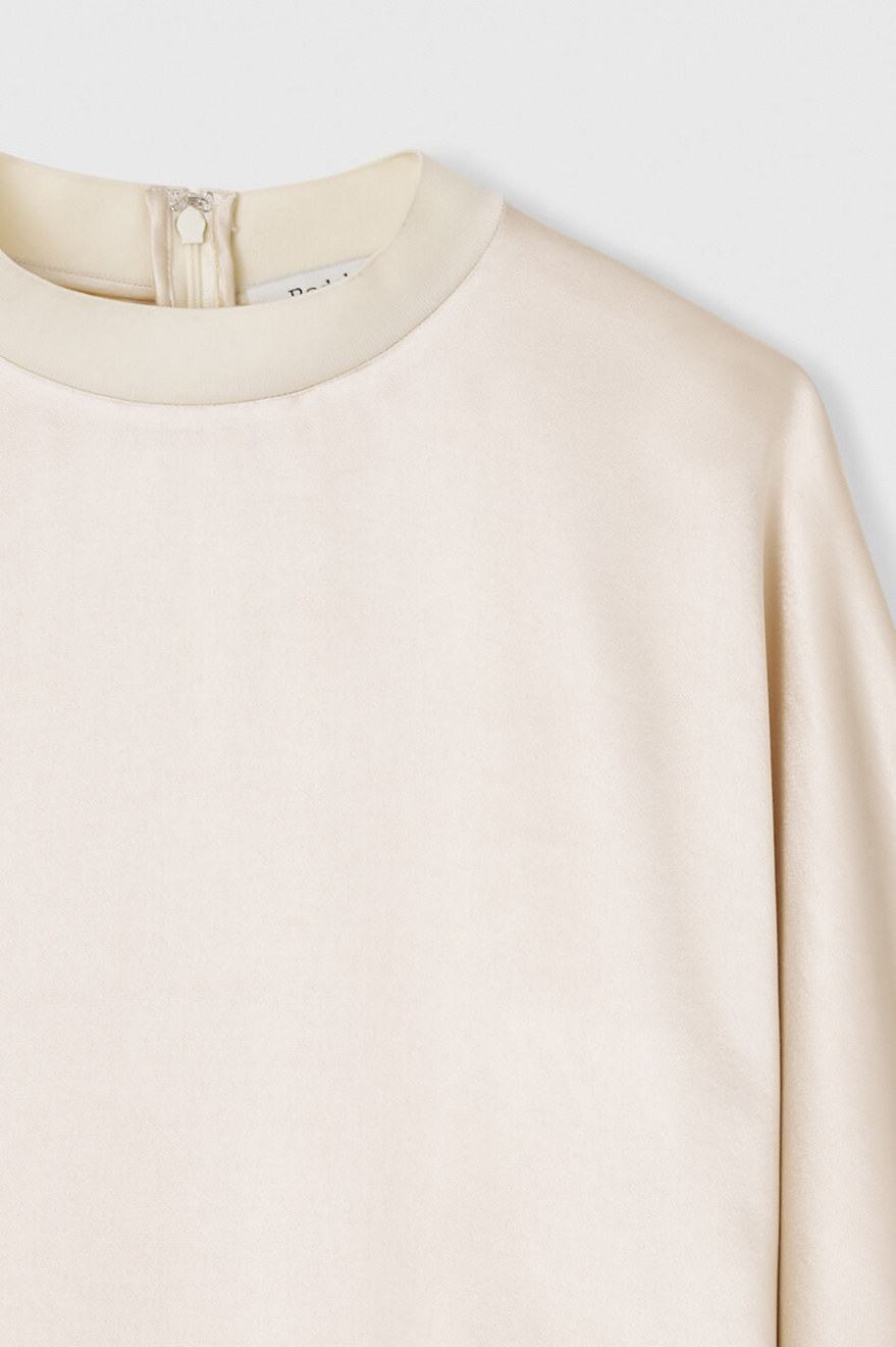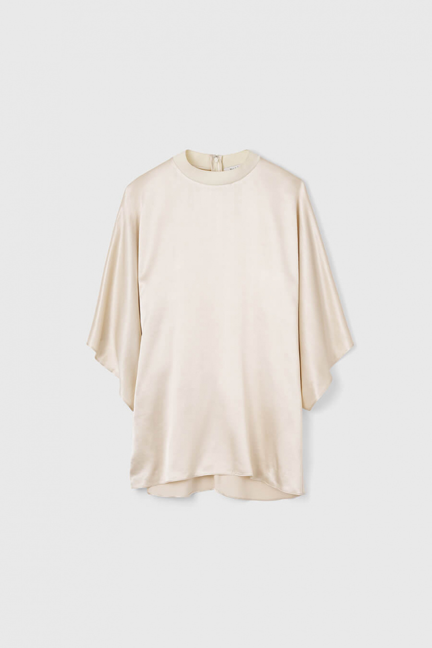 När minimalism möter lyx. En beige, glansig blus – lika chic till skräddade byxor som till denim.Glansig blus i en viskosblandning med lös passform, rund hög ribbstickad halsringning, stängs med gömd dragkedja bak och vida ärmar från Rodebjer.