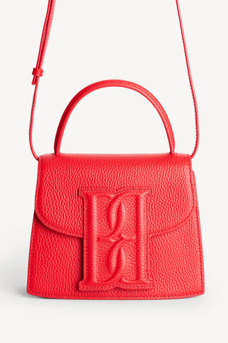 Röd väska i läder och med ett handtag, justerbar axelrem, magnetstängning, en liten innerficka och logga fram från By Malene Birger.