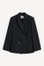 Dubbelknäppt svart kavaj med skarp siluett och tidlös attityd. Bär över en vit T-shirt och jeans för avslappnad edge, eller styla med en midikjol och loafers för skräddad perfektion. En ikonisk kavaj för alla stilnivåer.Dubbelknäppt kavaj med ledig passform, slitsar back, krage, fickor fram och lätt vadderade axlar från By Malene Birger.