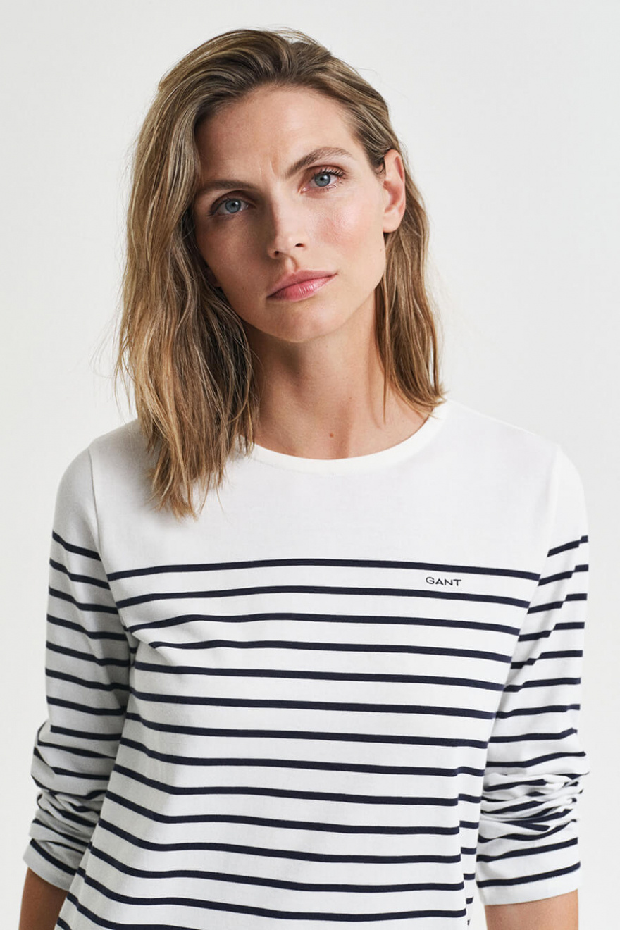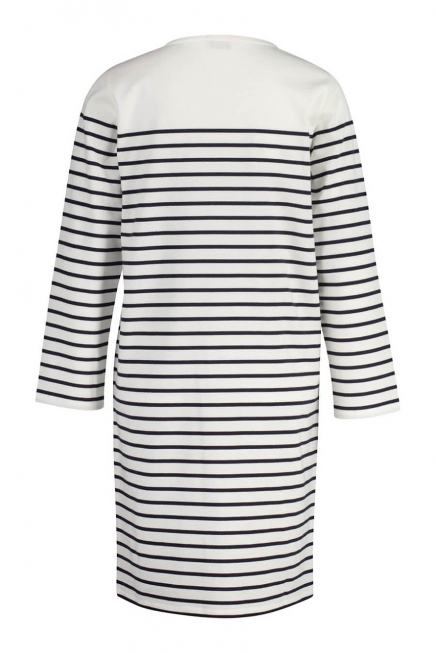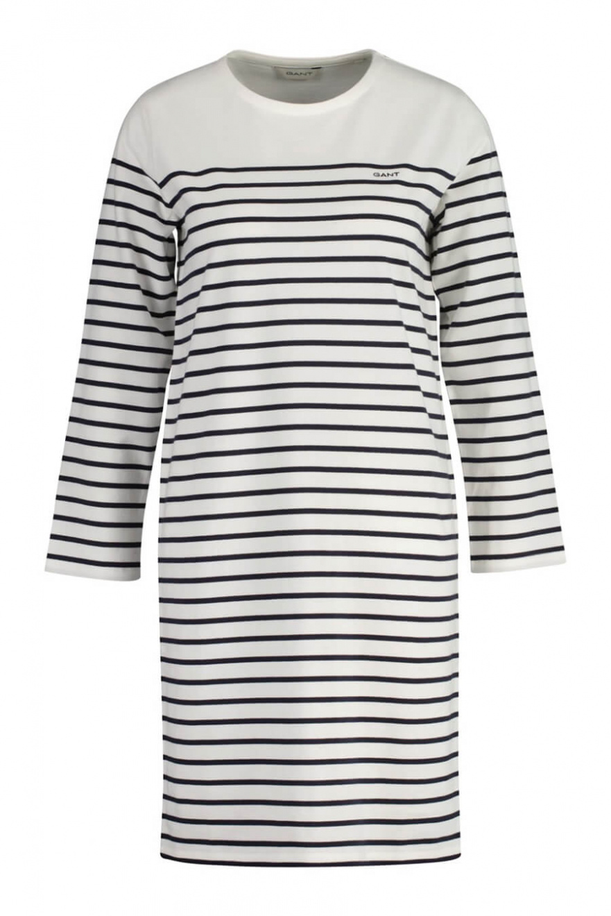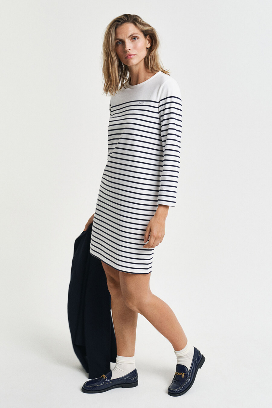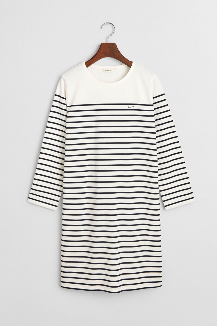 Ge din stil en touch av somrig elegans med denna vita klänning med blå ränder. Den normala passformen gör den lättburen och chic – en perfekt kombination av avslappnad och sofistikerad för alla tillfällen!Randig klänning i bomull med rund halsringning, 3/4 ärm, normal passform och liten broderad logga fram från Gant.