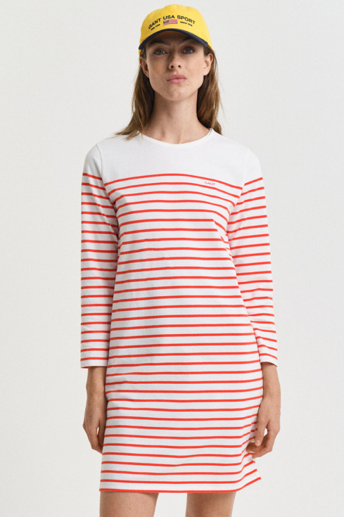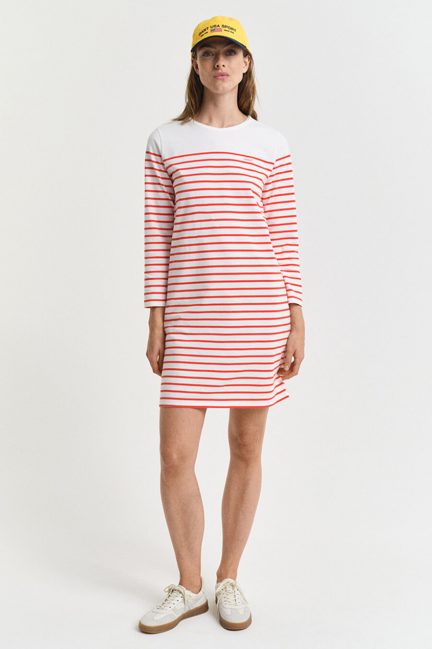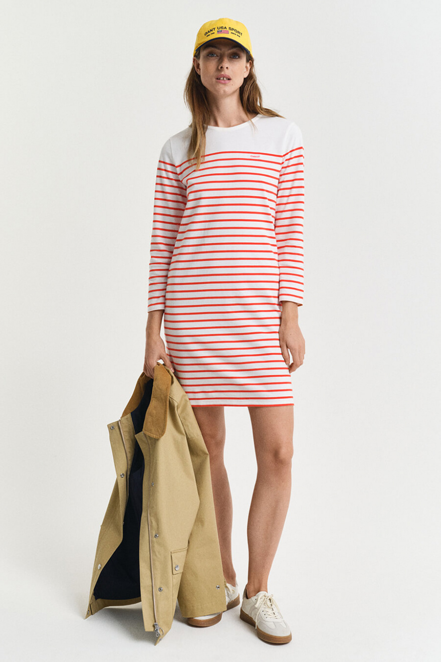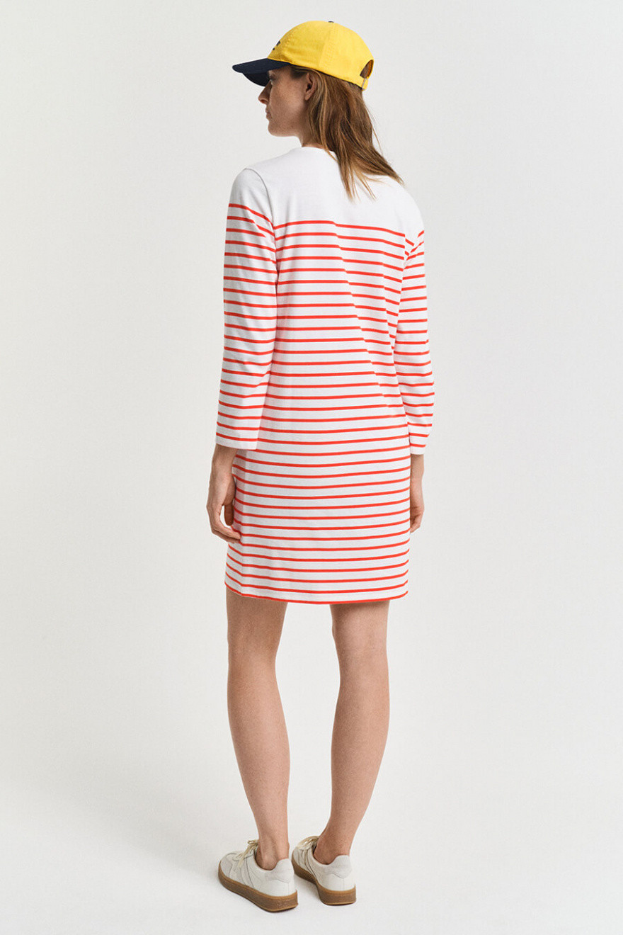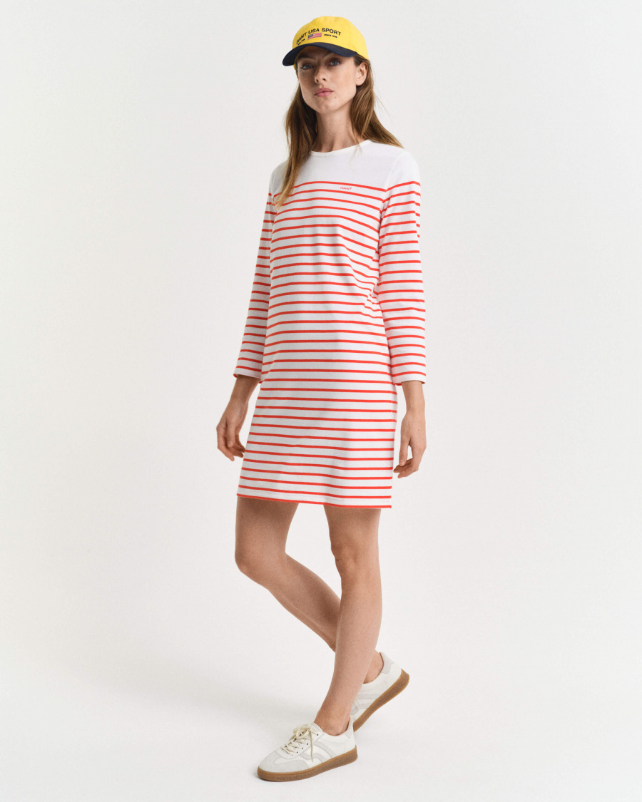 Denna randiga klänning i maritim stil är en tidlös garderobsklassiker. Med en avslappnad passform och 3/4-ärmar passar den perfekt för både stadspromenader och strandhäng. En investering i komfort och stil som varar säsong efter säsong.Randig klänning i bomull med rund halsringning, 3/4 ärm, normal passform och liten broderad logga fram från Gant.