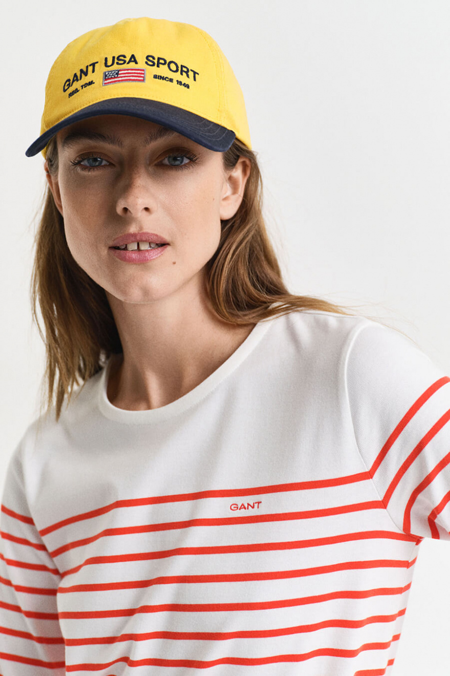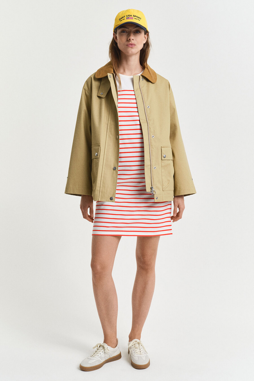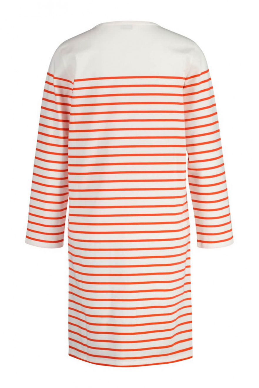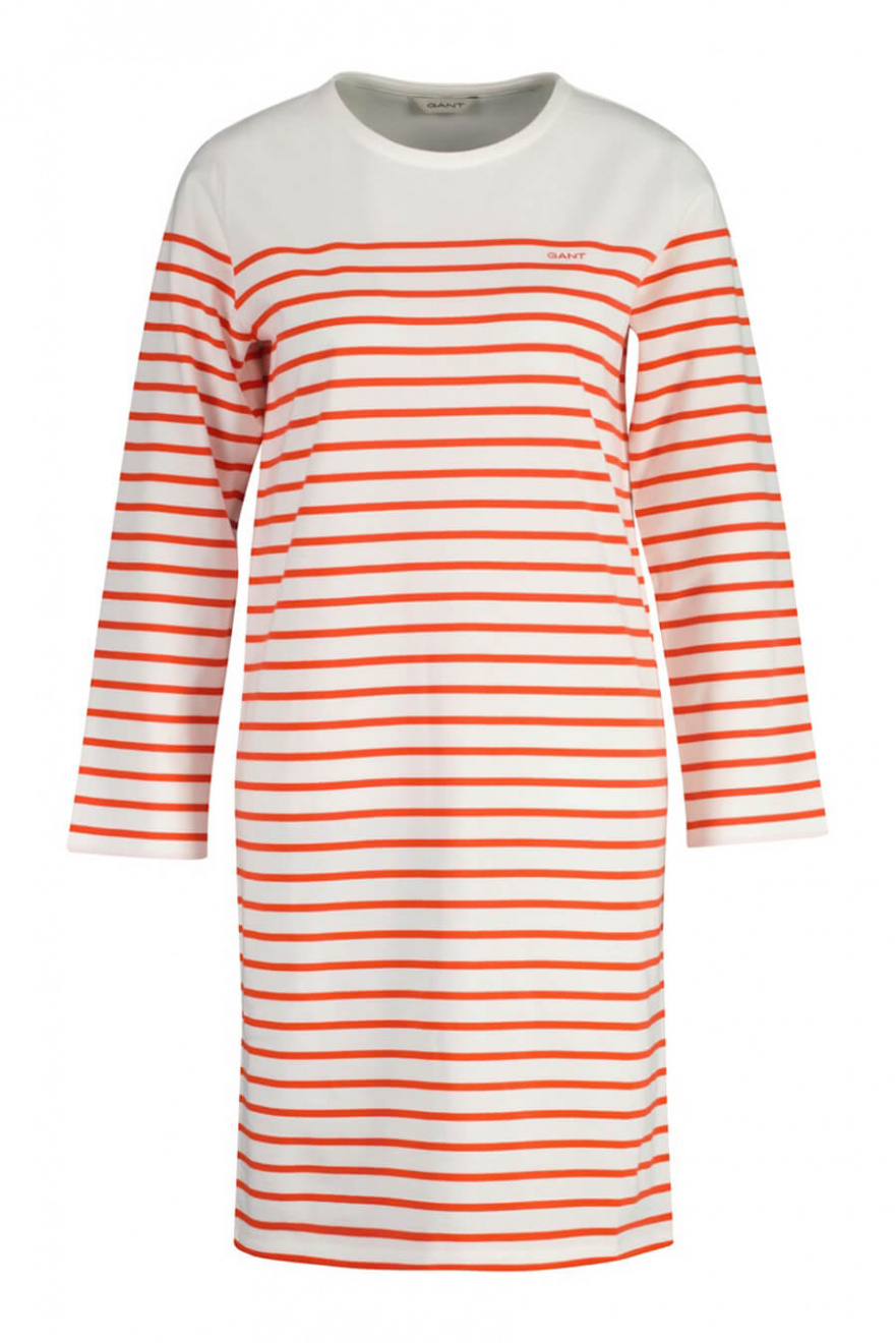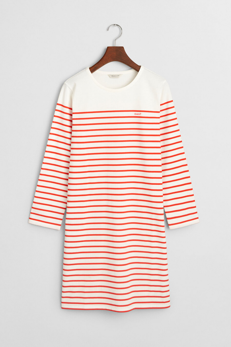 Denna randiga klänning i maritim stil är en tidlös garderobsklassiker. Med en avslappnad passform och 3/4-ärmar passar den perfekt för både stadspromenader och strandhäng. En investering i komfort och stil som varar säsong efter säsong.Randig klänning i bomull med rund halsringning, 3/4 ärm, normal passform och liten broderad logga fram från Gant.