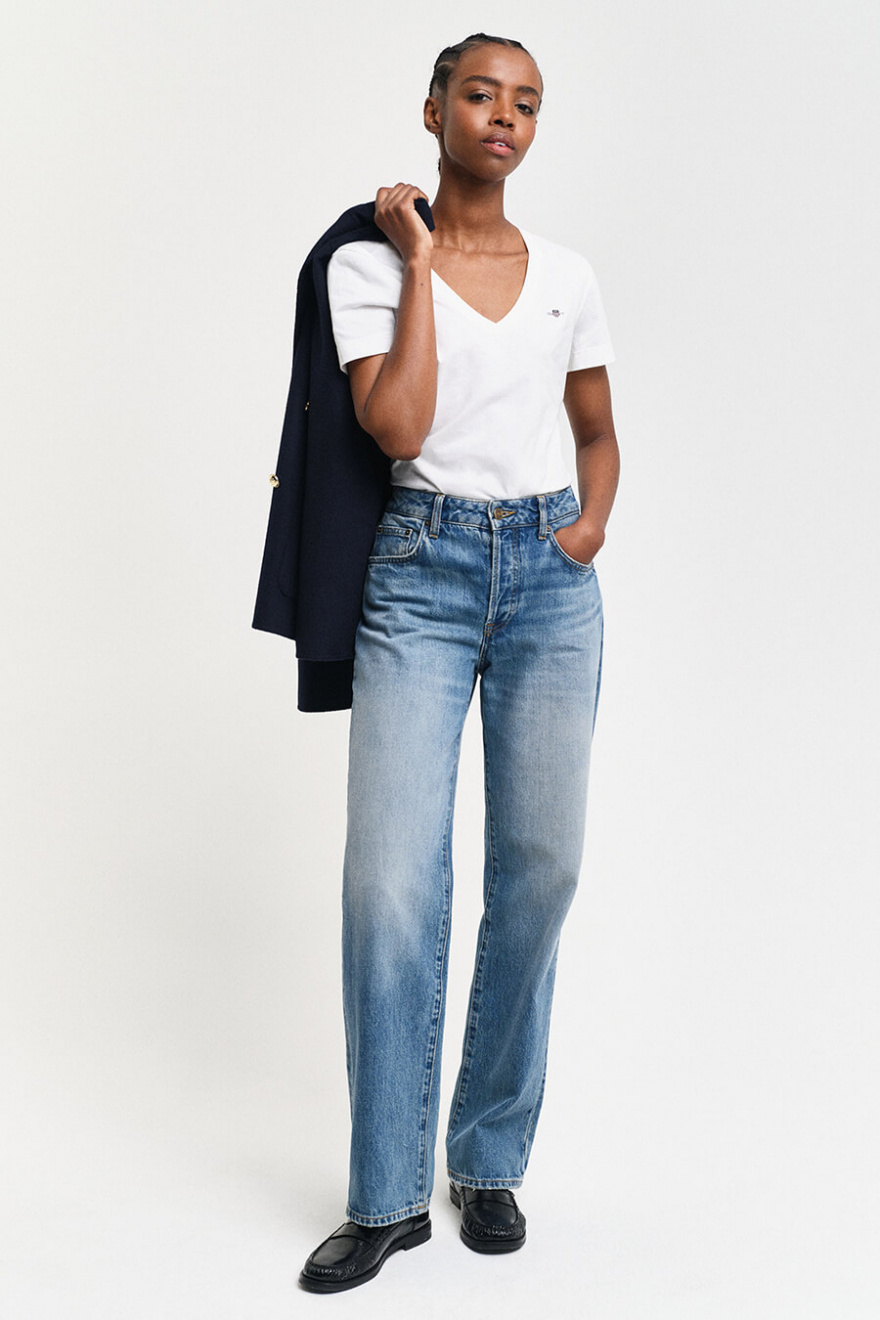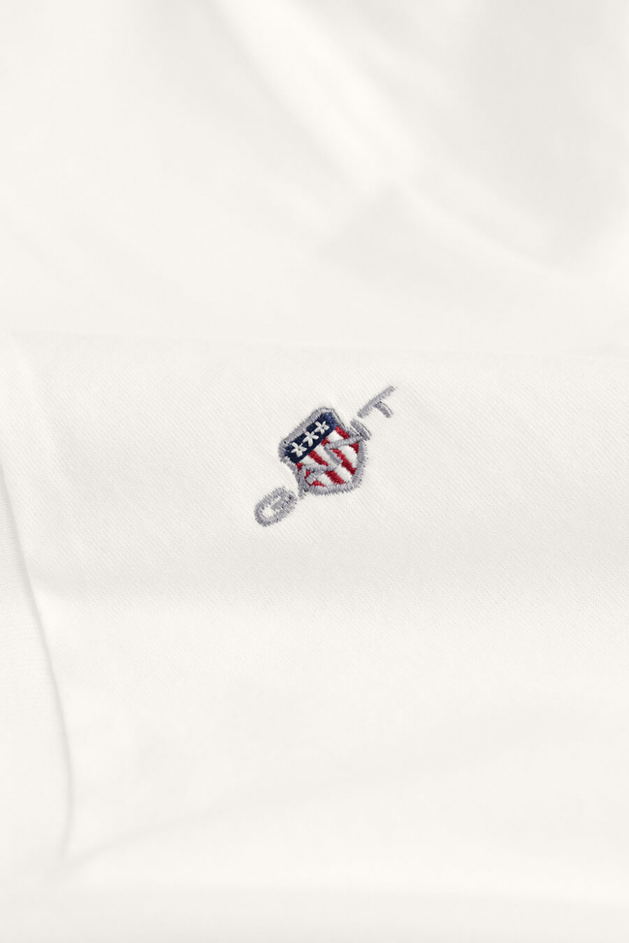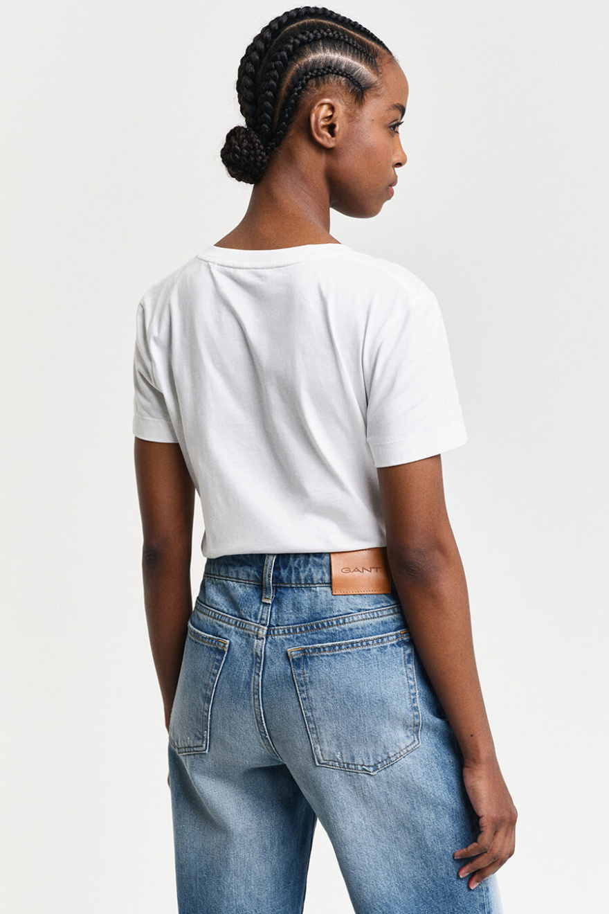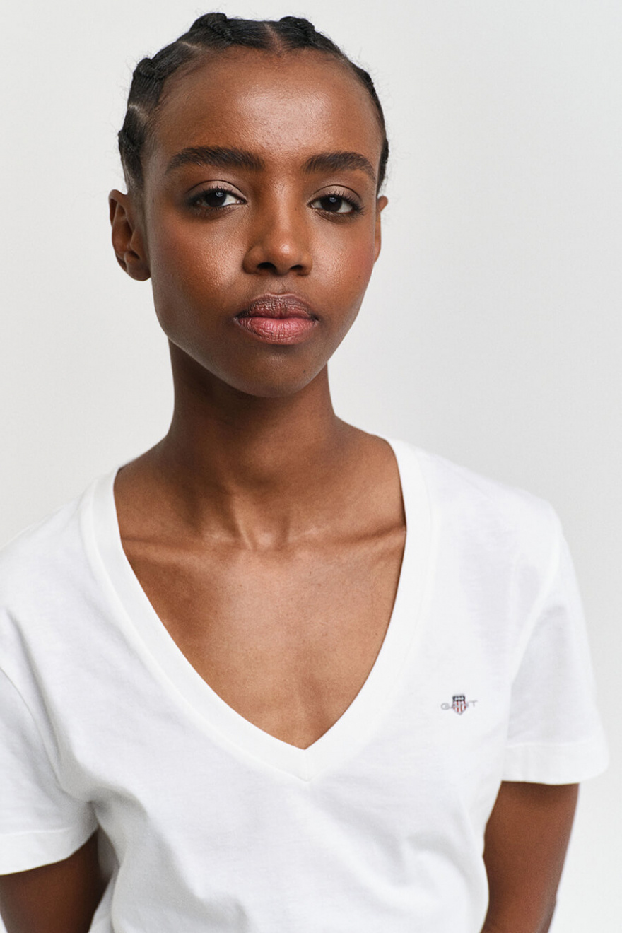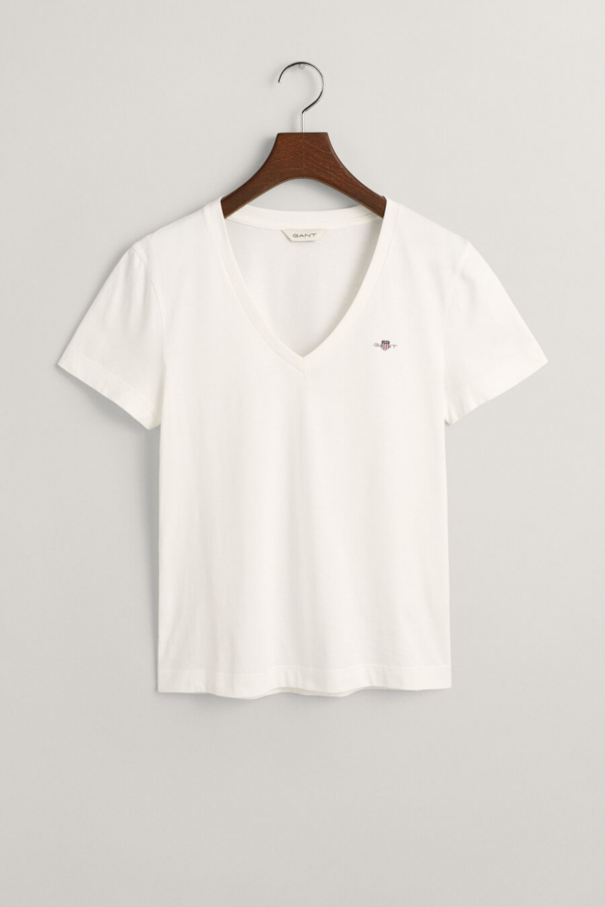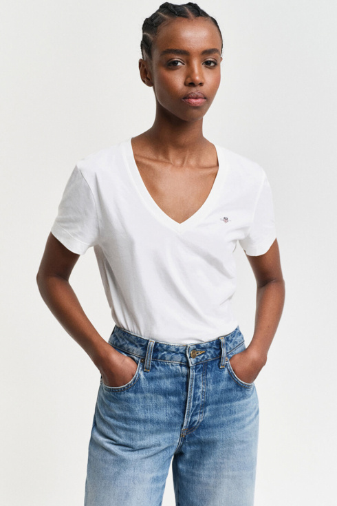 En vit t-shirt med v-ringning är nyckeln till en avslappnad men stilren look. Den mjuka passformen och tidlösa designen gör den lätt att matcha med allt från jeans till kjolar. Ett oumbärligt basplagg för varje garderob.Kortärmad t-shirt i bomull med v-ringning, liten broderad logga fram och normal passform från Gant.
