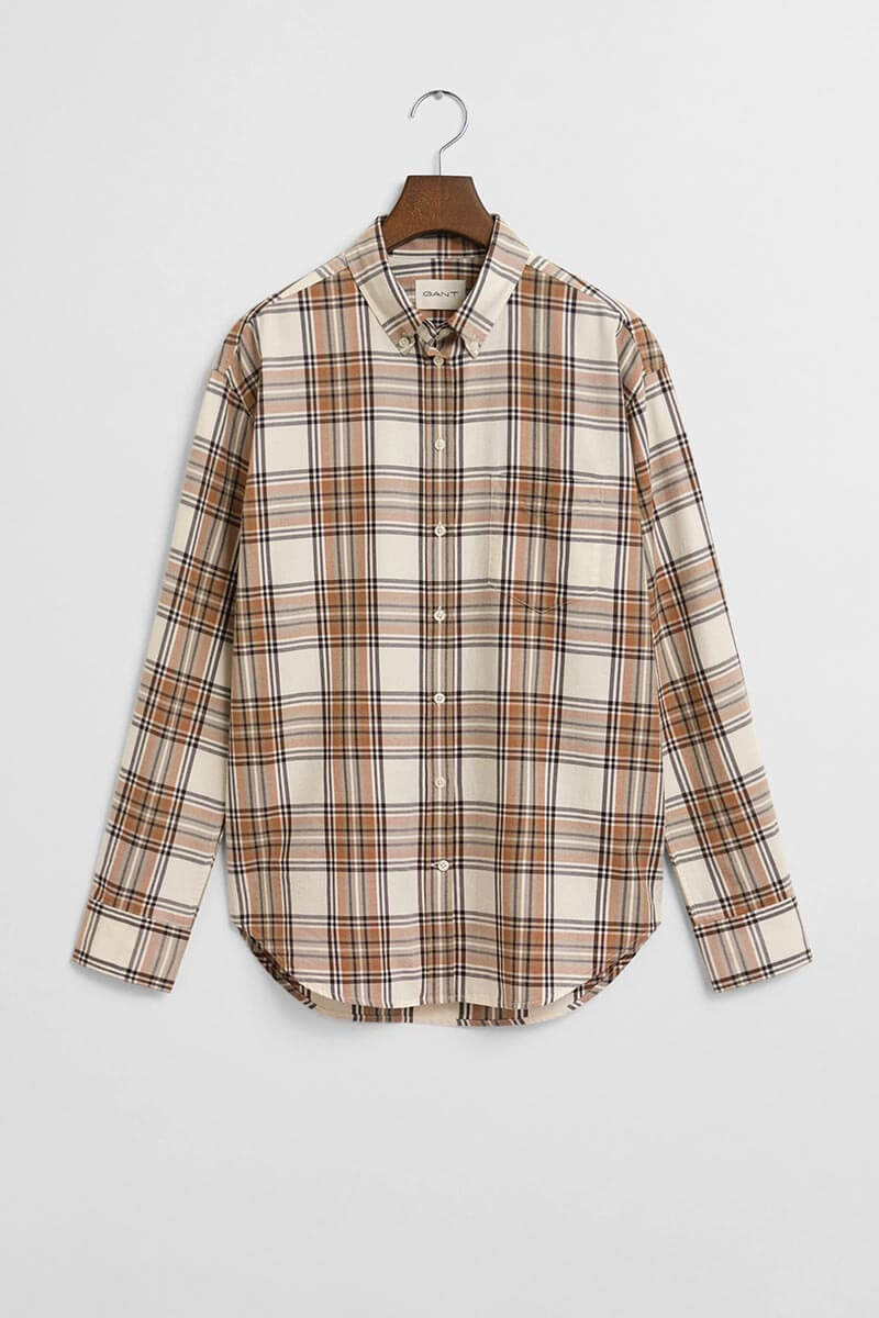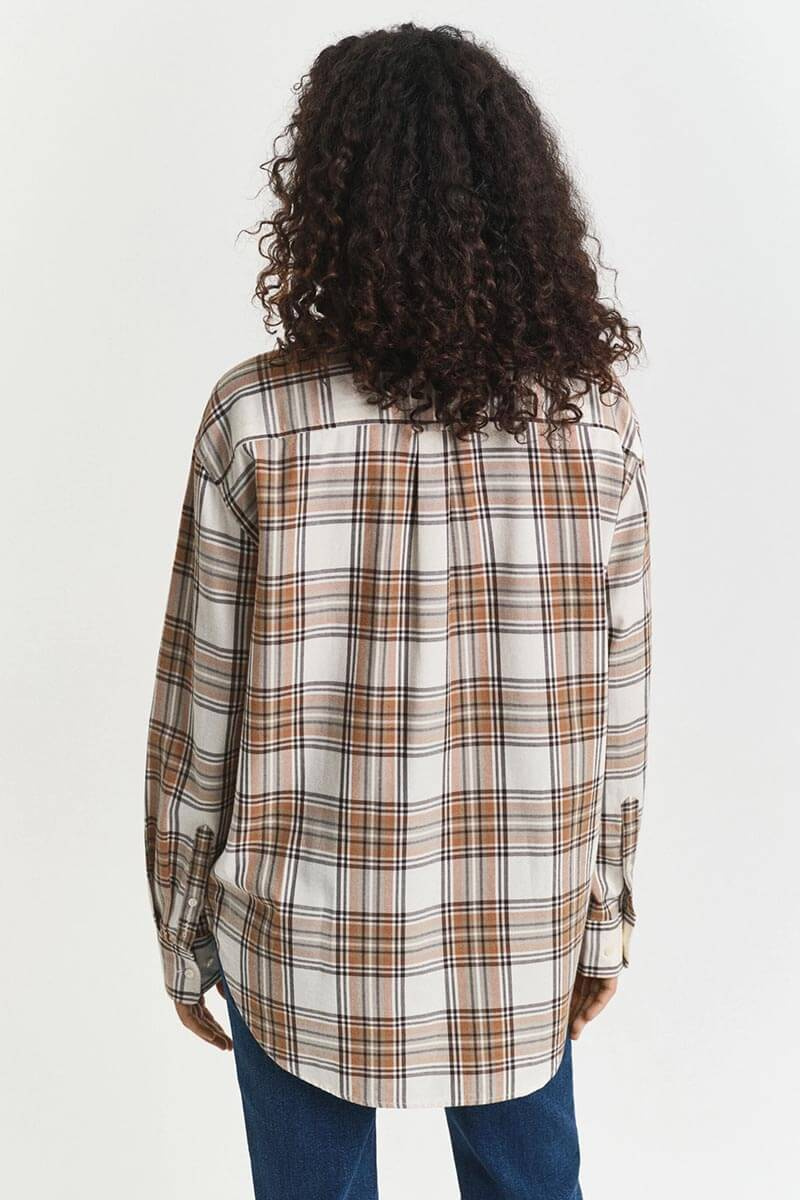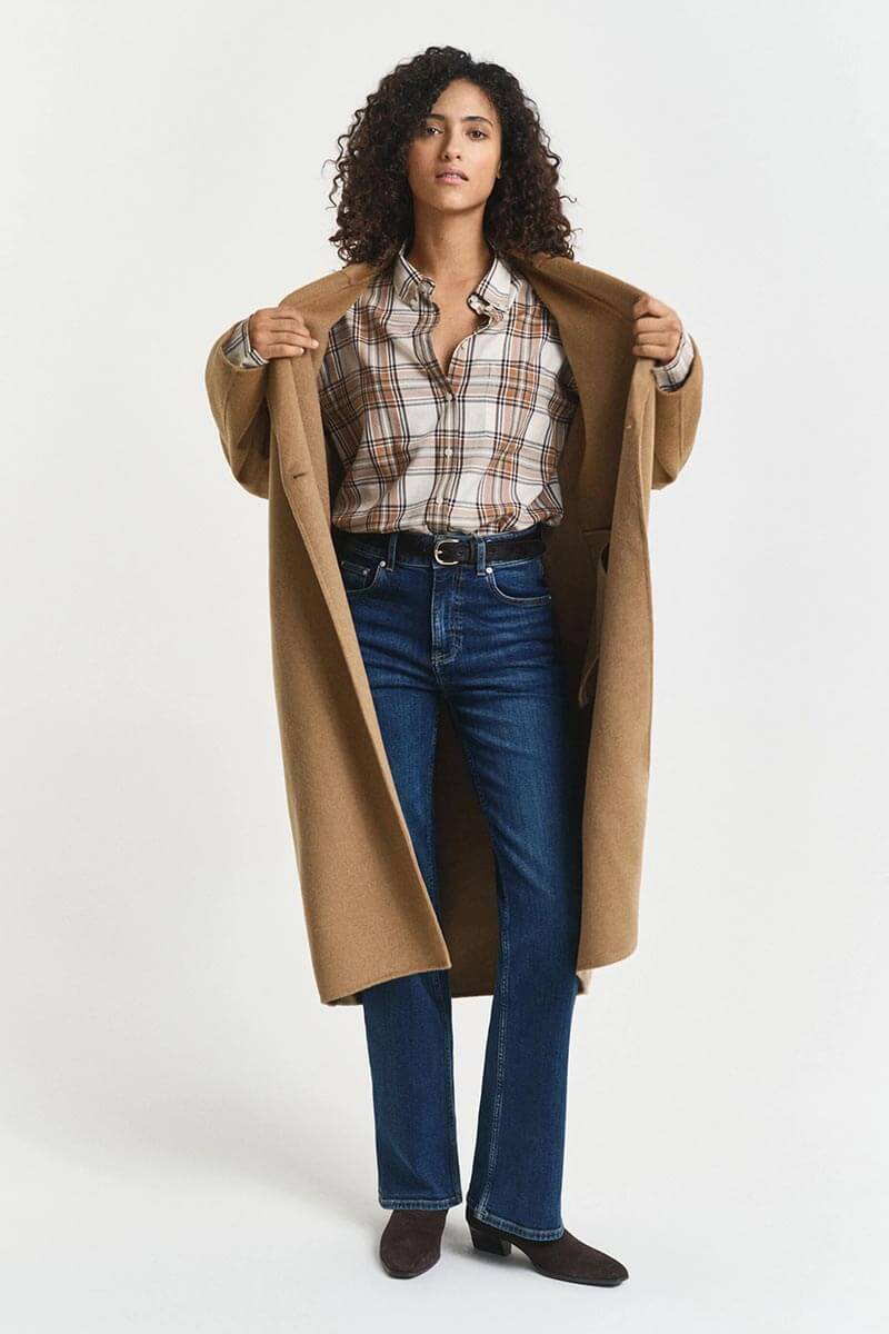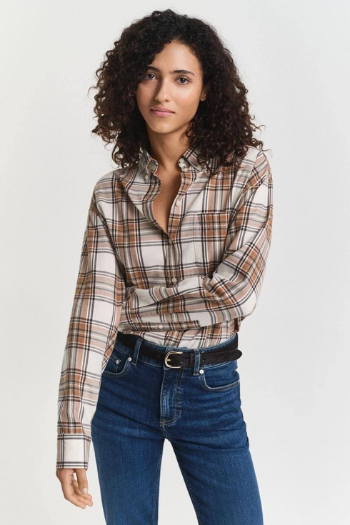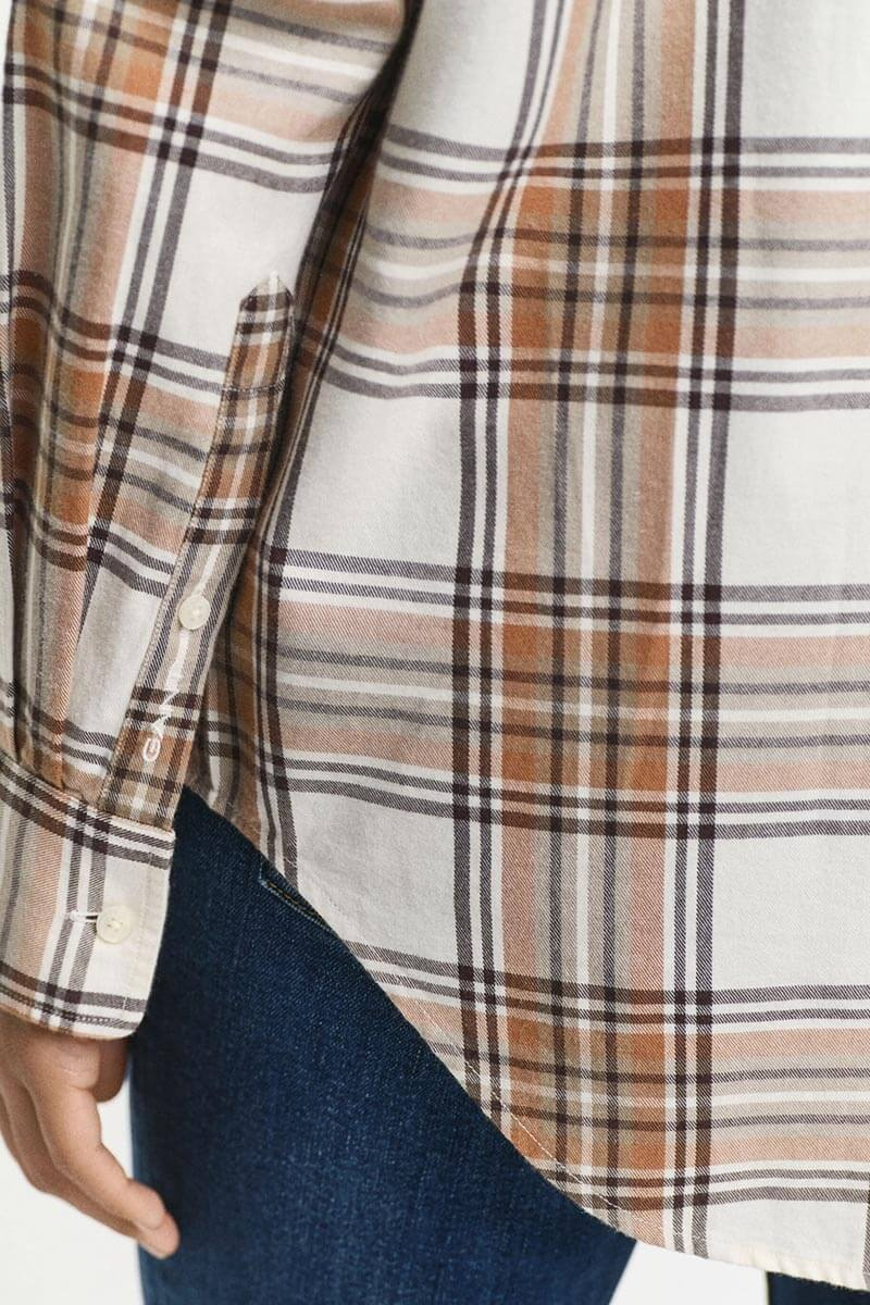 Den har en point-krage, rundad fåll, justerbara manschetter och en bröstficka. Skjortan har knappar i återvunnen polyester, brodyr på ärmen och ett boxpleat med Gants klassiska locker loop i ryggen.