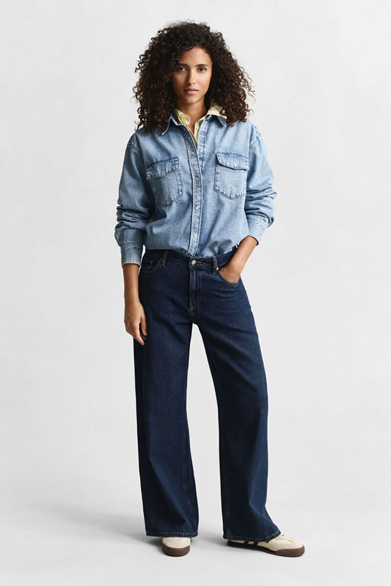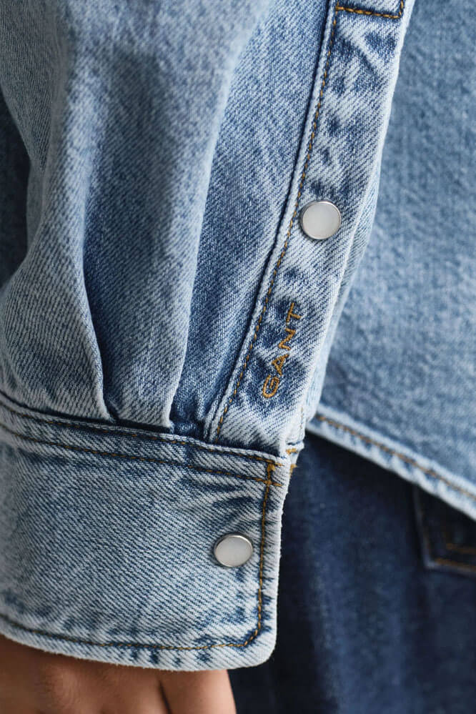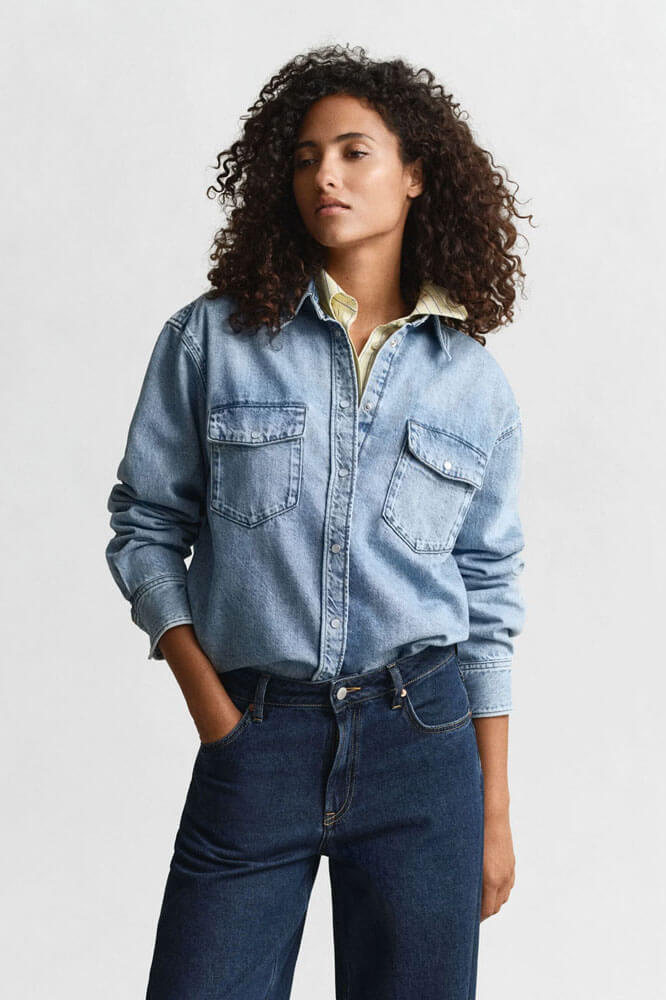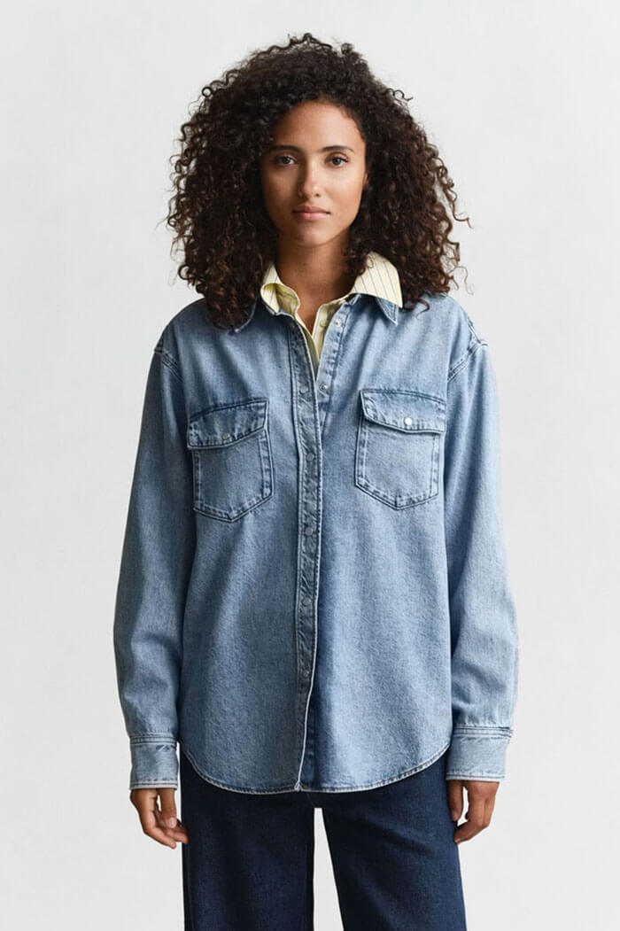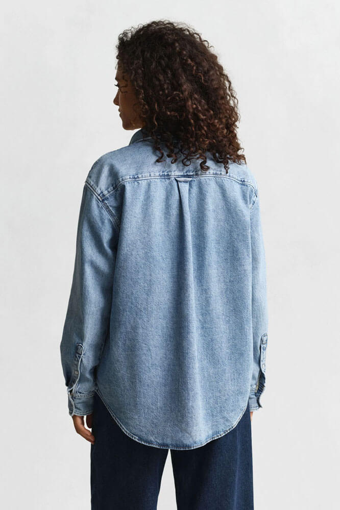 Denimskjorta i bomull med relaxed fit. Den perfekta over-shirten i denim. Lite stadigare kavlité.Den har en klassisk point-krage, två bröstfickor med lock, knappar i återvunnen polyester och en rundad fåll. Prydd med en boxpleat och klassiska locker loop i ryggen, tillsammans med en broderad Gant-logo på manschetten.