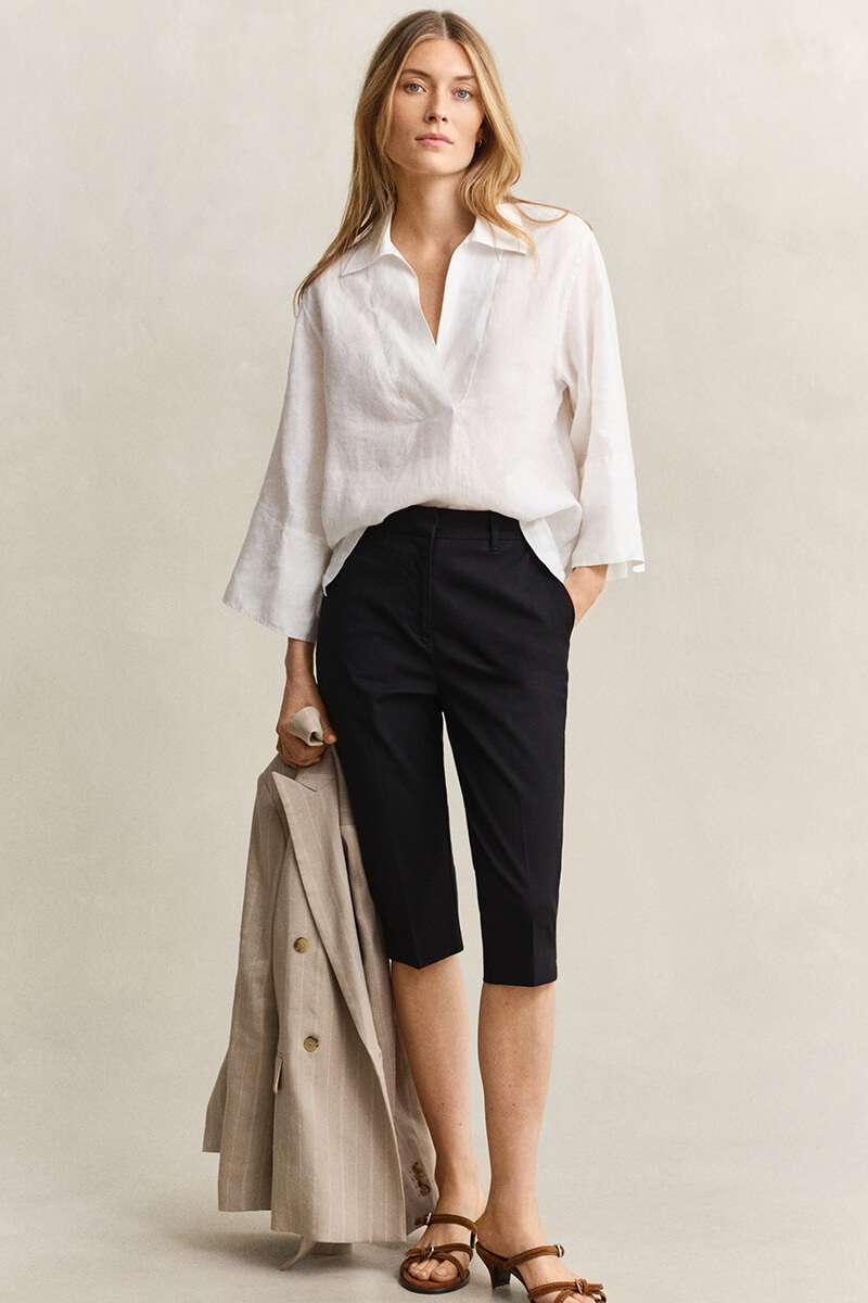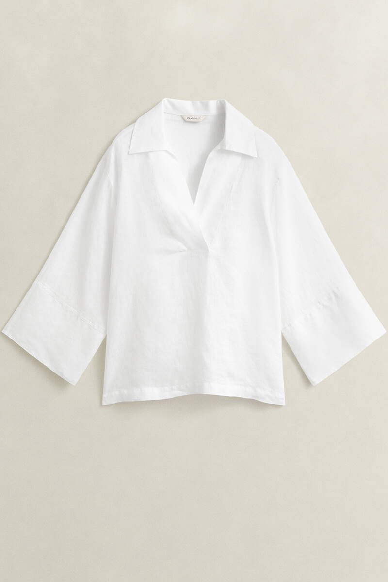 nygg linneblus med sprund på ärm och v-hals och krage.Den här blusen är tillverkad av certifierat europeiskt linne, en lätt fiber som andas naturligt. Den har en fräsch look som passar bra för lediga tillställningar.