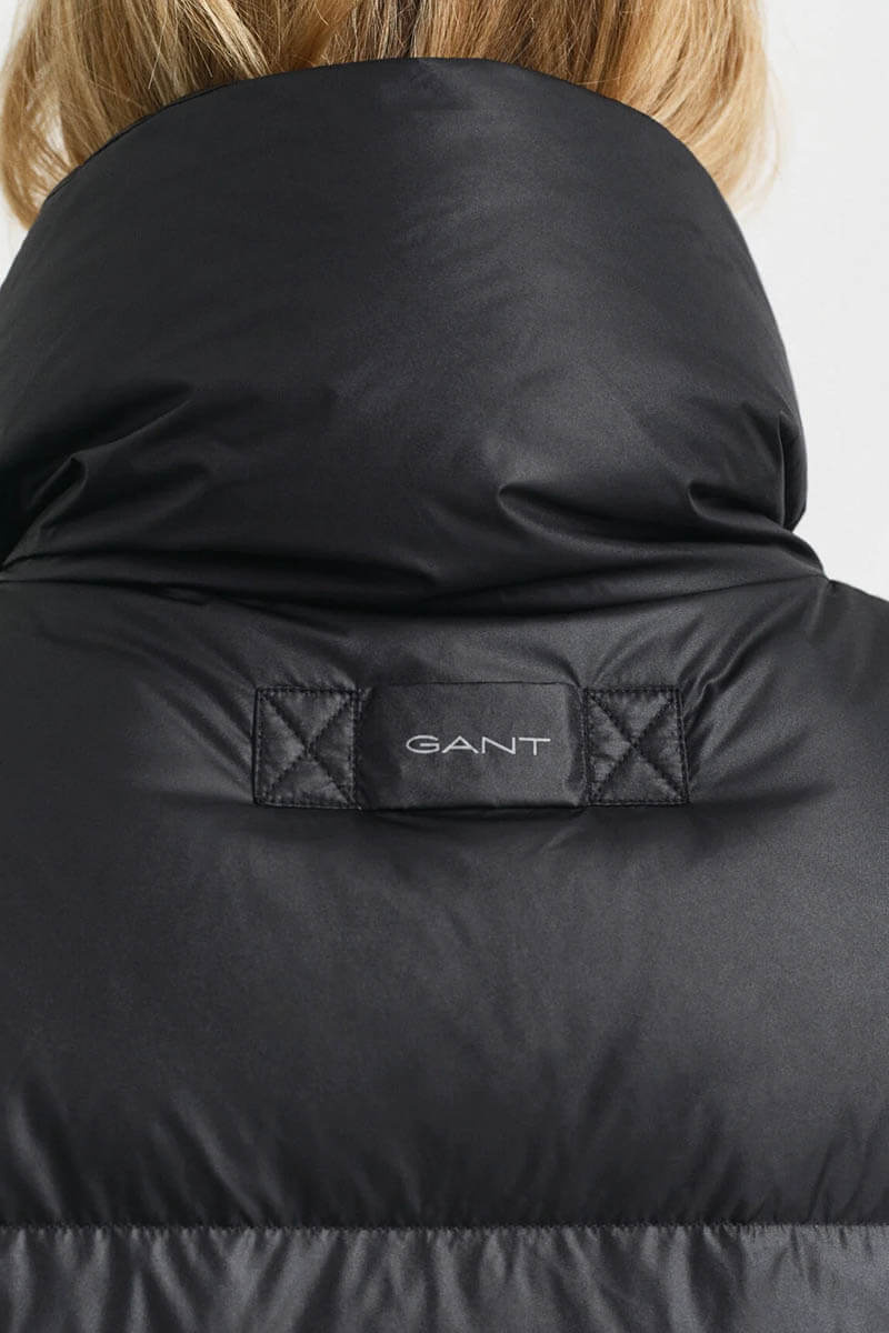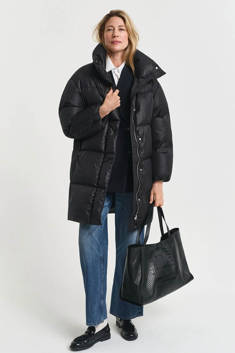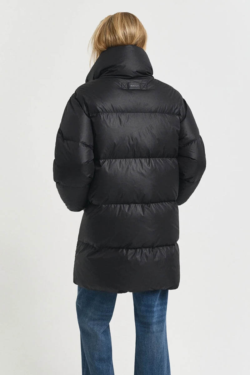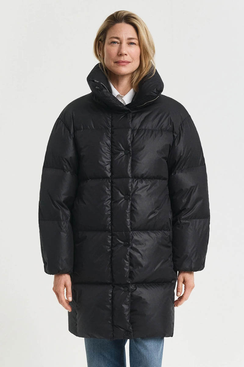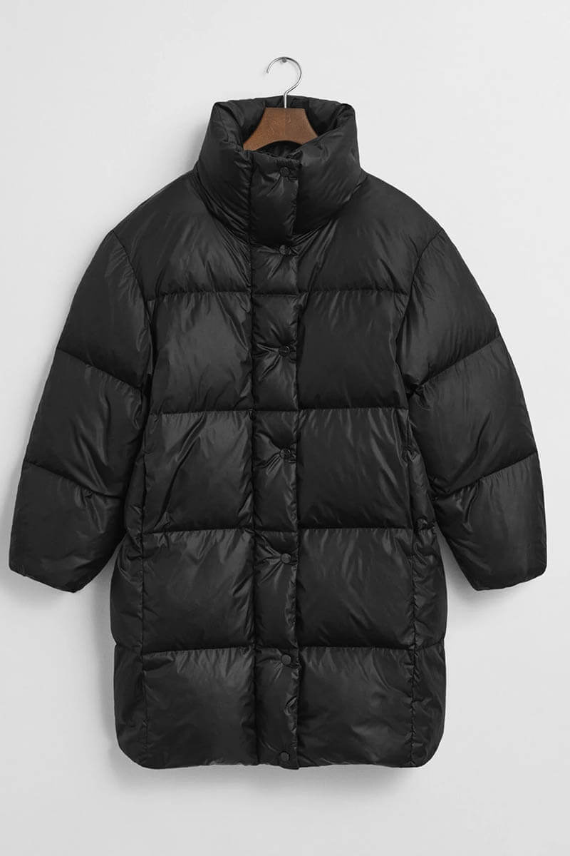 Denna svarta dunkappan är den perfekt till de kallare perioderna. Styla den över en skjorta och smala byxor för kontoret, eller med stickad klänning och boots till helgen.Dunkappa som slutar mitt på låret, knappar fram, hög krage, fickor fram och rak passform från Gant.