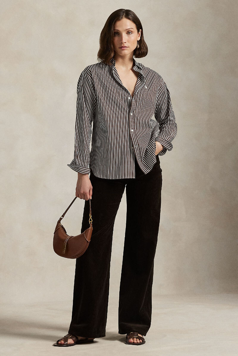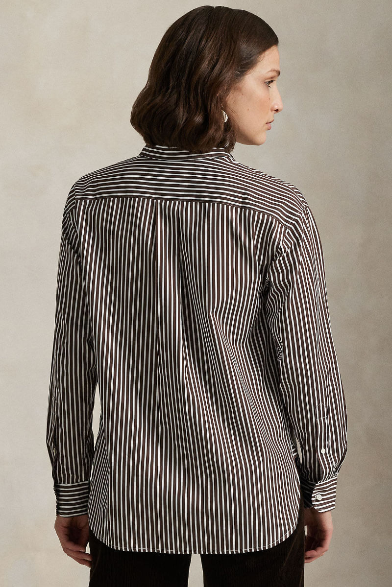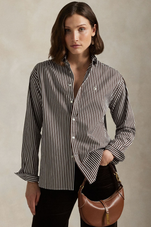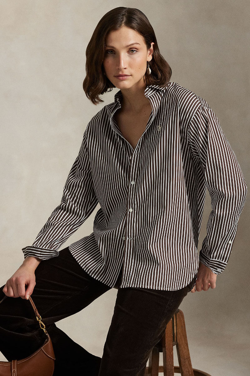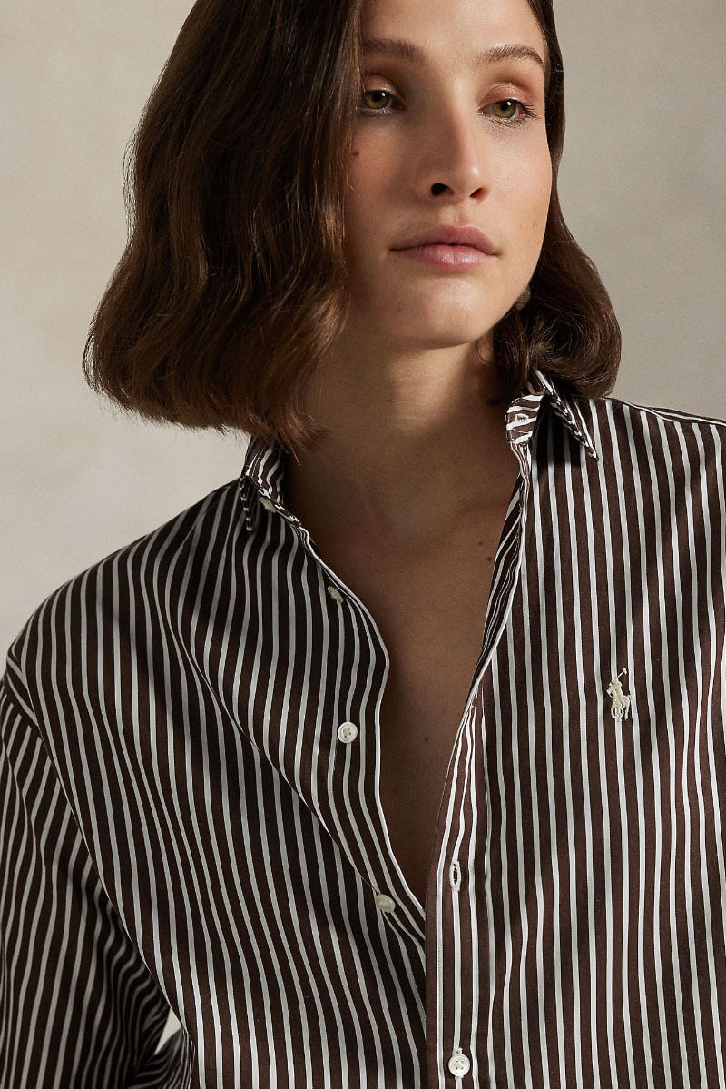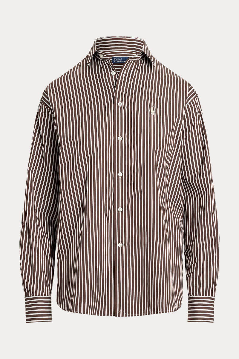 Lyft höststilen med en randig skjorta som kombinerar klassiskt snitt och modern enkelhet. Perfekt att styla med stickade lager, skräddade byxor och läderaccessoarer. En tidlös investering som gör varje höstlook elegant, avslappnad och självsäker.Randig skjorta i krispig bomull med lös passform, krage, broderad logga fram och fallande axelsömmar från Polo Ralph Lauren.