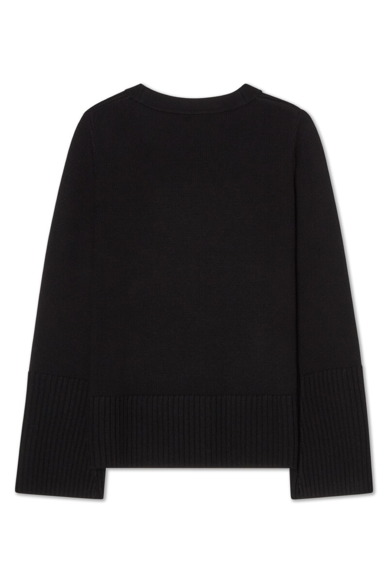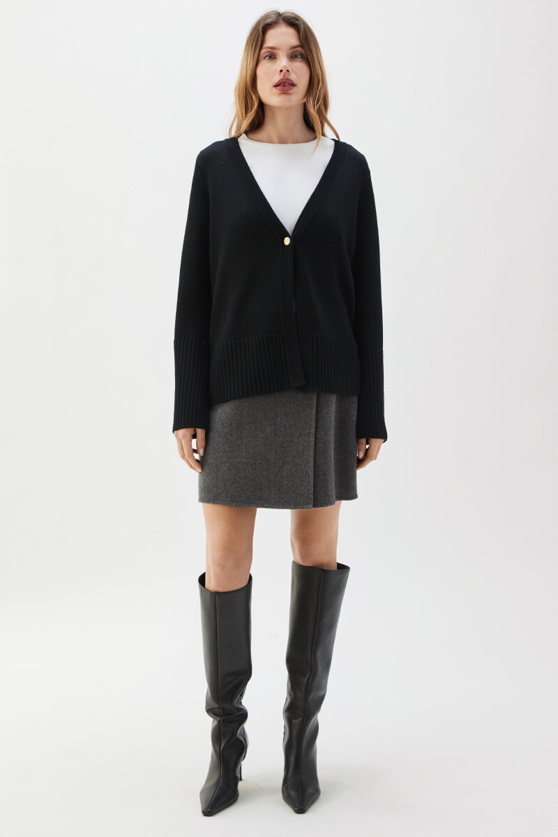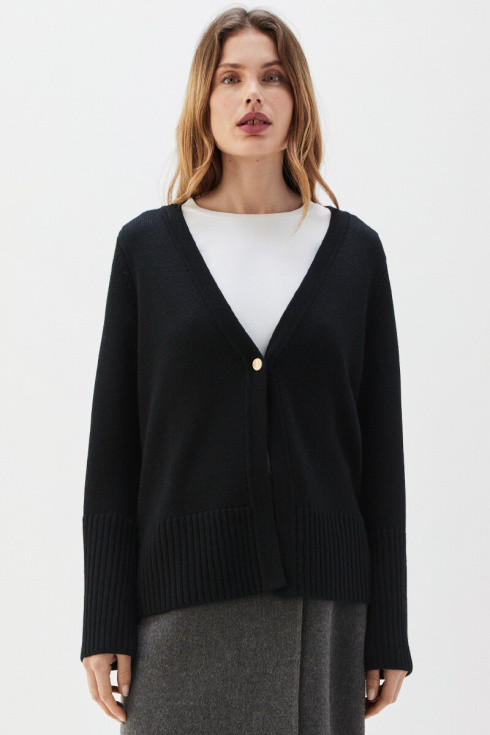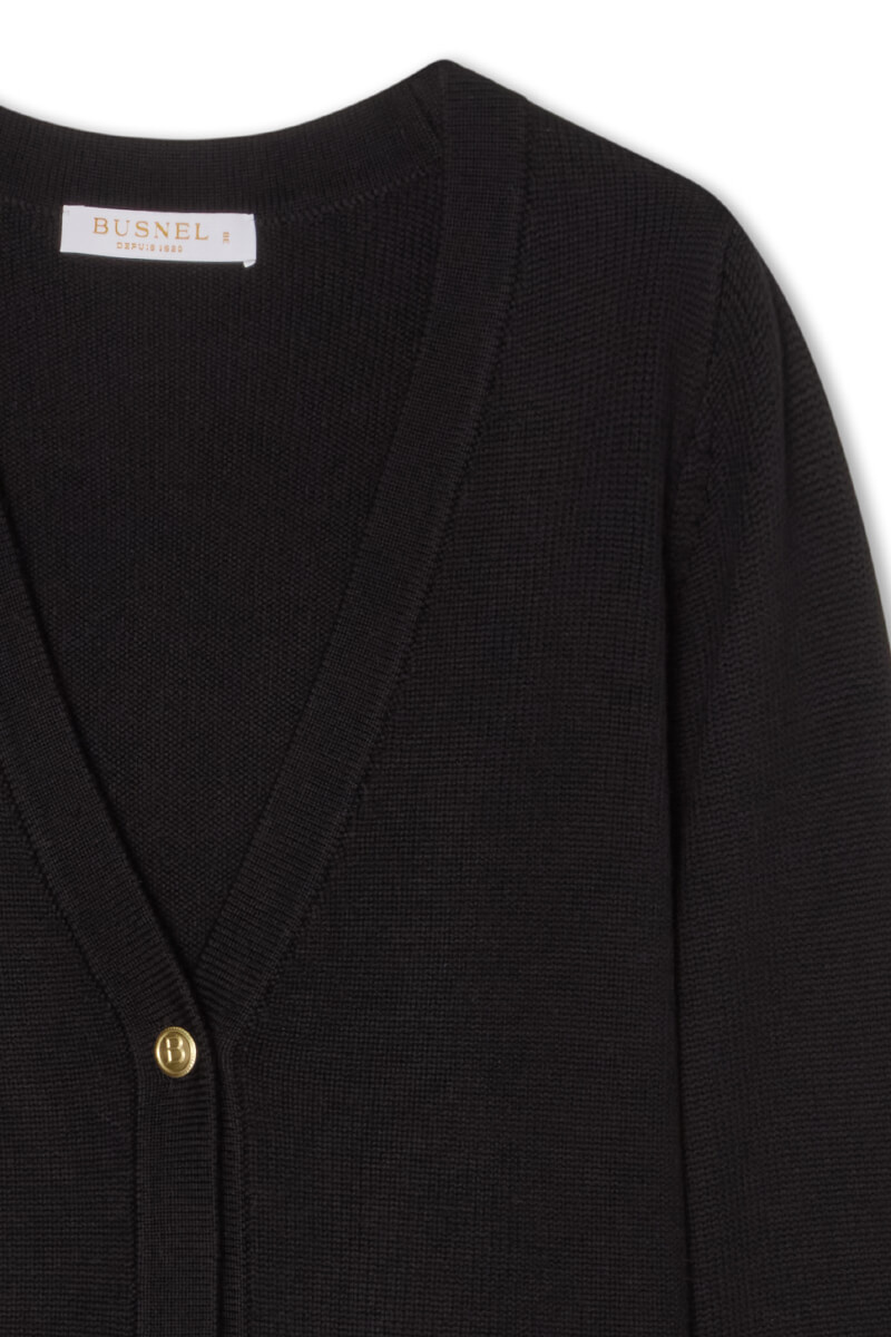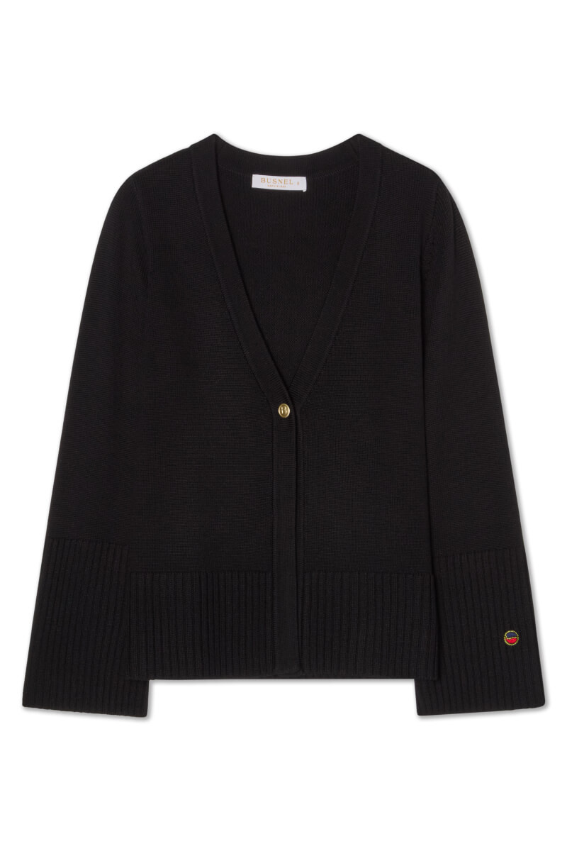 Svart stickad kofta i mjuk merinoull med lös passform och vida ärmar. Bär över silkig slipklänning för kontrast eller med vida byxor för en nonchalant men lyxig höstlook som andas modern elegans.Stickad kofta i mjuk merinoull med lös passform, stängs med en knapp fram, v-ringning, ribbstickade kanter och vida ärmar från Busnel.