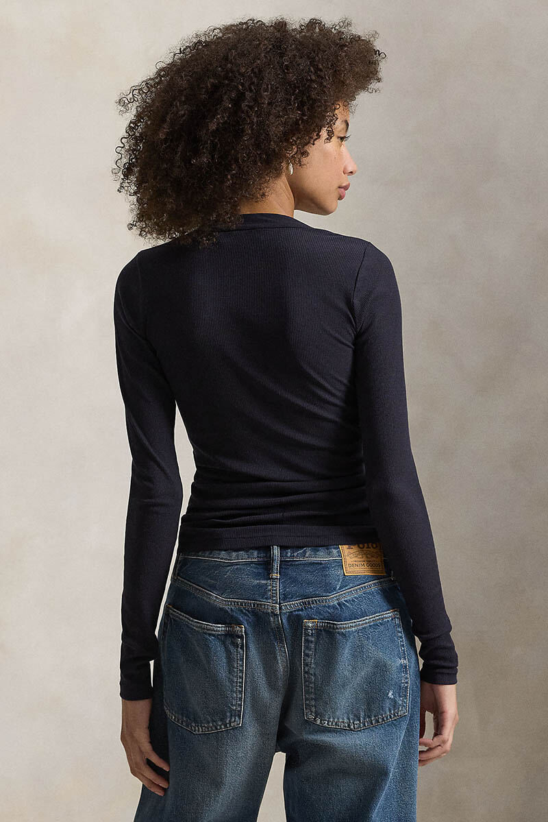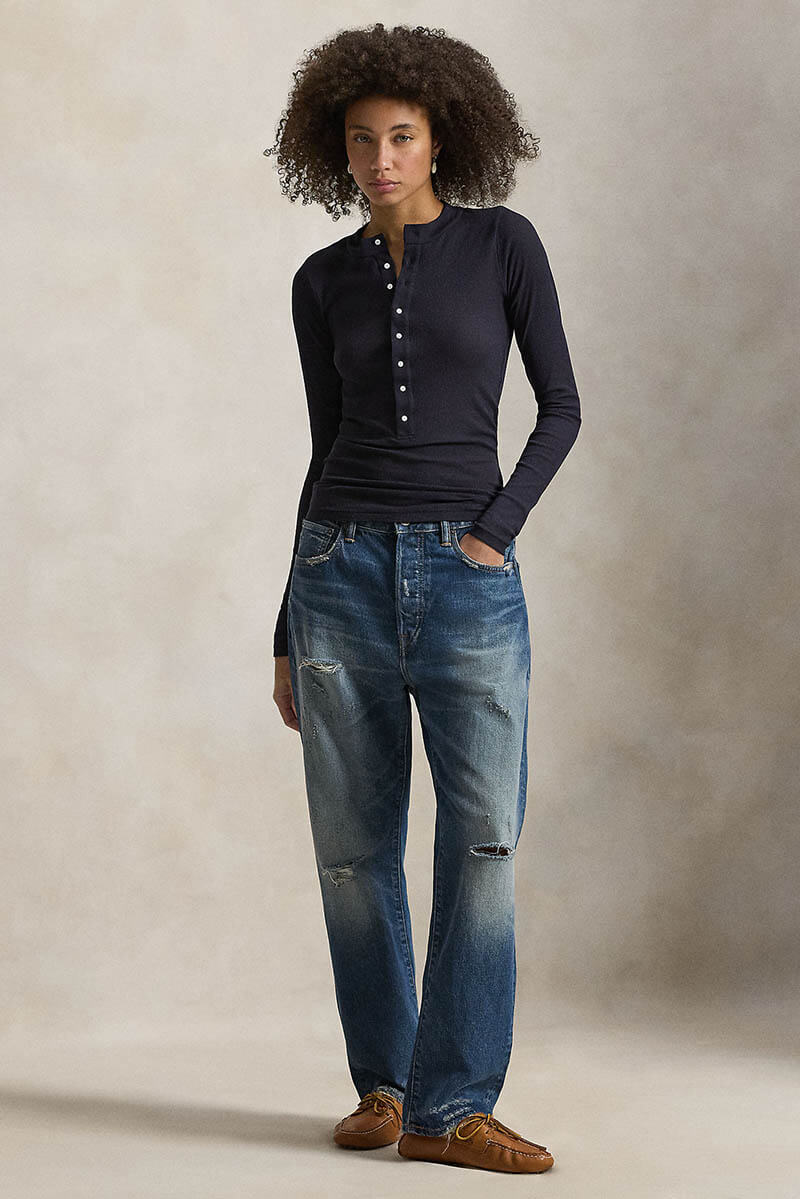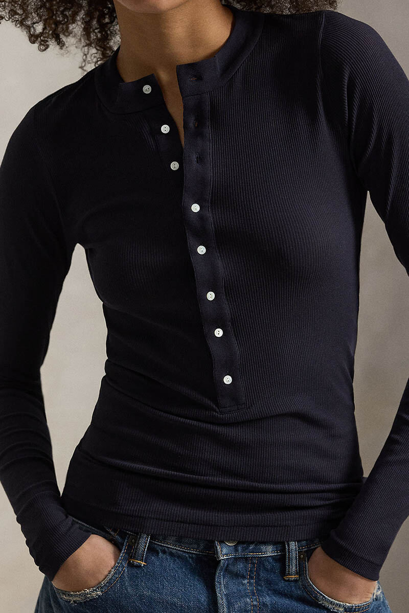Polo tolkar den klassiska Henley-skjortan, ursprungligen dragen av engelska roddare på 1800-talet, med en mjuk, ribbad struktur, smal passform och en förlängd knappslå.