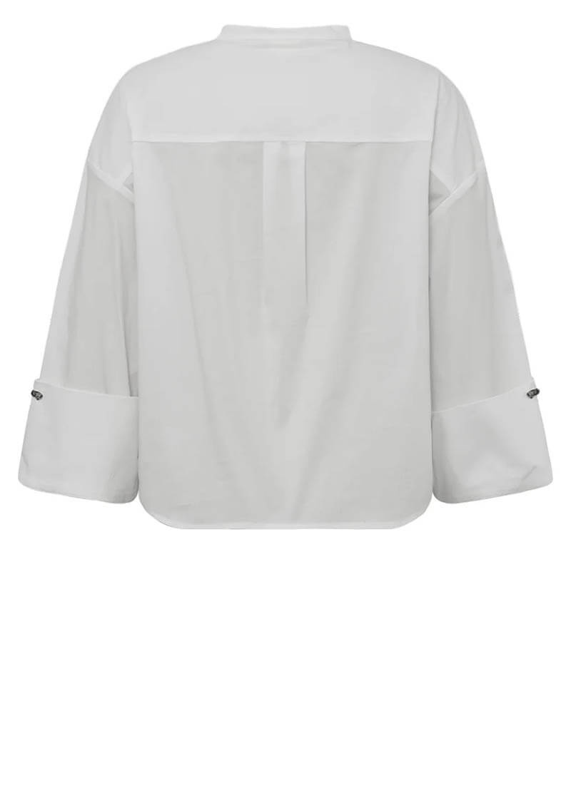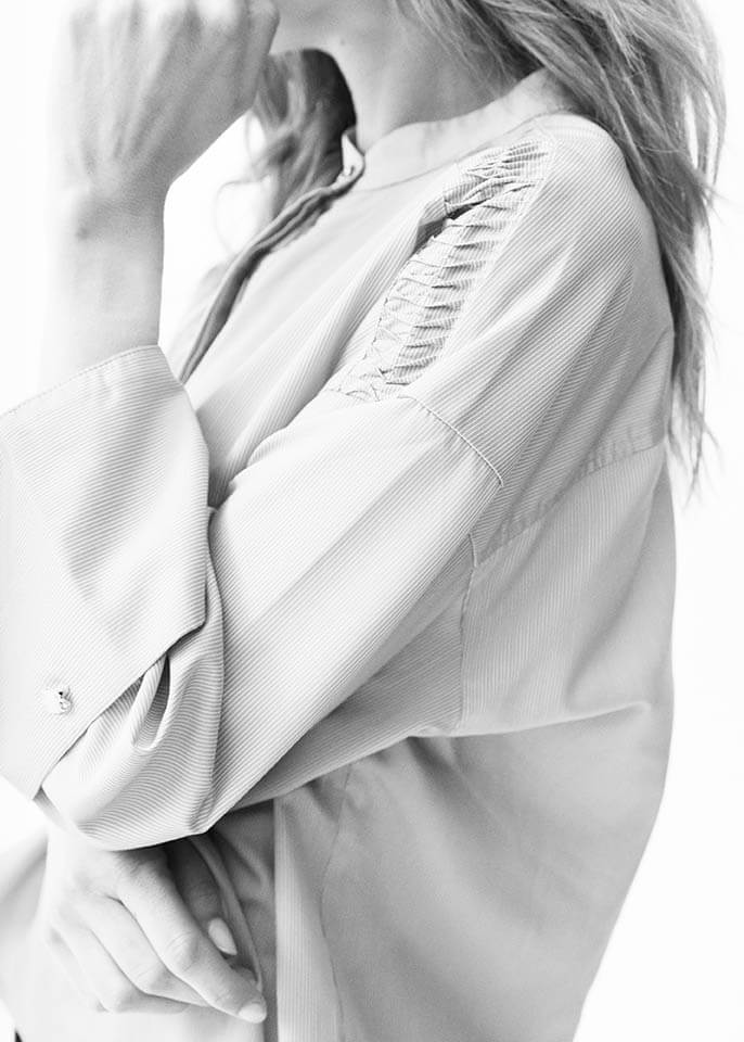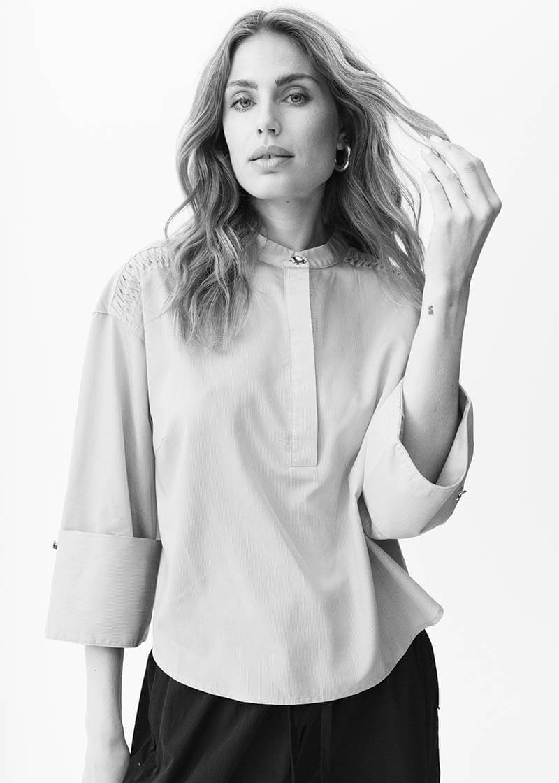 Elegant blus med en vacker detalj vid axeln och generösa, breda manschetter som ger ett exklusivt uttryck. Den organiskt formade silverknappen tillför en extra fin designaccent och fulländar den sofistikerade looken.