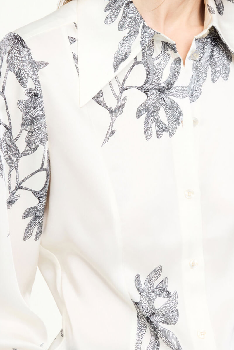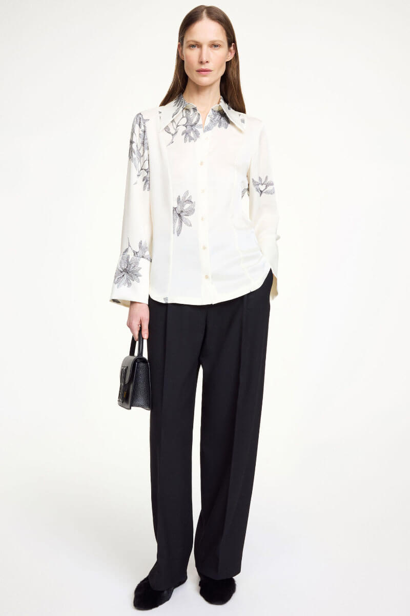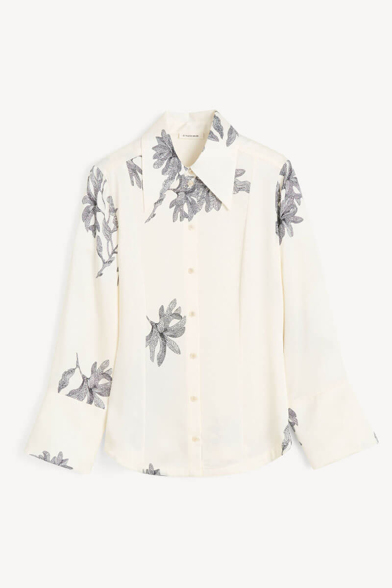 En vit satinskjorta med spetsig krage lyfter varje outfit – bär till slappa jeans och loafers för en fransk känsla, eller instoppad i en midikjol för kontorschic. Satin ger lyster, silhuetten sköter resten.Skjorta i glansig och mjuk satin med spetsig krage, stängs med knappar fram, normal passform och vida manschetter från By Malene Birger.