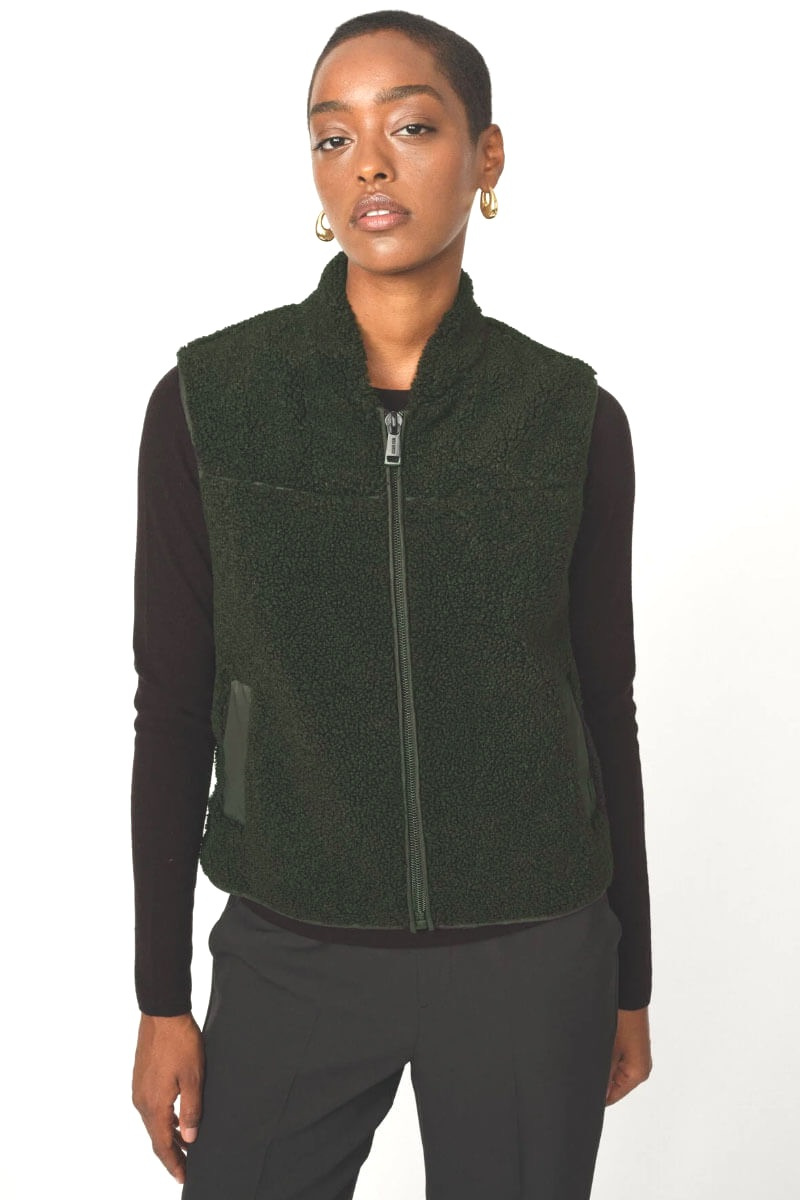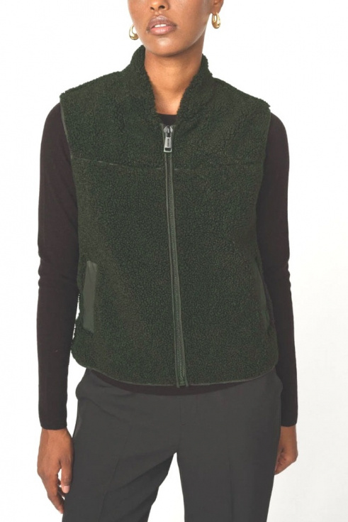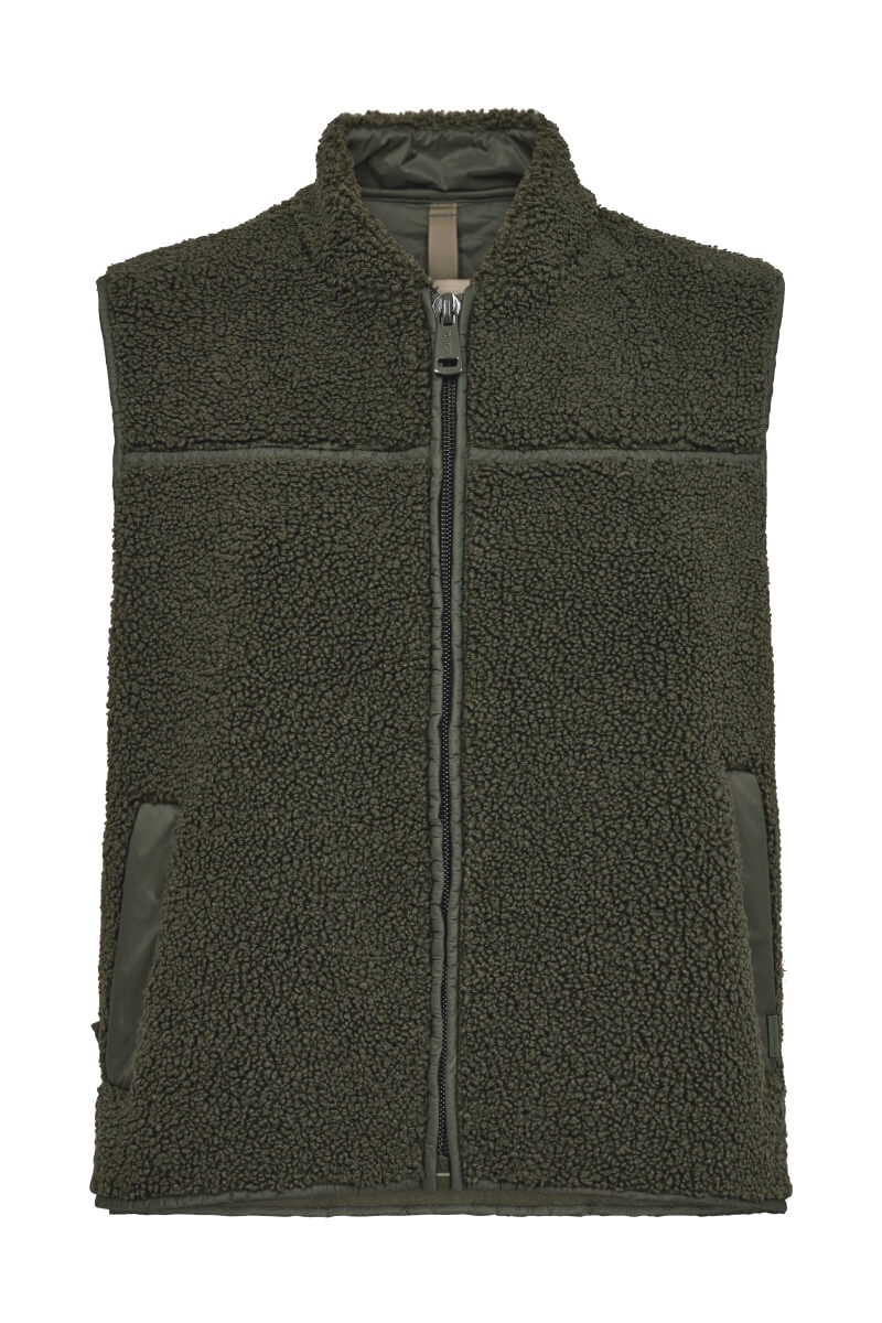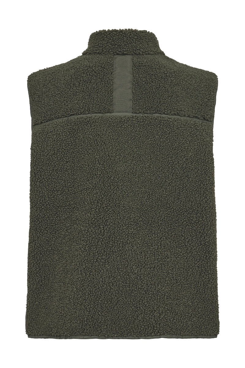 Teddyvästen i djup skogsgrön färg är din stilnyckel till lager-på-lager-look i höst. Bär den över en krispig skjorta eller under en oversized kappa. Kontrastera med bomull, denim eller stickat – texturen gör jobbet.Mjuk väst i fleece med fickor i sidan, två-vägs dragkedja fram, något hög krage, korta slitsar i sidan och rak passform från MosMosh.