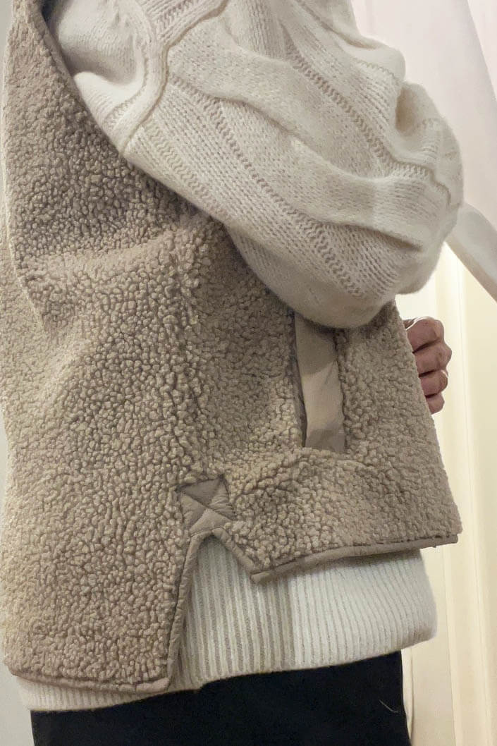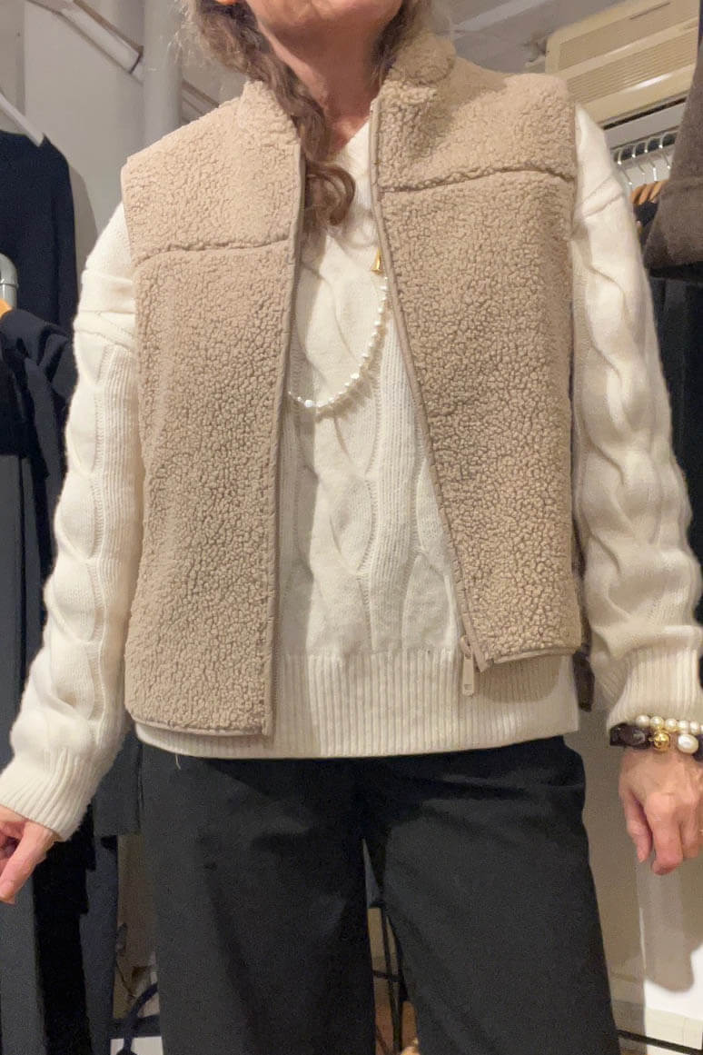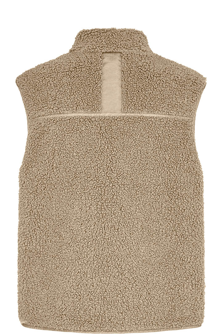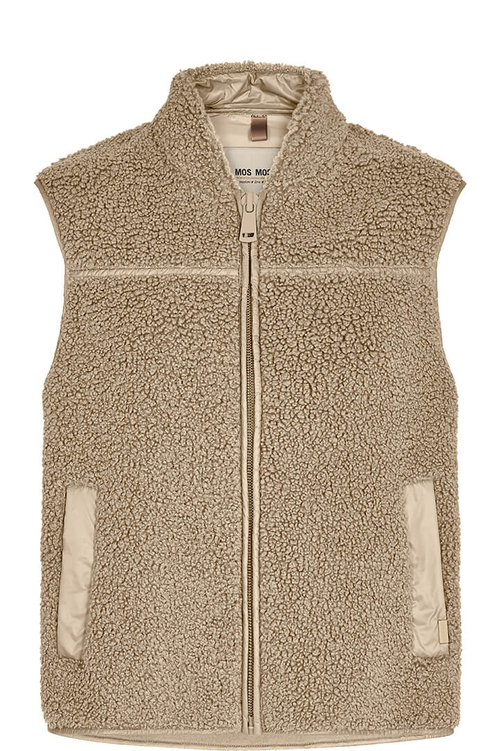 Teddyvästen i Creme-beige färg är din stilnyckel till lager-på-lager-look i höst. Bär den över en krispig skjorta eller under en oversized kappa. Kontrastera med bomull, denim eller stickat – texturen gör jobbet.Mjuk väst i fleece med fickor i sidan, två-vägs dragkedja fram, något hög krage, korta slitsar i sidan och rak passform från MosMosh.