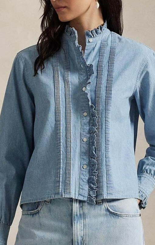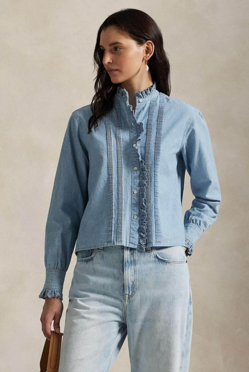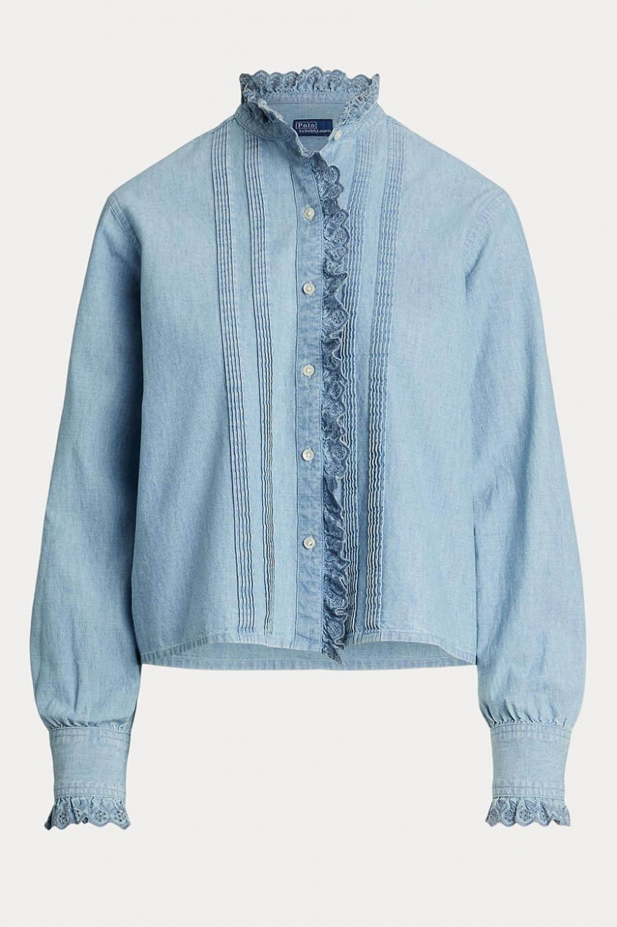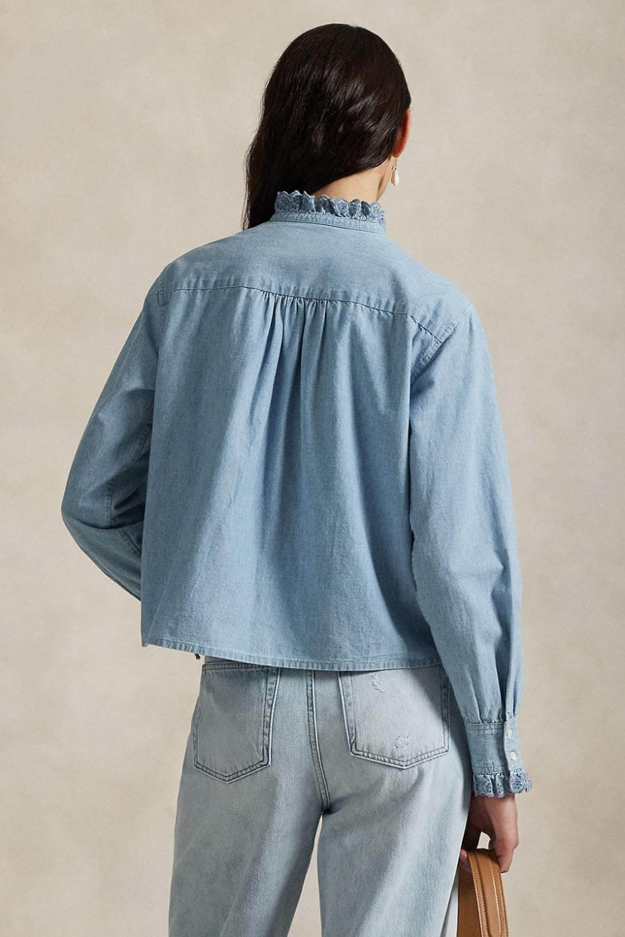 Tillverkad i japansk bomullschambray och dekorerad med broderade spetsdetaljer, volangkant och veckade detaljer framtill.