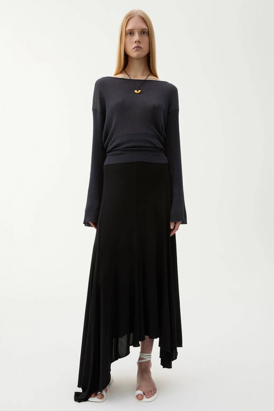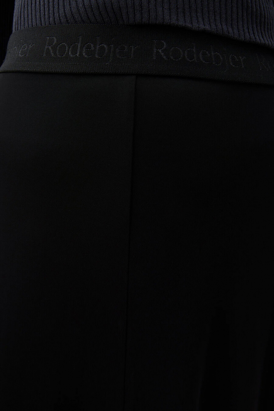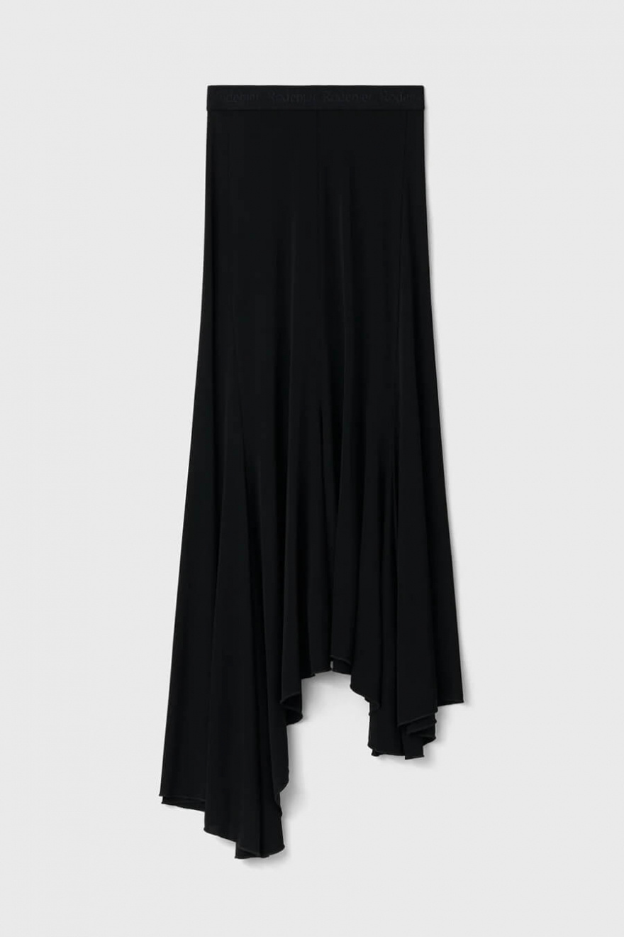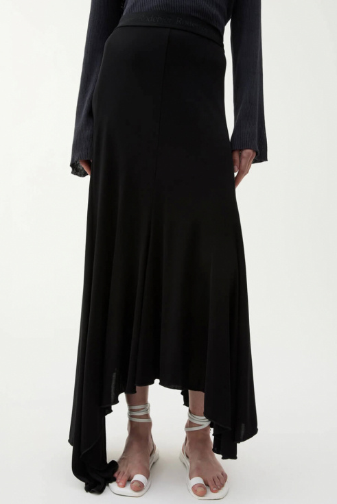 En svart viskoskjol som rör sig elegant i varje steg. Dess asymmetriska fåll och mjuka, flödande material skapar en dramatisk men enkel siluett. Perfekt att bära med allt från stickade tröjor till skräddarsydda skjortor för en tidlös look.Asymmetrisk kjol i viskos med A-formad, elastisk resår i midjan med logga från Rodebjer.