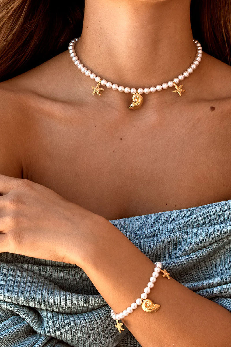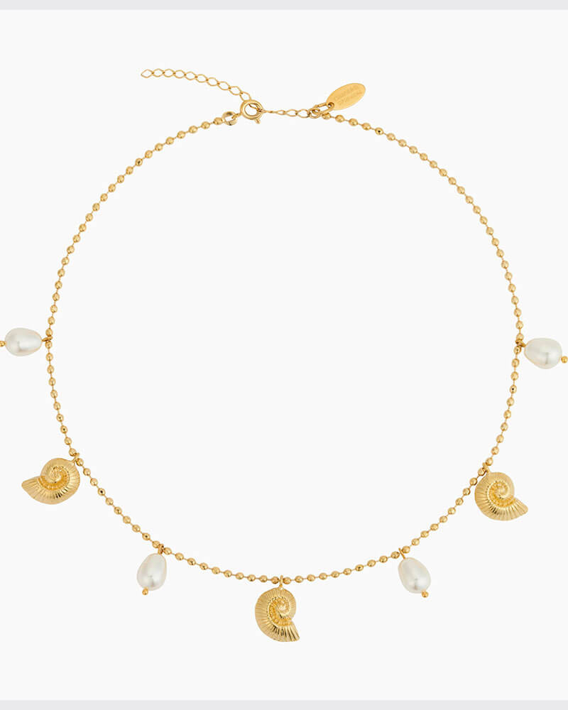 Säsongens finaste halsband. Seadora Necklace!De fina snäckmotiven och de skimrande Swarovski® pärldropparna skapar ett uttryck som känns lekfullt och elegant. Bär det ensamt för en ren, harmonisk look eller kombinera det med andra halsband för en mer uttrycksfull havsinspirerad stil.