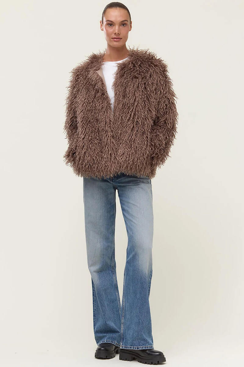 Jacka i fuskpäls utan krage och med dold knäppning från Hollies. En mer tunn variant som fungerar fint mellansäsonger. Lika fin i vår som höst.- Normal i storlek, lös passform