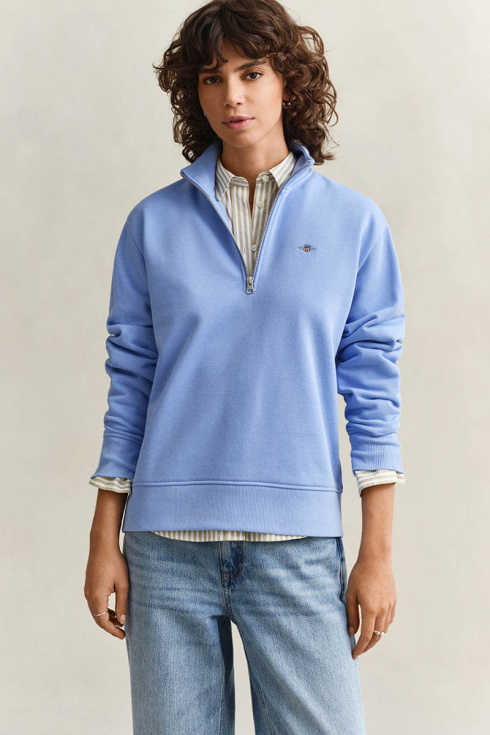 Denna half-zip sweatshirt från GANT är ett mångsidigt basplagg, tillverkat i en mjuk bomullsblandning med en behaglig, borstad fleeceinsida. Designad med en avslappnad silhuett och utrustad med en stilren metallzip, ribbade muddar och nederkant samt en broderad sköldlogga på bröstet som signaturdetalj.