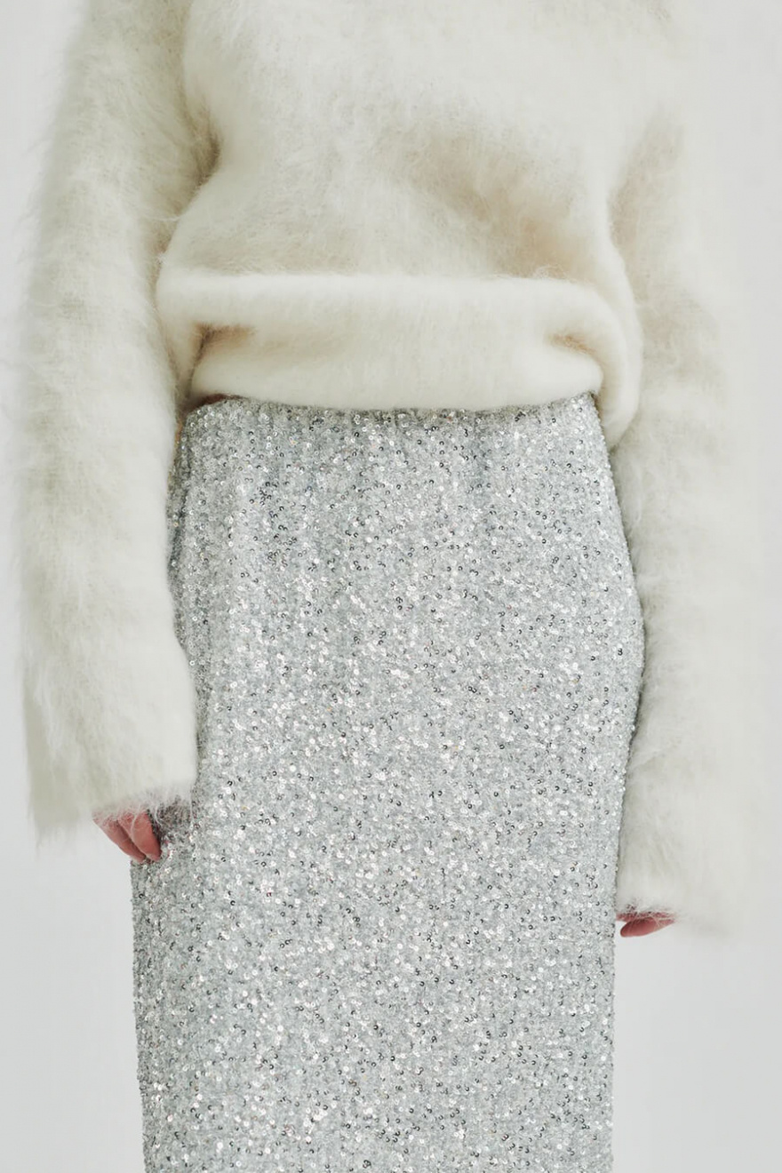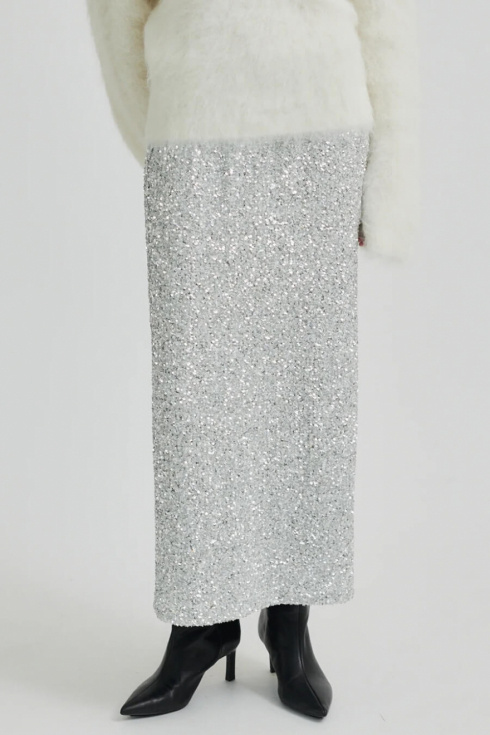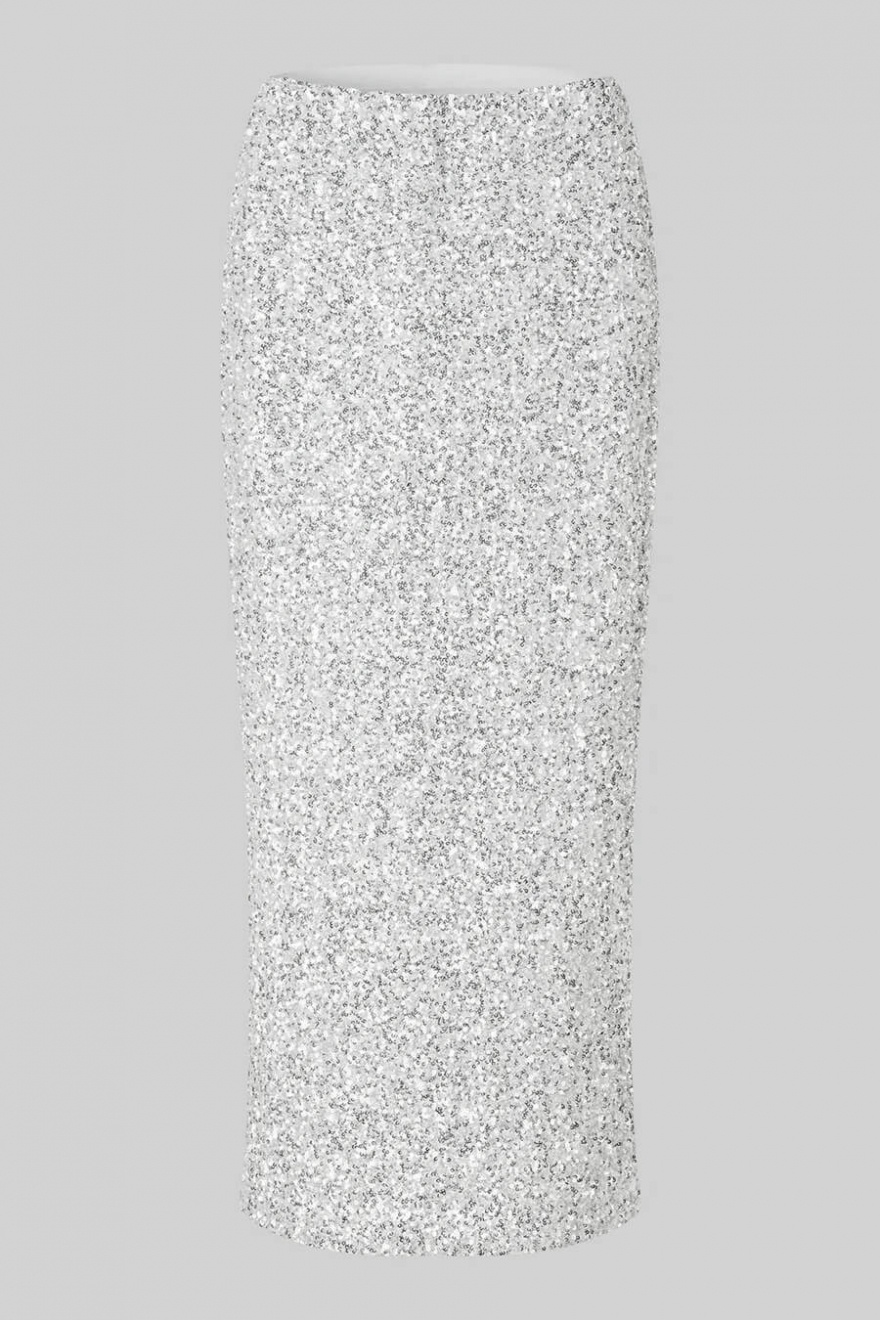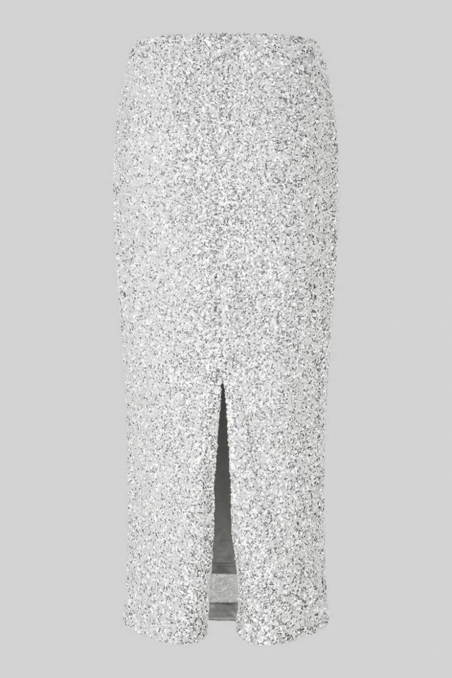 Låt din outfit stråla med en kjol täckt av silvriga paljetter – den ultimata festkjolen! Perfekt för nyår, middagar och alla tillfällen där du vill glänsa lite extra. Bär den med en enkel topp och låt kjolen göra jobbet.Maxikjol med paljetter, slits bak, hög midja och rak passform från Second Female.
