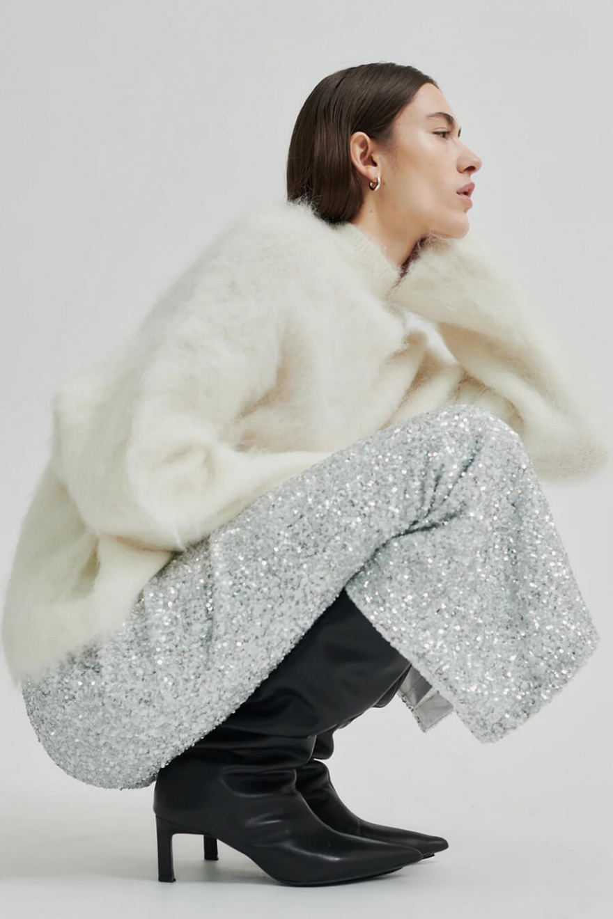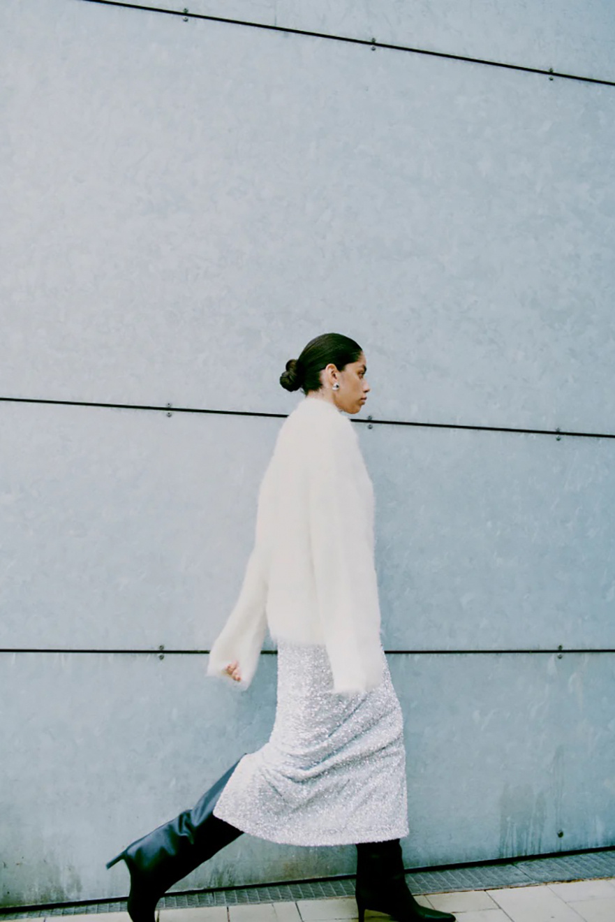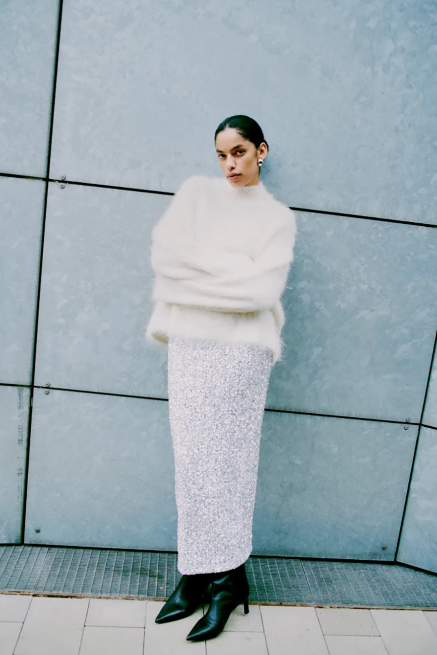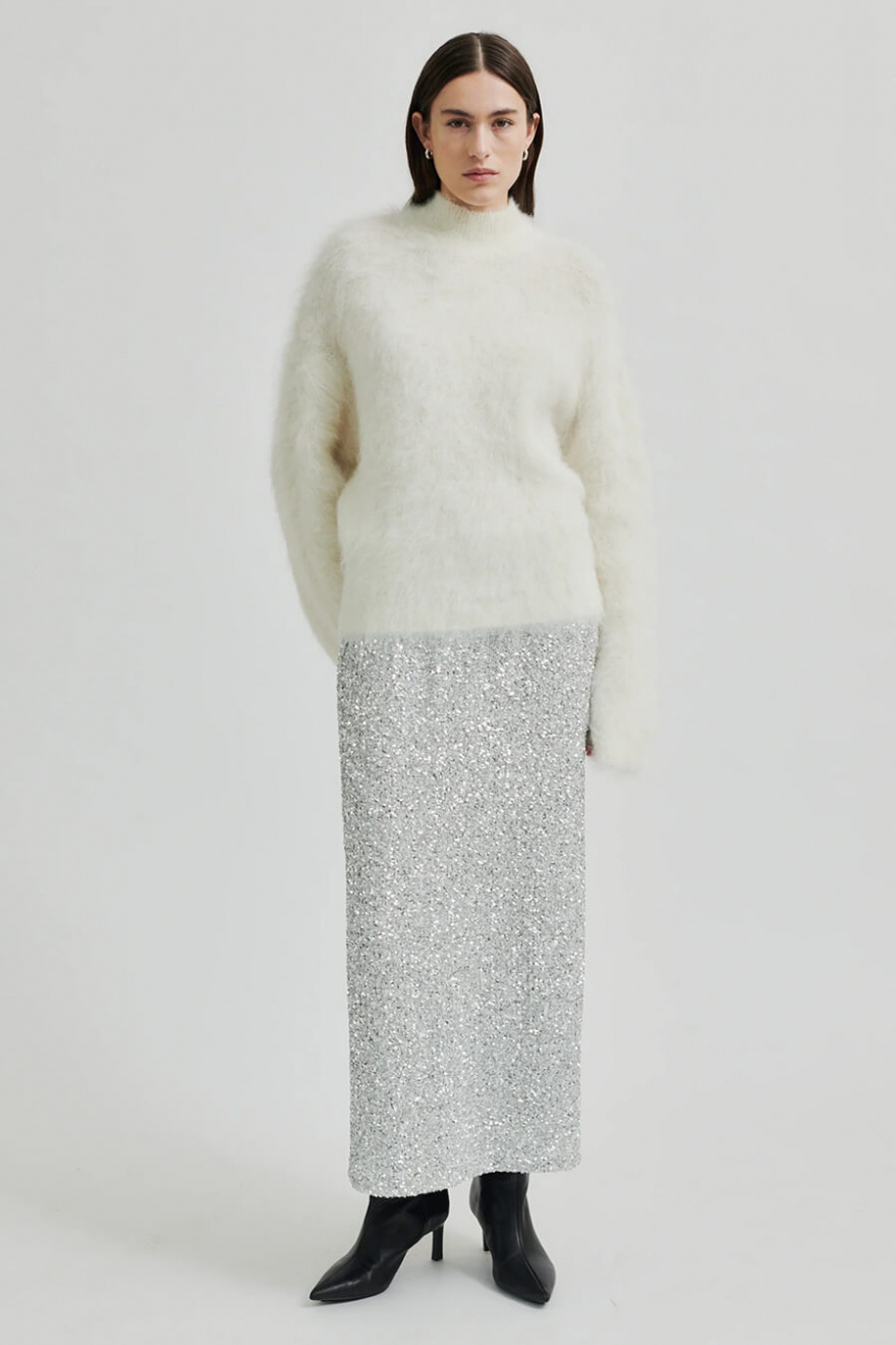 Låt din outfit stråla med en kjol täckt av silvriga paljetter – den ultimata festkjolen! Perfekt för nyår, middagar och alla tillfällen där du vill glänsa lite extra. Bär den med en enkel topp och låt kjolen göra jobbet.Maxikjol med paljetter, slits bak, hög midja och rak passform från Second Female.