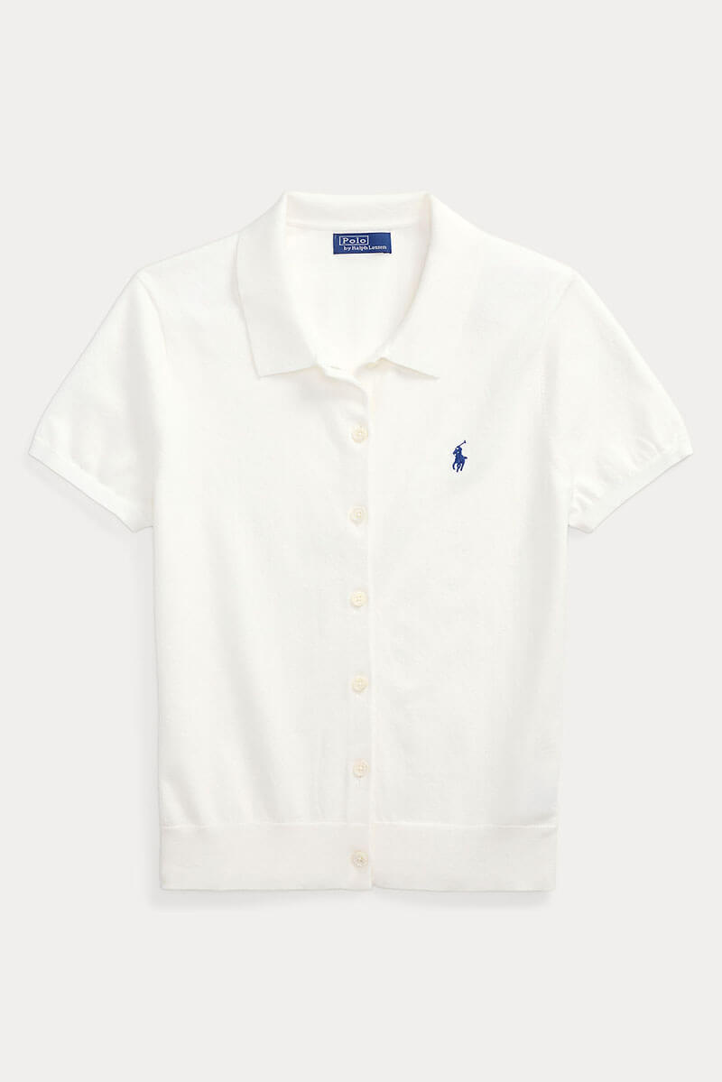 Tidlös elegans möter modern enkelhet – denna vita kortärmade kofta i mjuk bomull är det perfekta nyckelplagget för garderoben. Bär den med jeans eller kjol för en avslappnat chic look.Kofta i en mjuk bomullsblandning med korta ärmar, krage, ribbstickade kanter, smal passform, stängs med knappar fram och liten broderad logga fram från Polo Ralph Lauren.