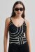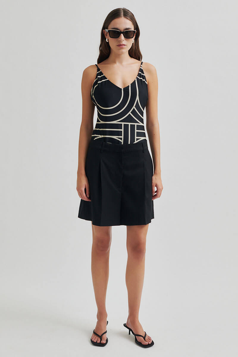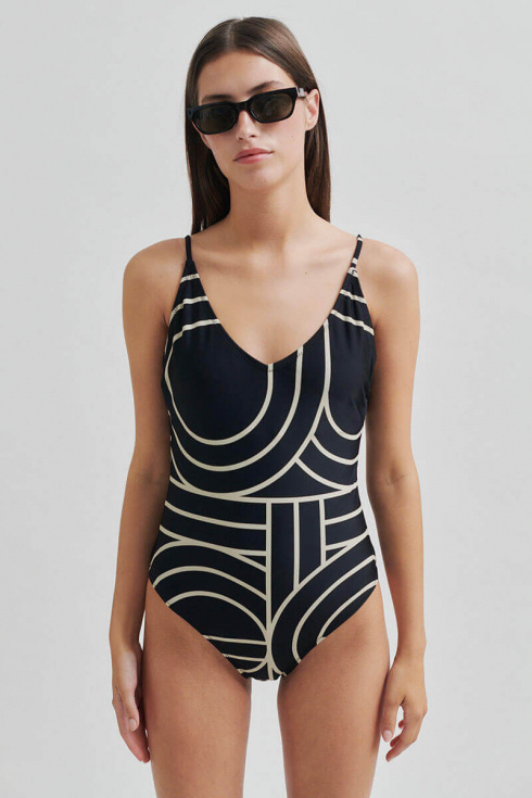 En svart baddräkt med beiga ränder som smickrar i varje vinkel. Klassisk men med en twist, och justerbara axelband för perfekt passform. Lika snygg vid poolen som under en linneskjorta på väg till lunch.Baddräkt med smala justerbara axelband, v-ringning, vadderade kupor och normal passform från Second Female.