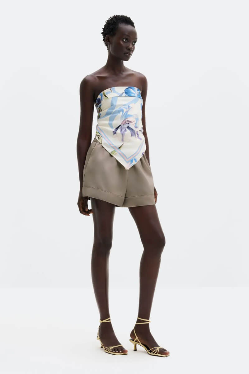 En mångsidig scarf i högkvalitativ silkestwill. Storleken gör att den kan bäras på flera sätt: runt halsen, som en håraccessoar eller knuten som en dekorativ topp.