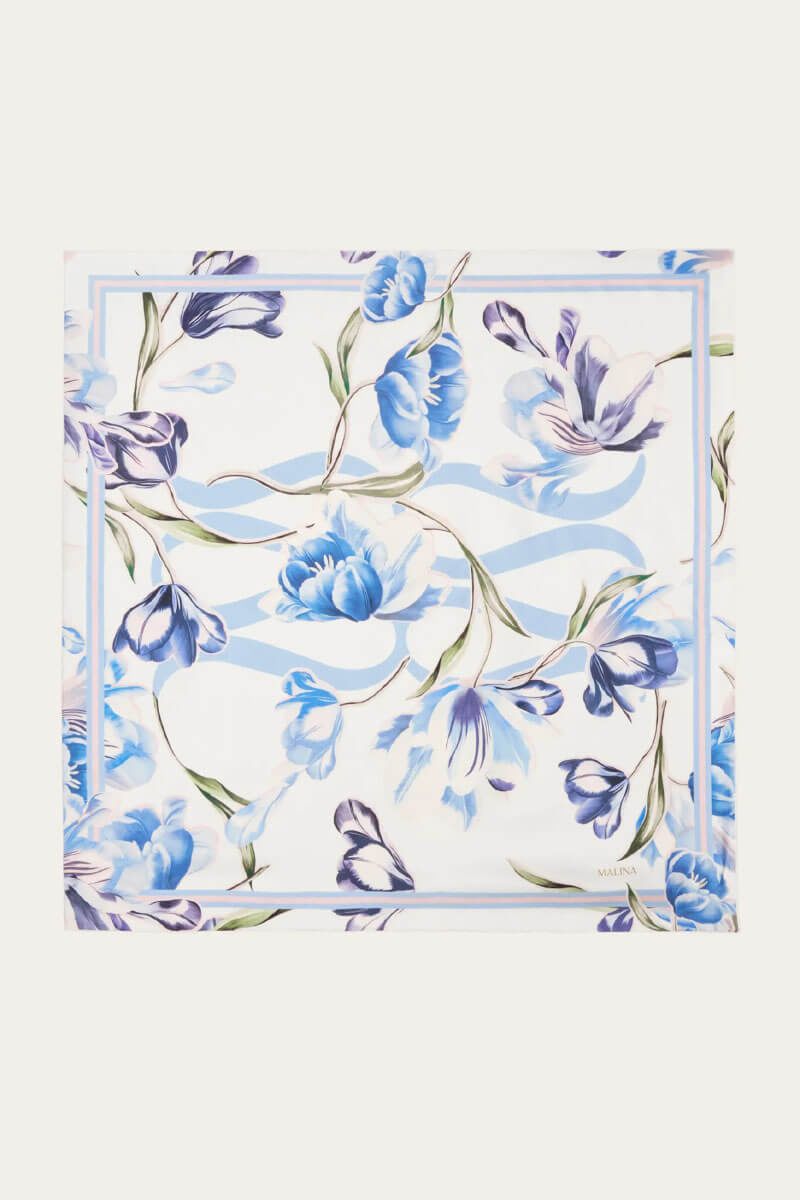 Kvadratisk scarf med detaljerat mönster och en lyxig finish från By Malina.