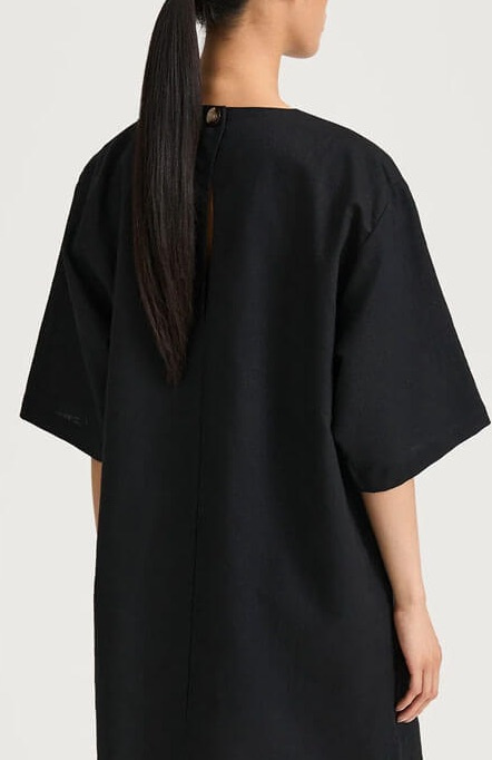 Designen har armbågslånga ärmar och en rund halsringning som ger ett klassiskt och sofistikerat uttryck. Klänningen är fodrad för extra komfort och avslutas med noggrant sydda toppstickningar som ger en minimalistisk och exklusiv finish.