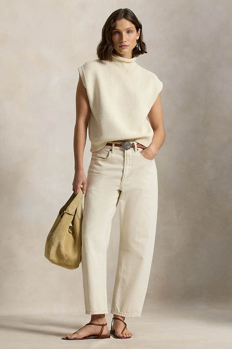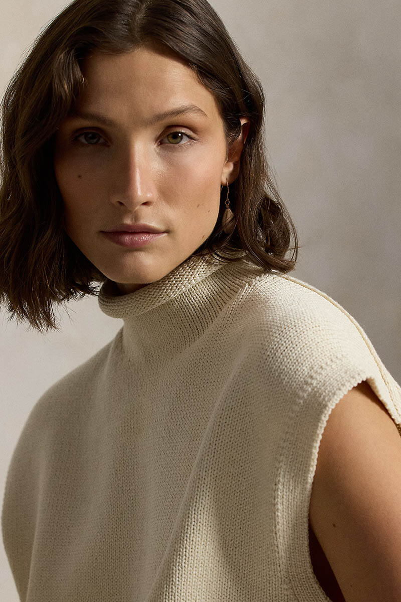 Stickad i grov lyxig bomullskvalitet som är framtagen för mjukhet, slitstyrka och en lyster.Den här ärmlösa tröjan har en avslappnad silhuett och en polokrage med rullad kant.