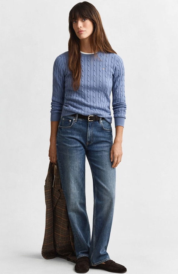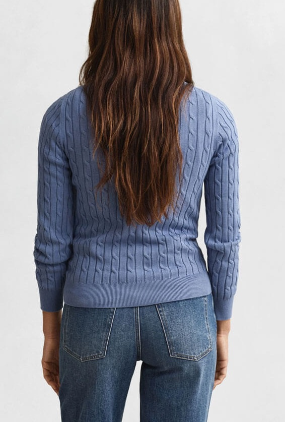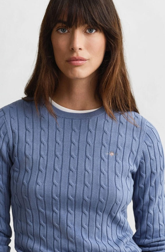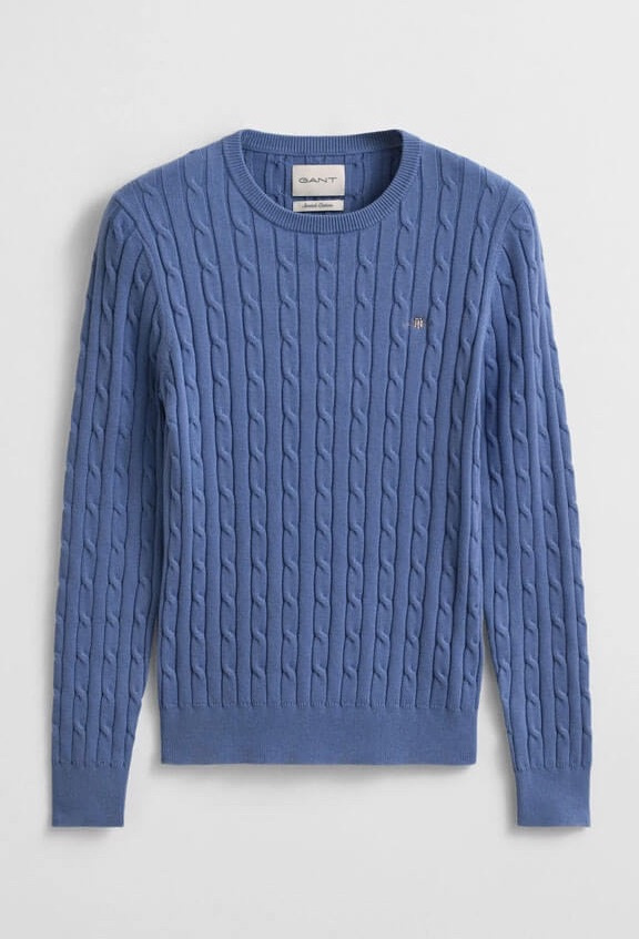 Den kabelstickade tröjan är en klassiker inom American Sportswear.Den har sitt ursprung på Aranöarna och bland de irländska fiskarna, men älskas nu av allt ifrån Hollywoodstjärnor till internatskoleelever runt om i världen. Gants version går i en mjuk bomulls- och elastanblandning, med slim och stretchig fit, klassisk rund halsringning, ribbstickade detaljer och vår klassiska sköldlogo broderad på bröstet.