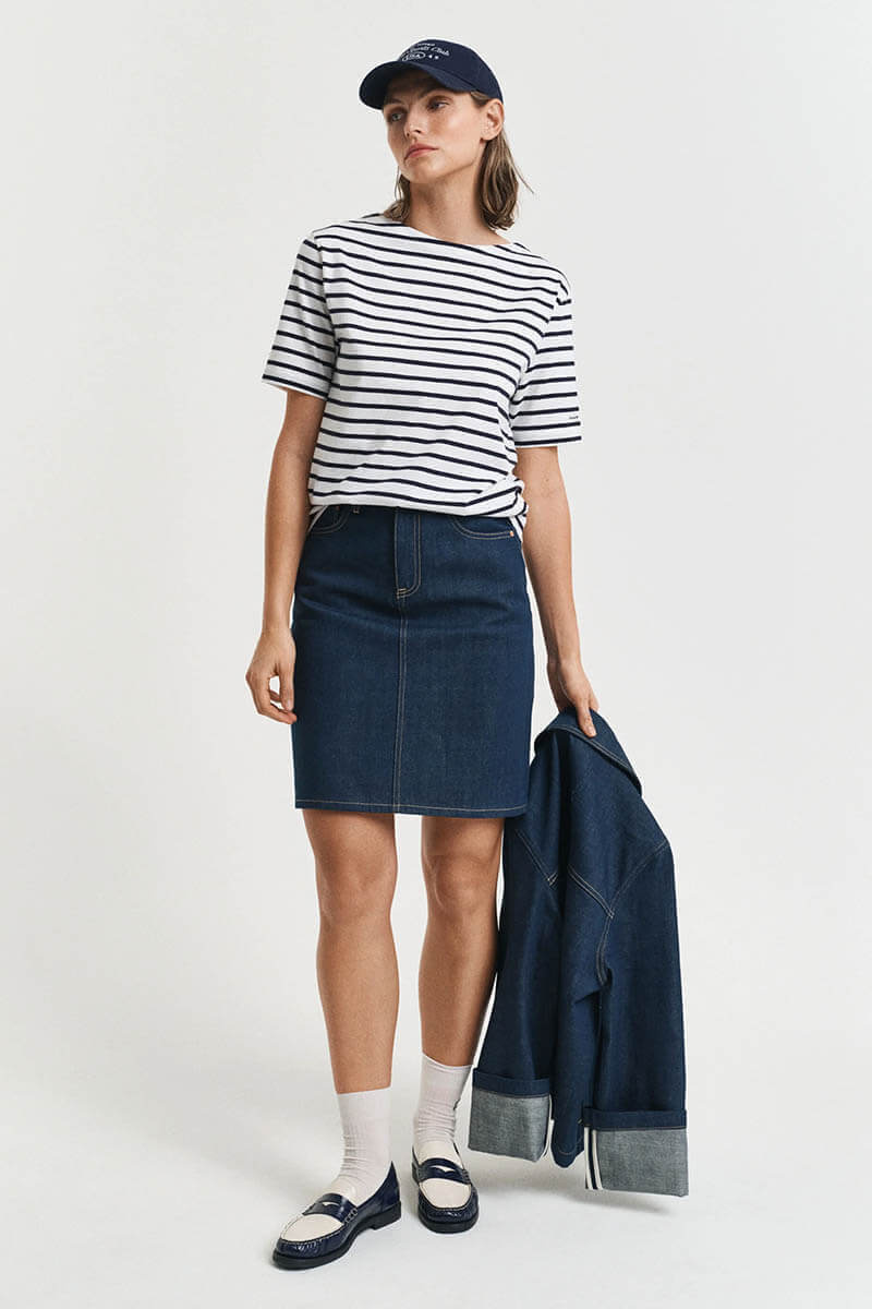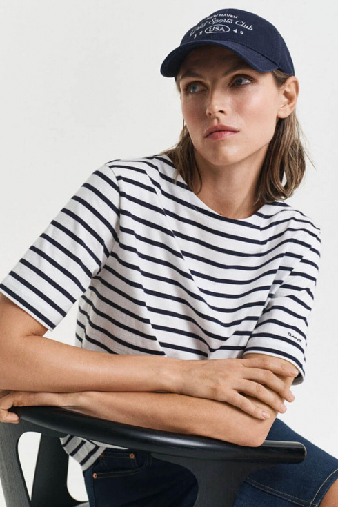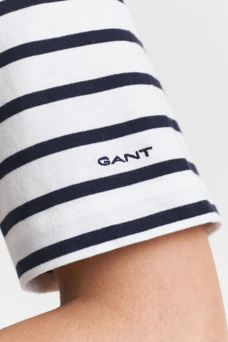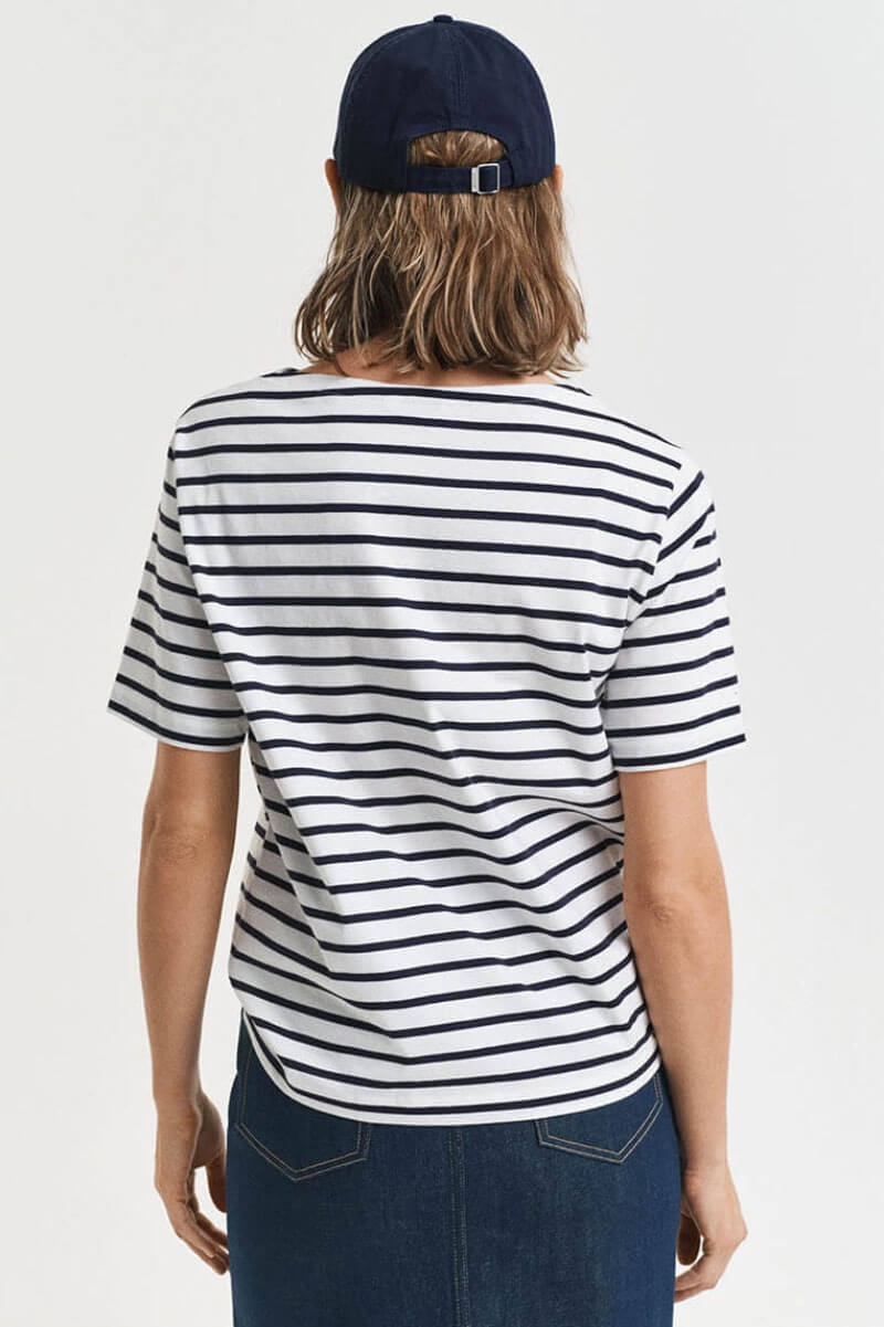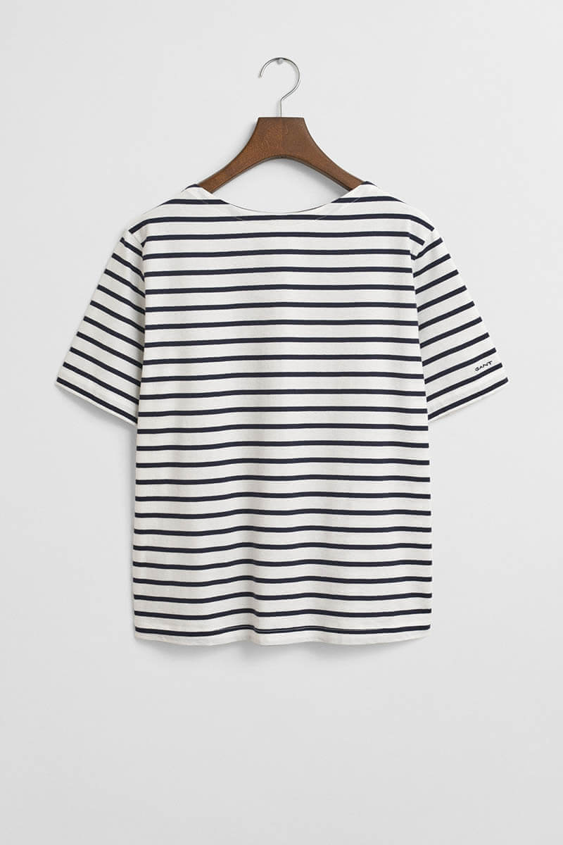 Randigt är alltid rätt. Denna marina topp är sommarens mest användbara plagg – stilren, tidlös och gjord för dagar i solen. Kombinera med denim eller linnebyxor. En självklar garderobsfavorit!Randig topp i bomull med båtringning, avslappnad passform, korta ärmar med borderad logga från Gant.